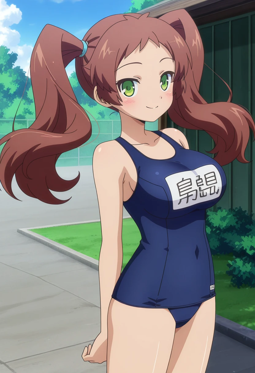 hair tie, blue one-piece swimsuit, school swimsuit, name tag,