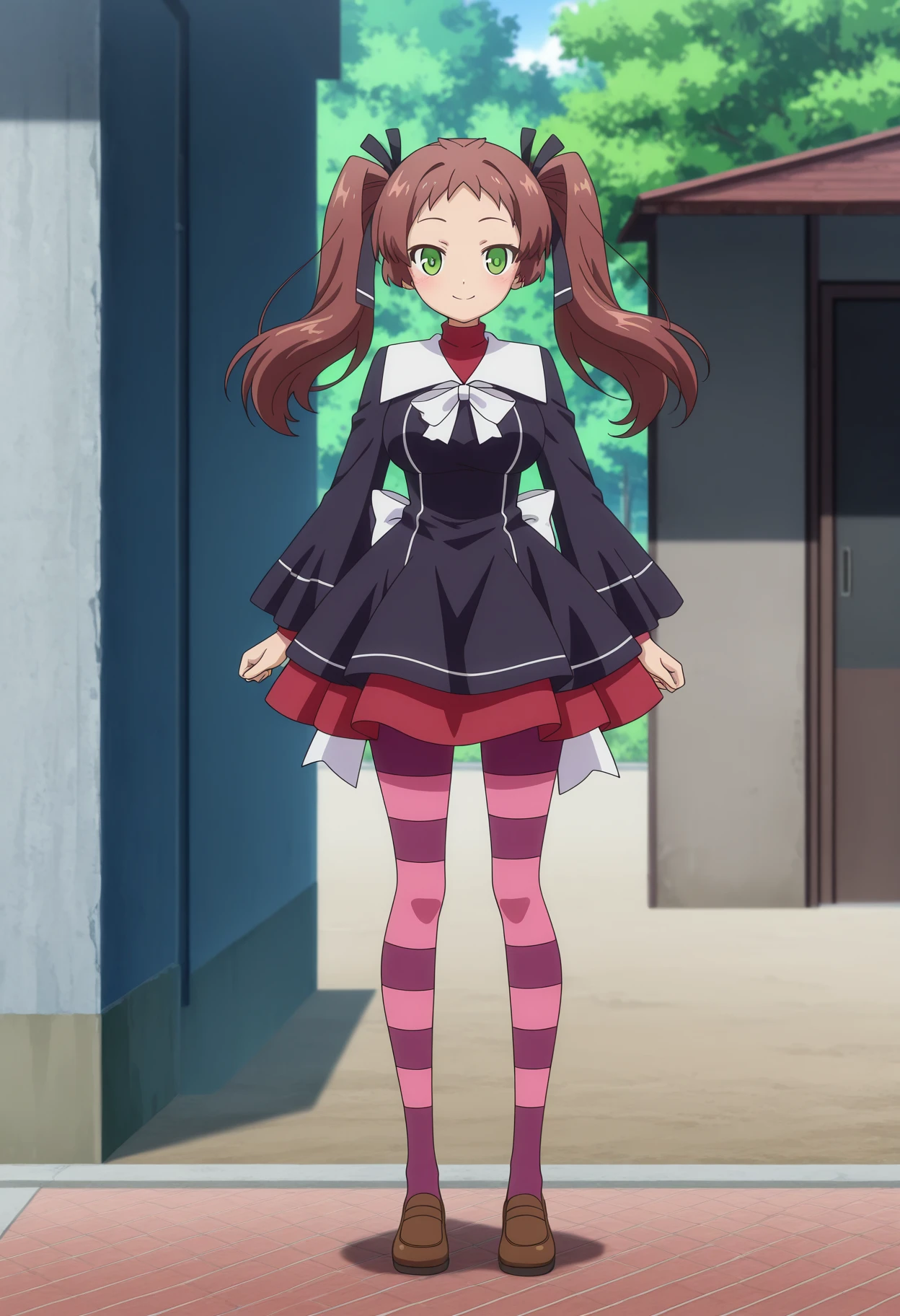 • hair ribbon, black ribbon, hazuki costume, turtleneck, white collar, white bow, black dress, red skirt, long sleeves, striped pantyhose, purple pantyhose, pink pantyhose, loafers,