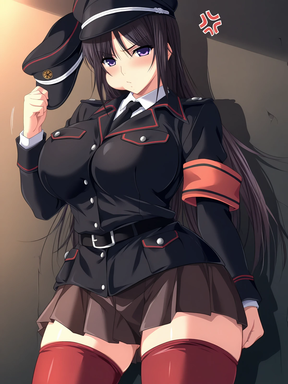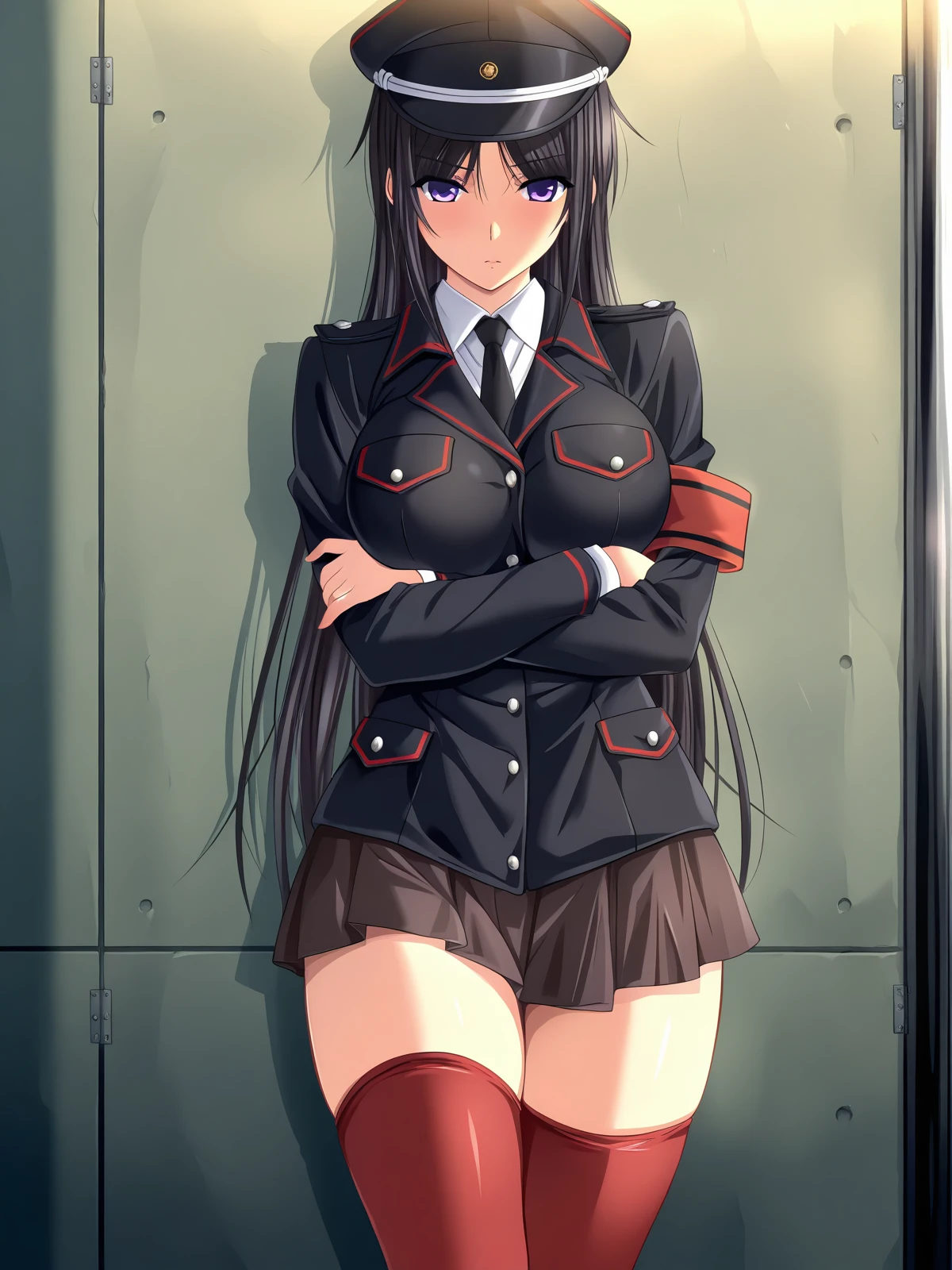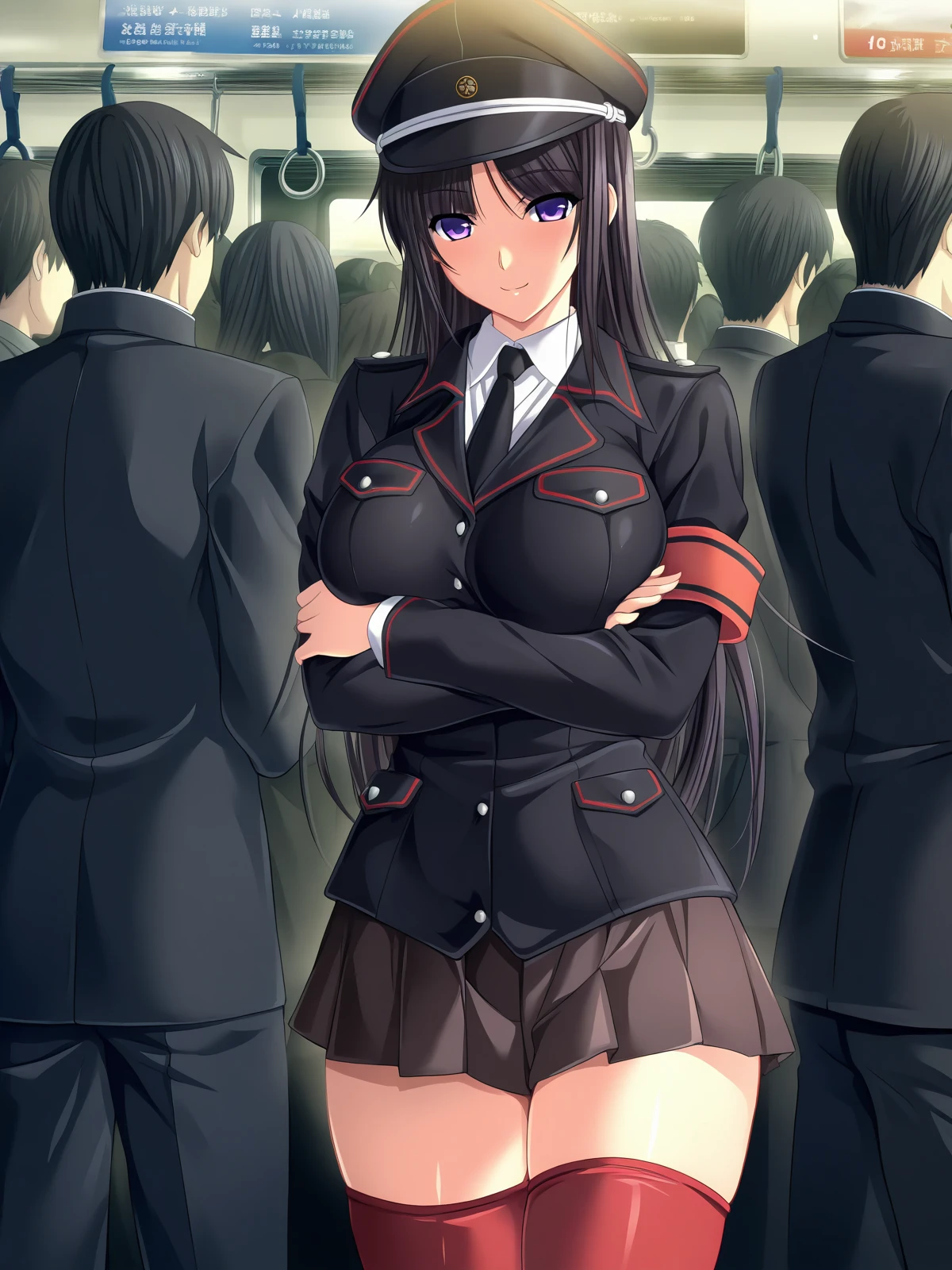 1girl,solo,red thighhighs,long hair,hat,black hair,uniform,skirt,necktie,purple eyes,armband,crossed arms,military uniform,peaked cap,large breasts,military,rin\(Saishuu Chikan Densha 3\),looking at viewer,standing,
