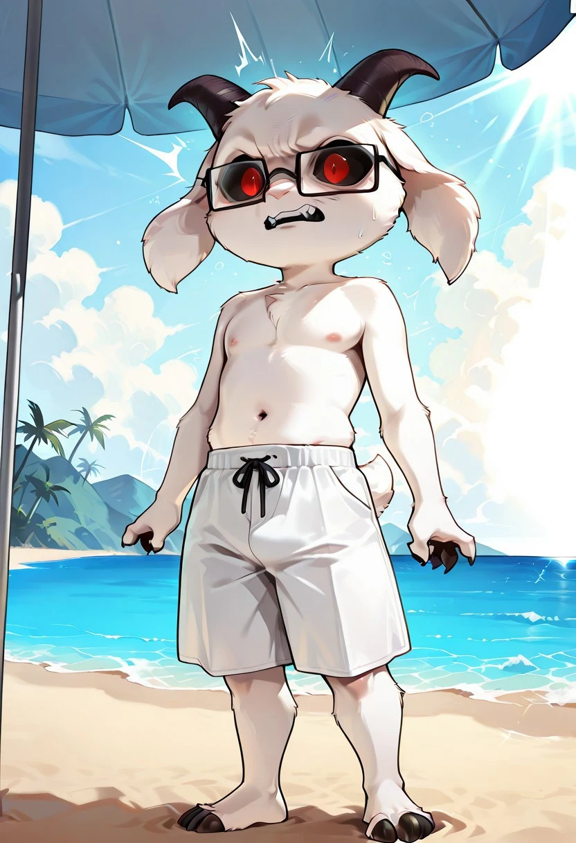 1boy,shortstack,anthro,Paul,dokkaebi,red eyes,black sclera,white fur,goat ears,horns,furry,