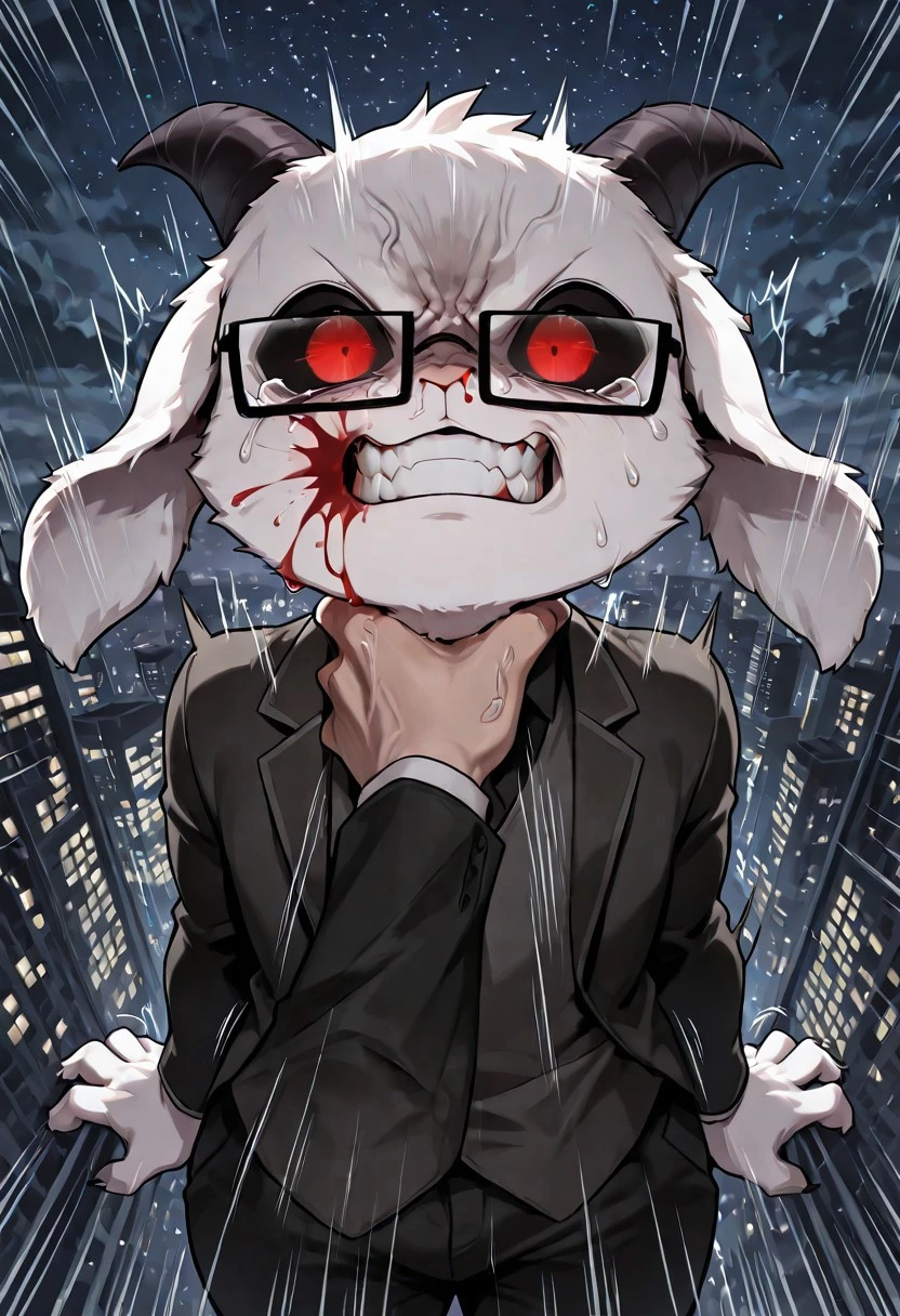 Also: Suit,necktie, black necktie,black-framed eyewear,glasses,fangs,teeth,evil smile,angry,