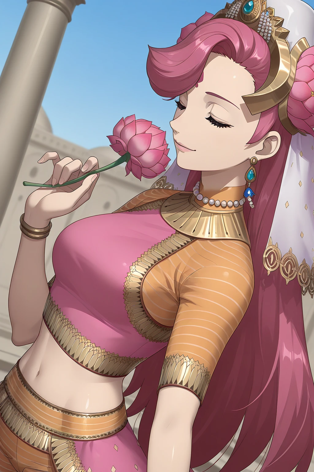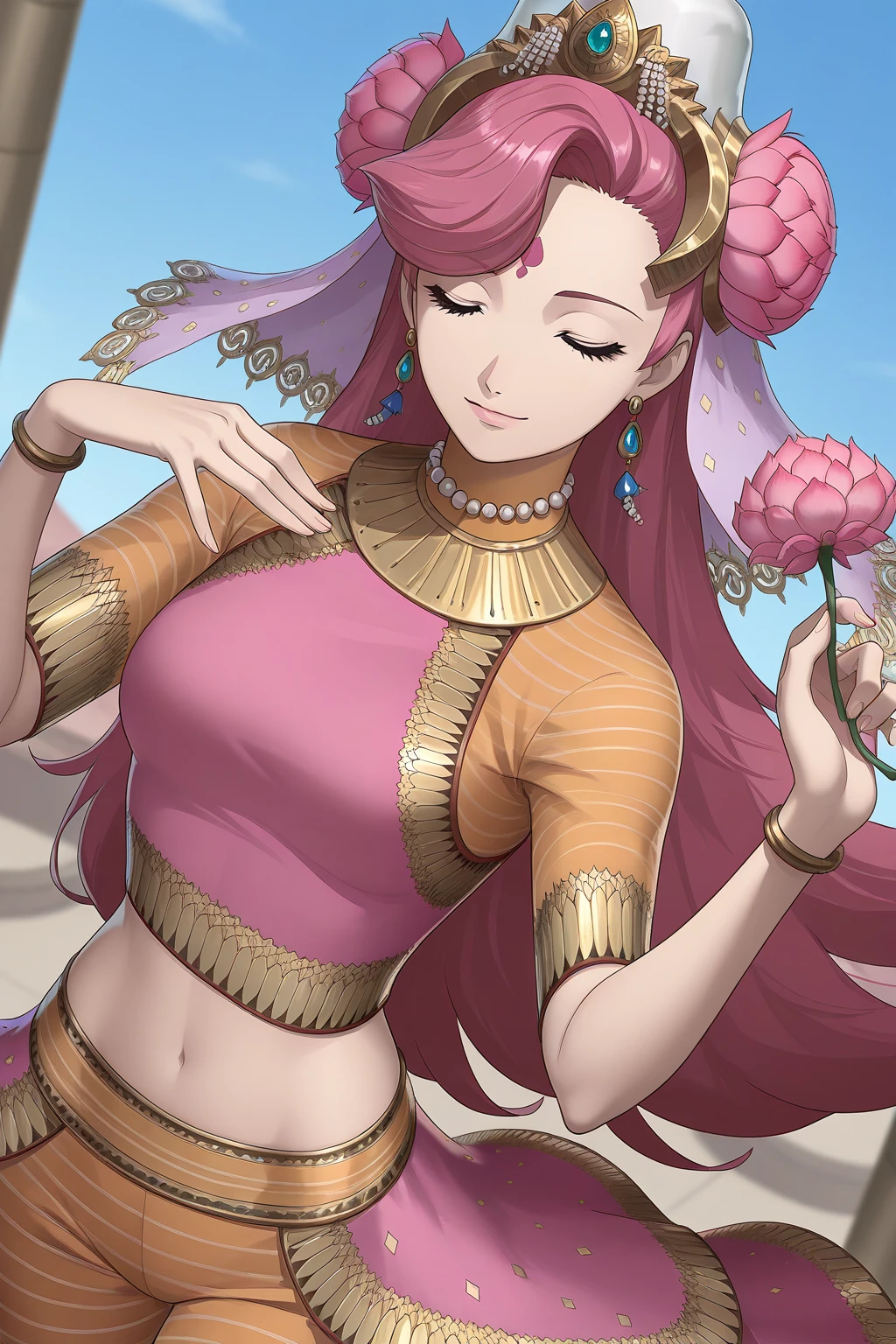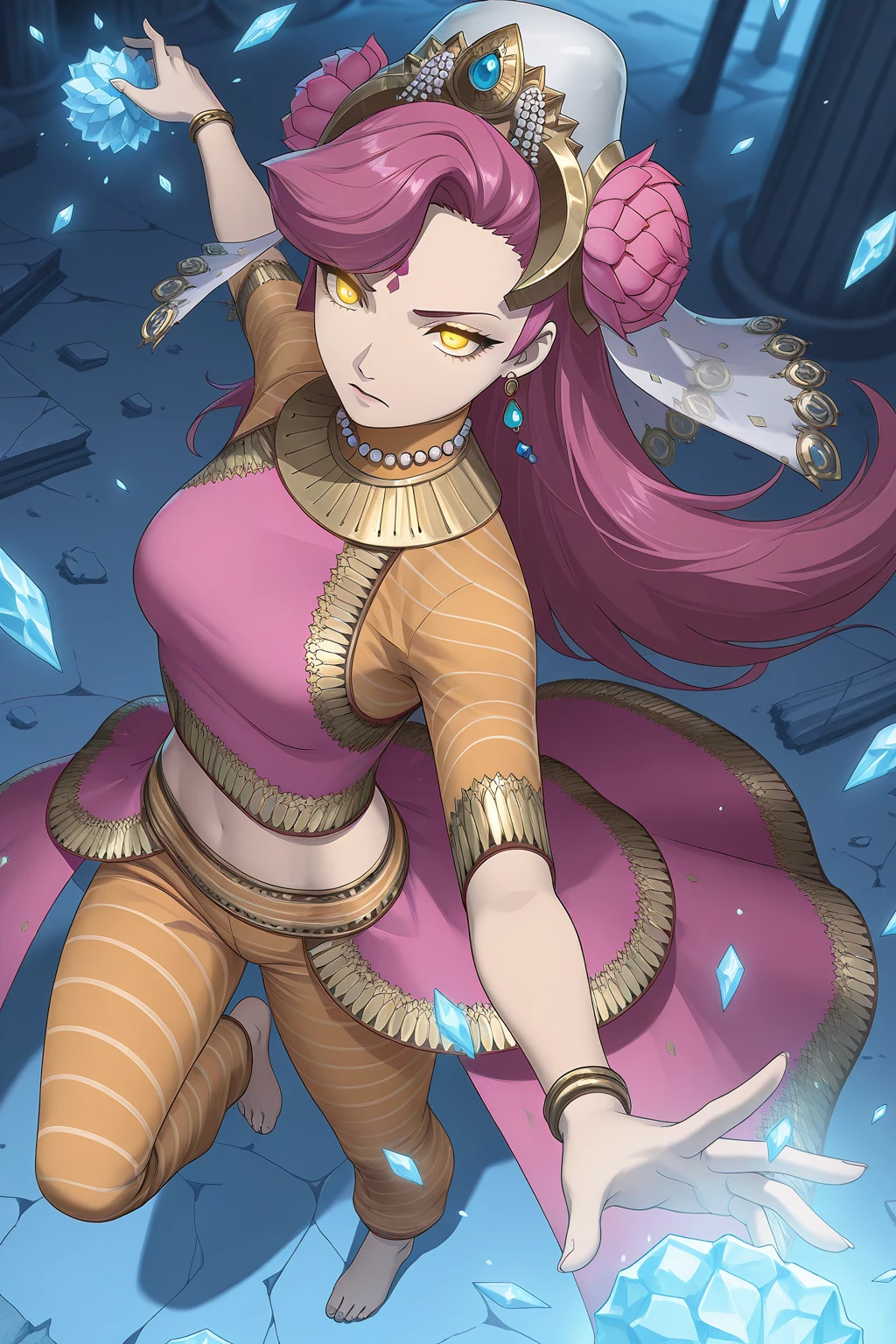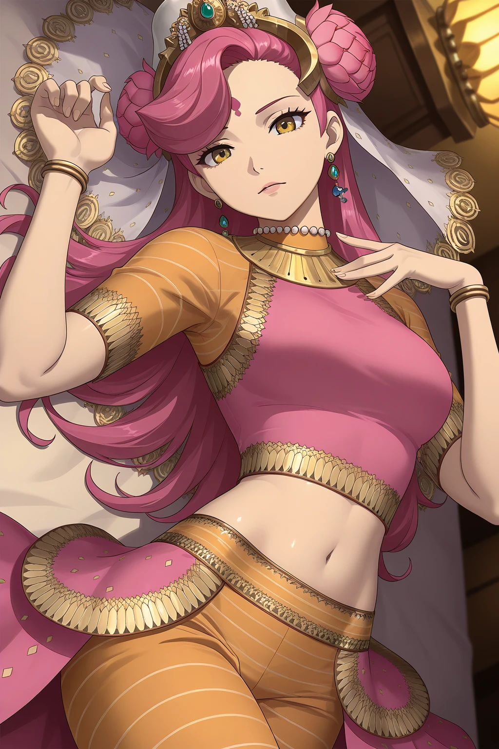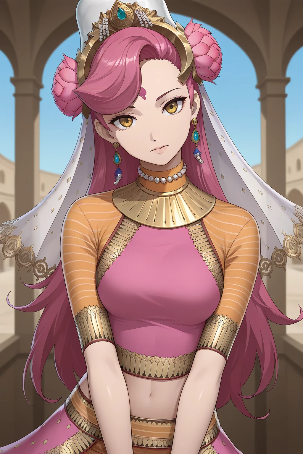 PVSMT, long hair, pink hair, asymmetrical bangs, bindi, yellow eyes, breasts, midriff, navel, headdress, hair flower, white veil, see-through, crystal earrings, orange collar, striped clothes, pearl necklace, pink shirt, crop top, fringe trim, gold trim, short sleeves, orange sleeves, bracelet, overskirt, pink skirt, orange pants, barefoot