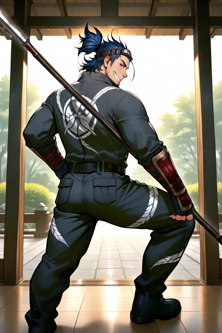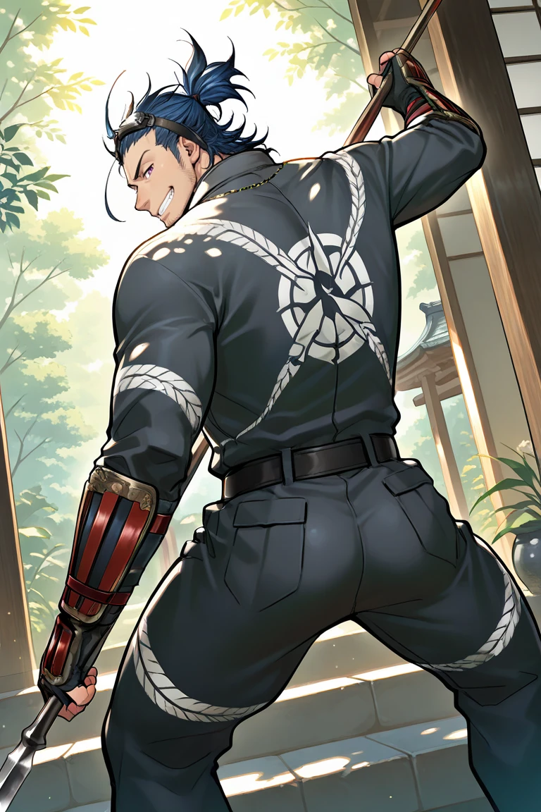 Wear1 :tattoo,jumpsuit,bodysuit,long sleeves,japanese armor,arm guards,fingerless gloves,goggles on head,black footwear,necklace,belt,