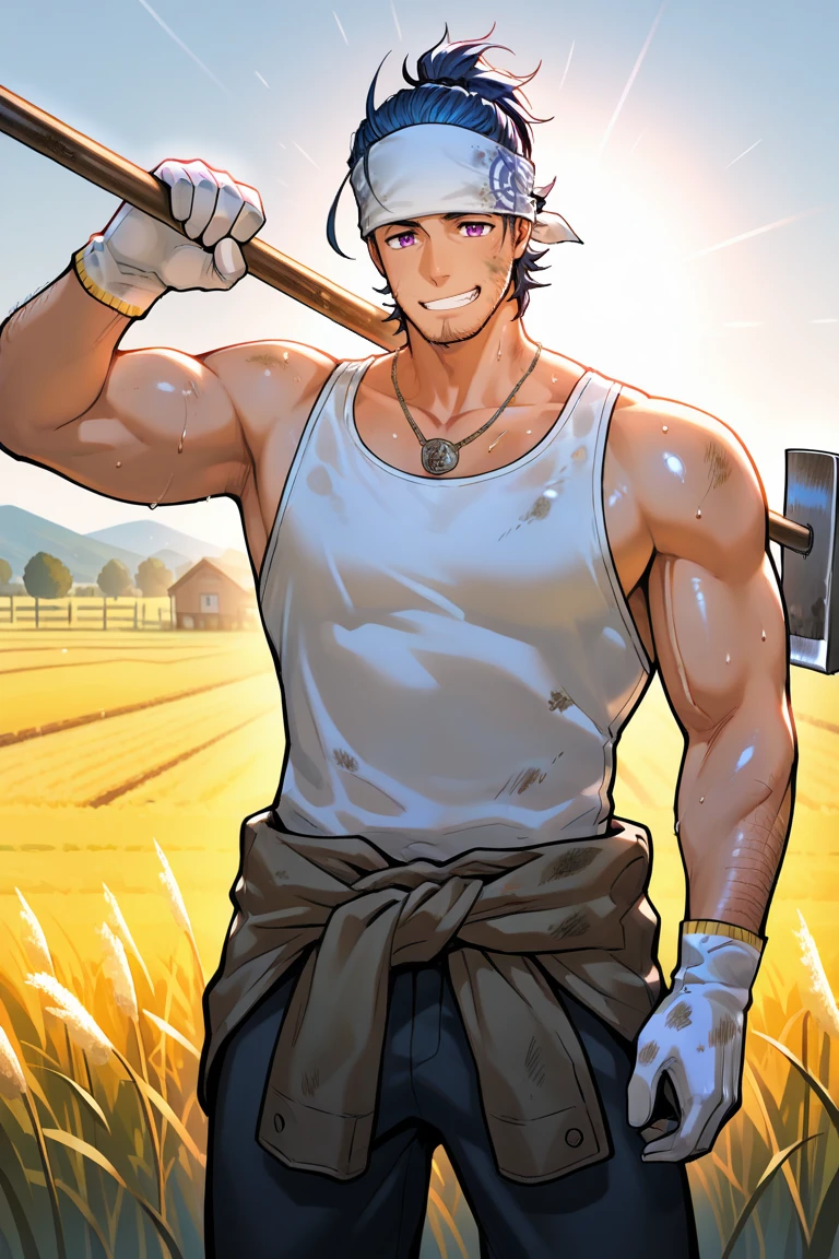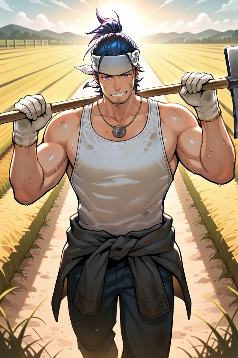blue hair,purple eyes,facial hair,stubble,ponytail,