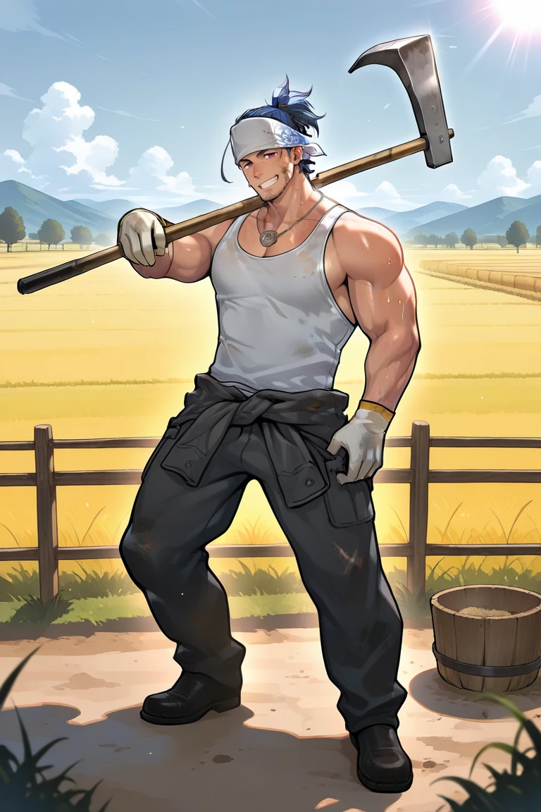 Wear2 : white tank top,clothes around waist,bandana,headband,white gloves,black footwear,necklace,dirty,