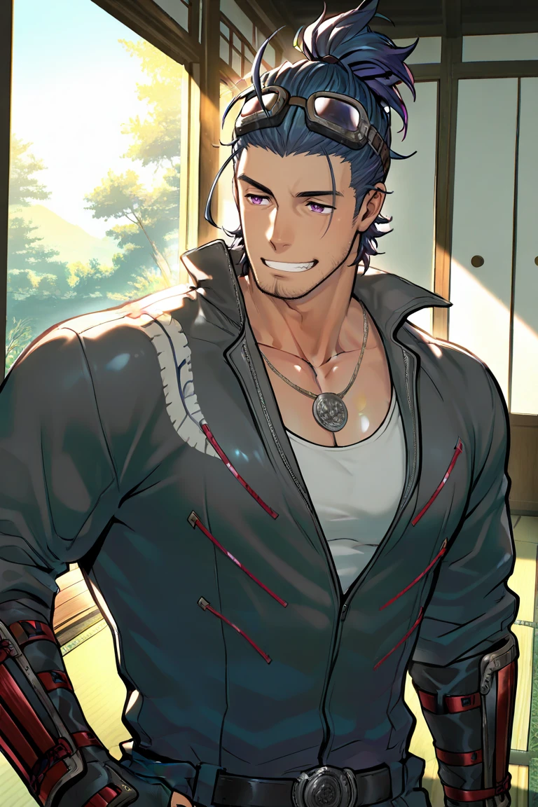 tattoo,jumpsuit,,long sleeves,japanese armor,arm guards,fingerless gloves,goggles on head,black footwear,necklace,belt,