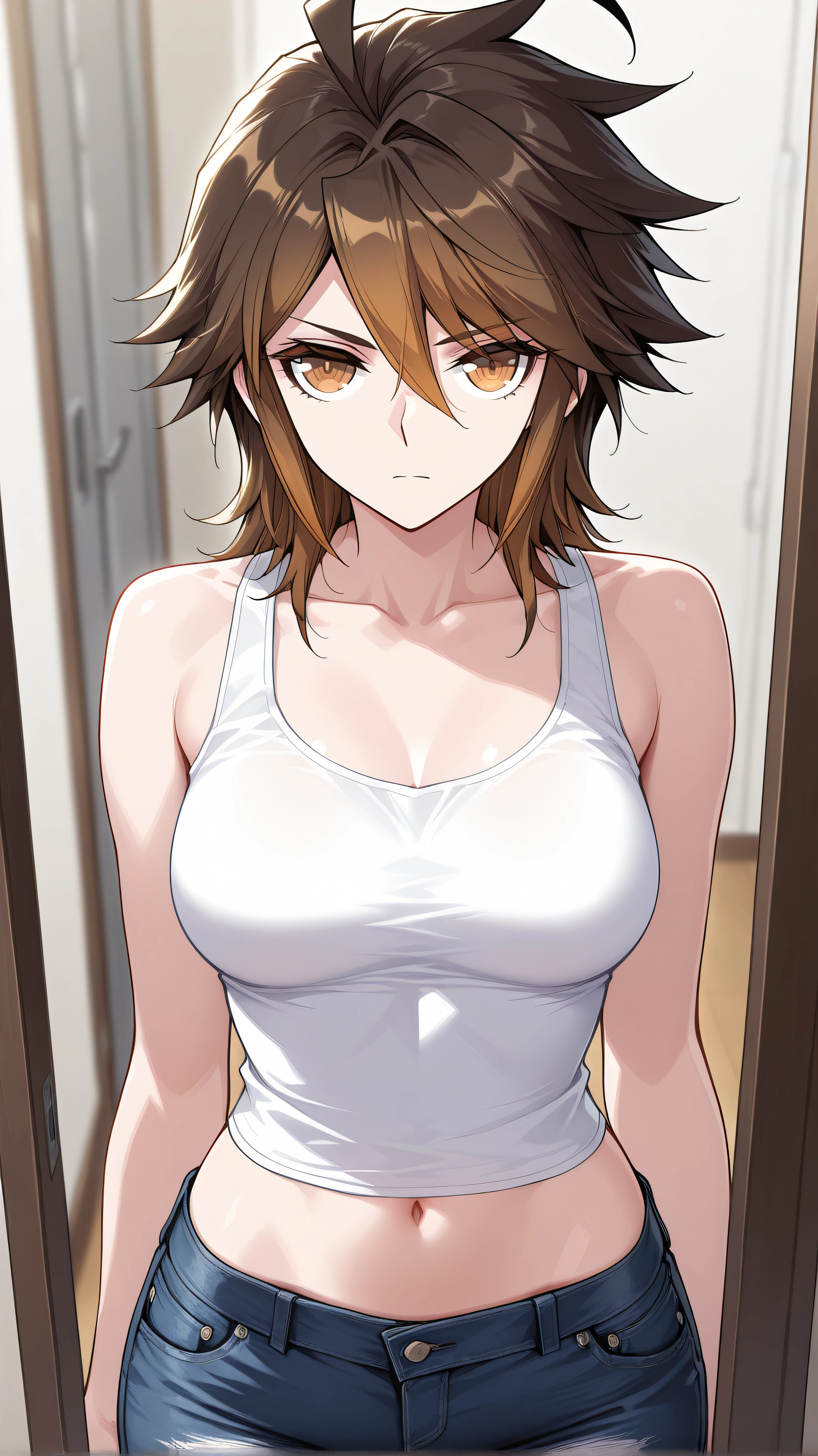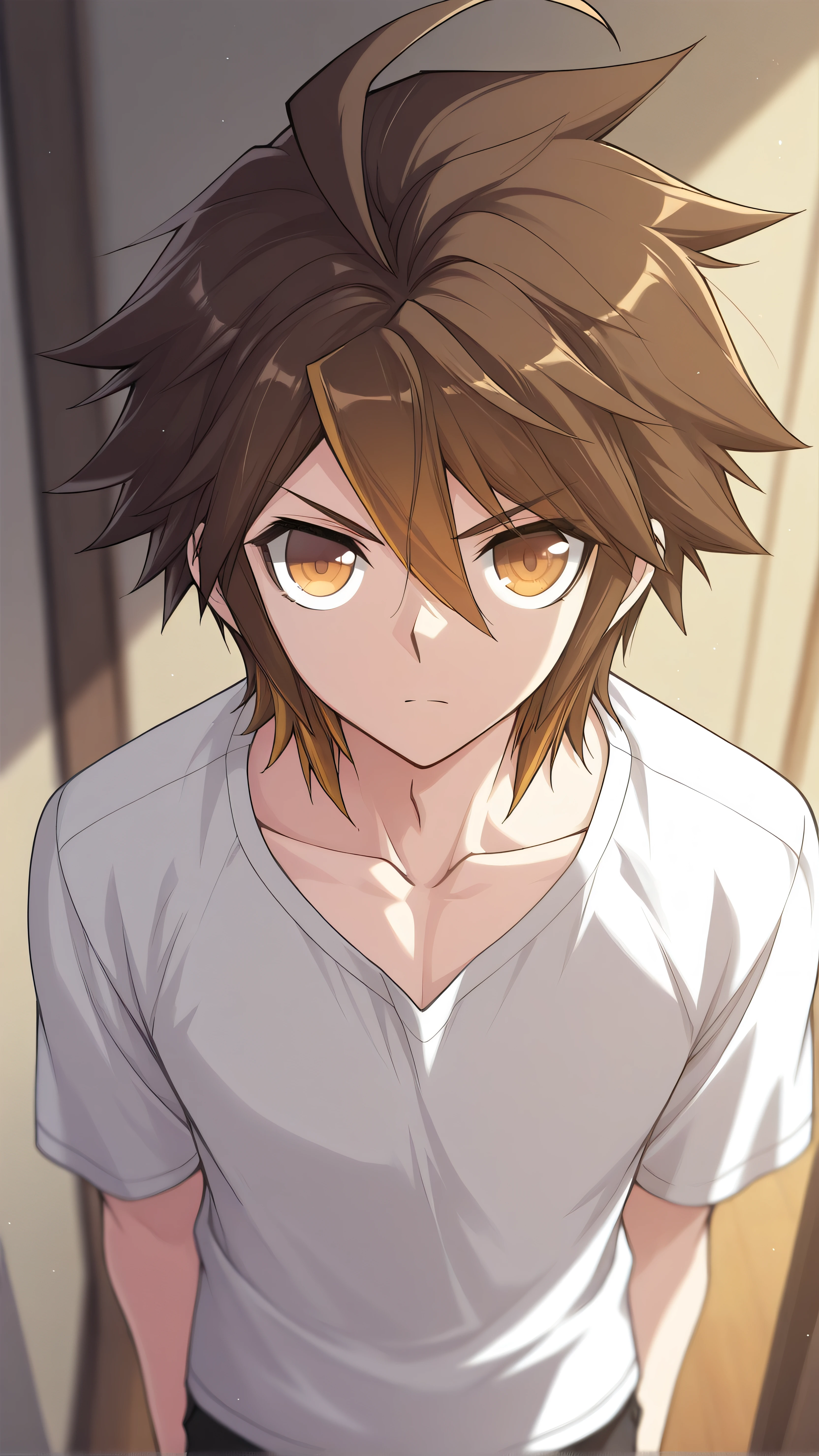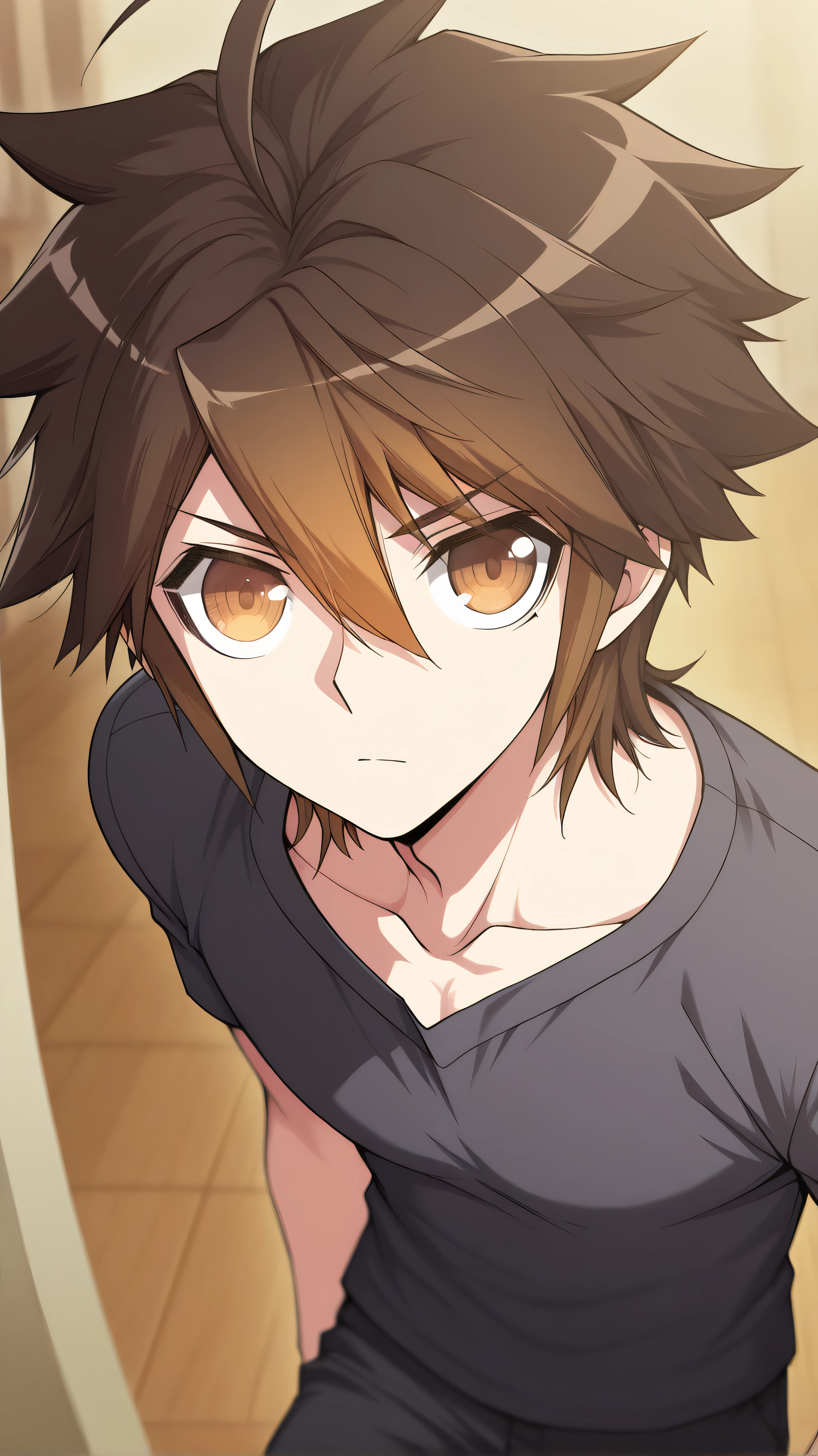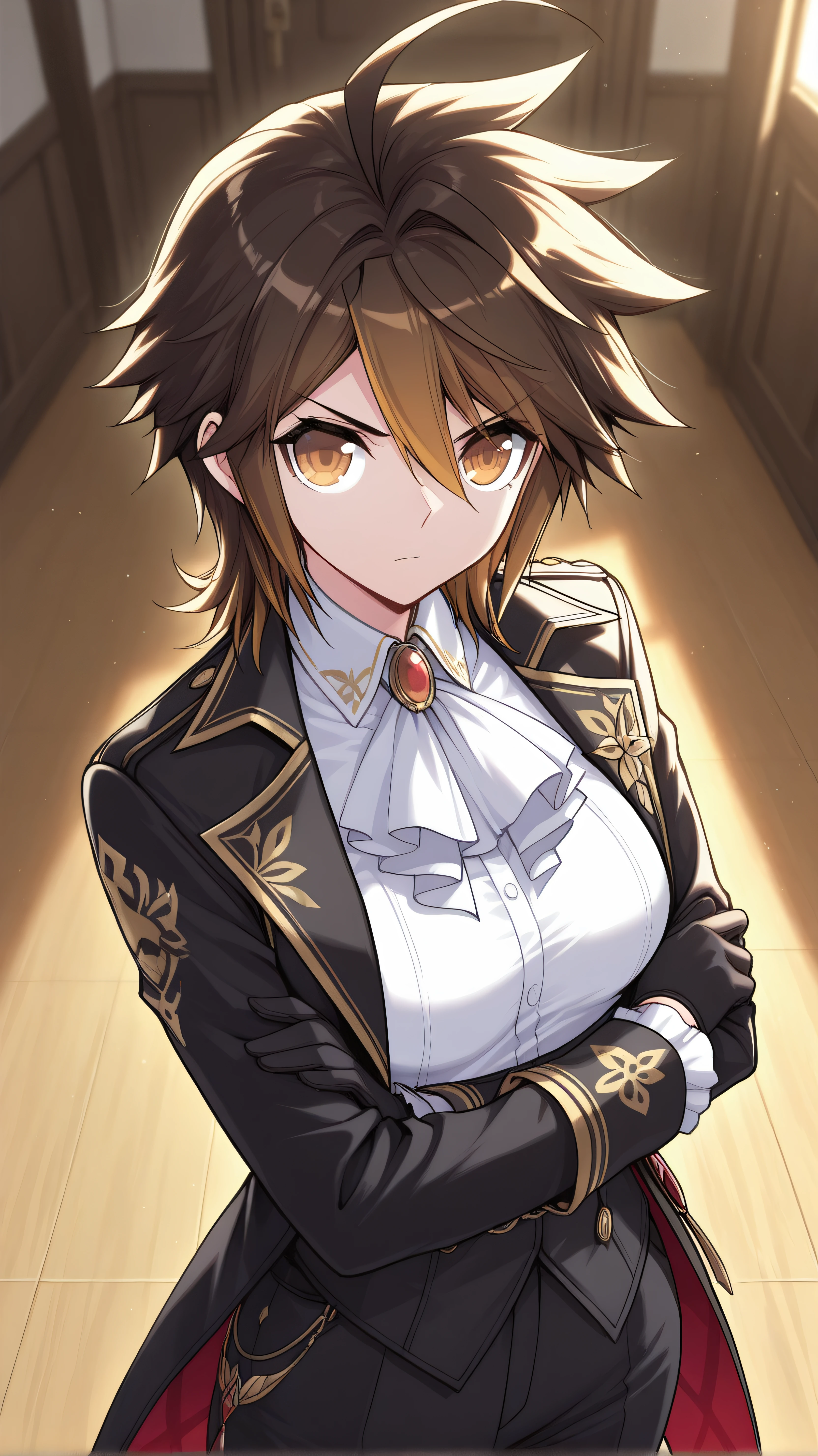 TAG:1girl,solo,freyr, brown hair, brown eyes, 1boy, male focus, short hair, ahoge,hair between eyes,spiked hair