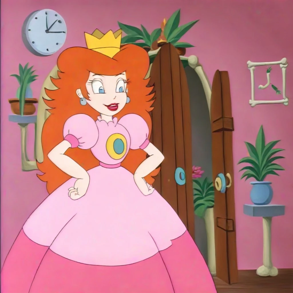 1girl, princess toadstool, orange hair, long hair, blue eyes, pink dress, earrings, crown, makeup, lipstick, red lips, tall female