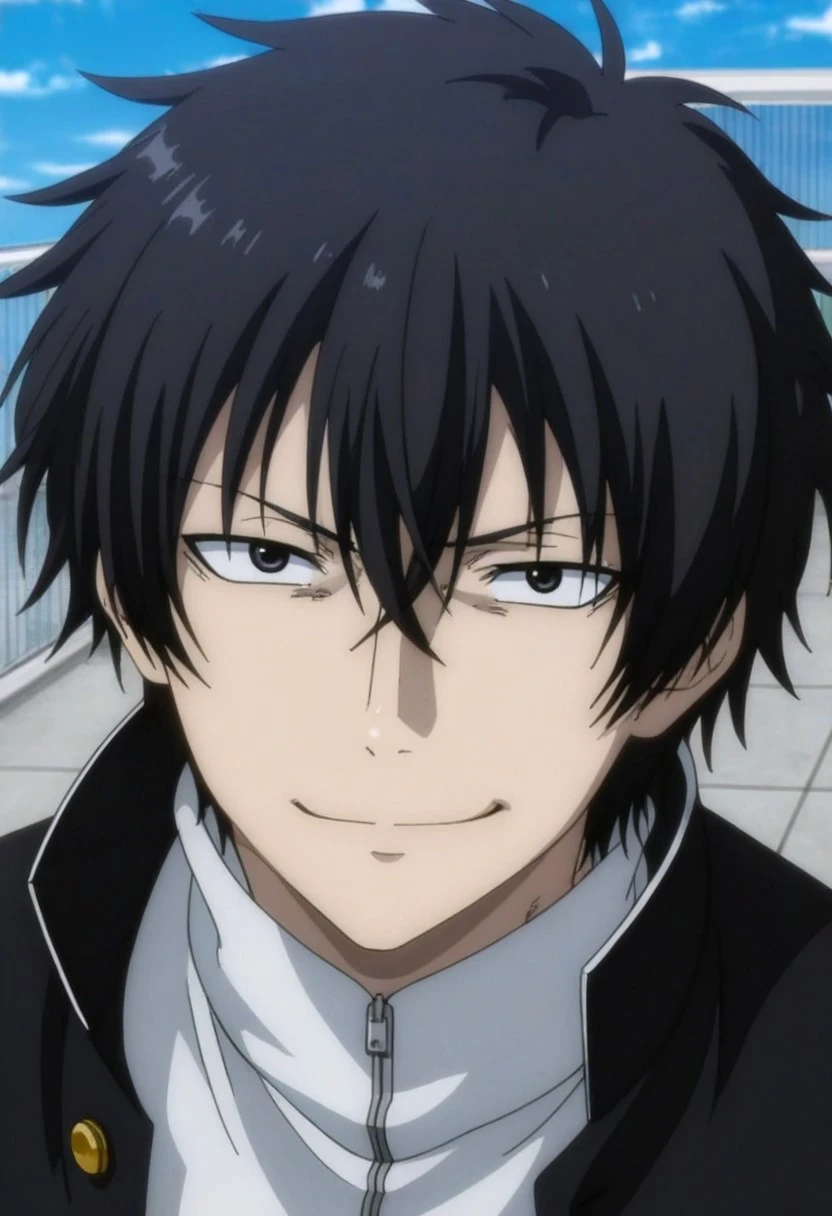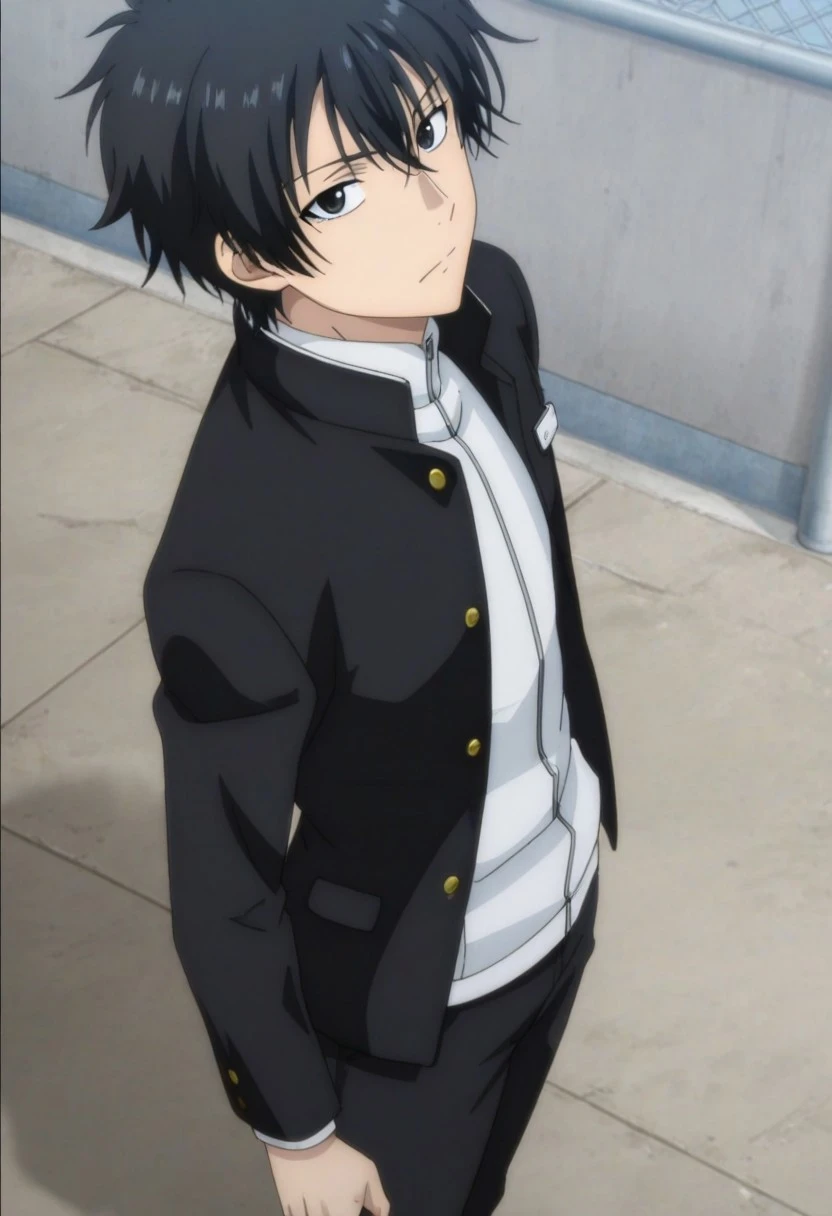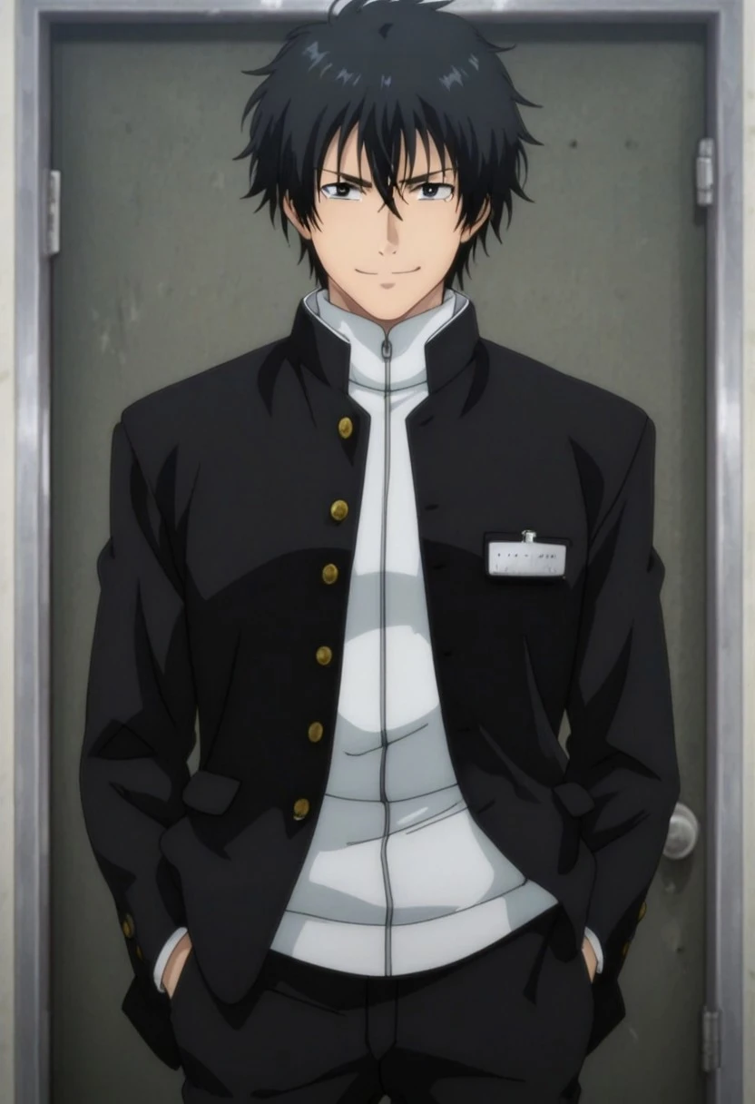 Yuuichi Katagiri, black hair, black eyes, open gakuran blazer, nameplate, white turtleneck underjacket, black pants