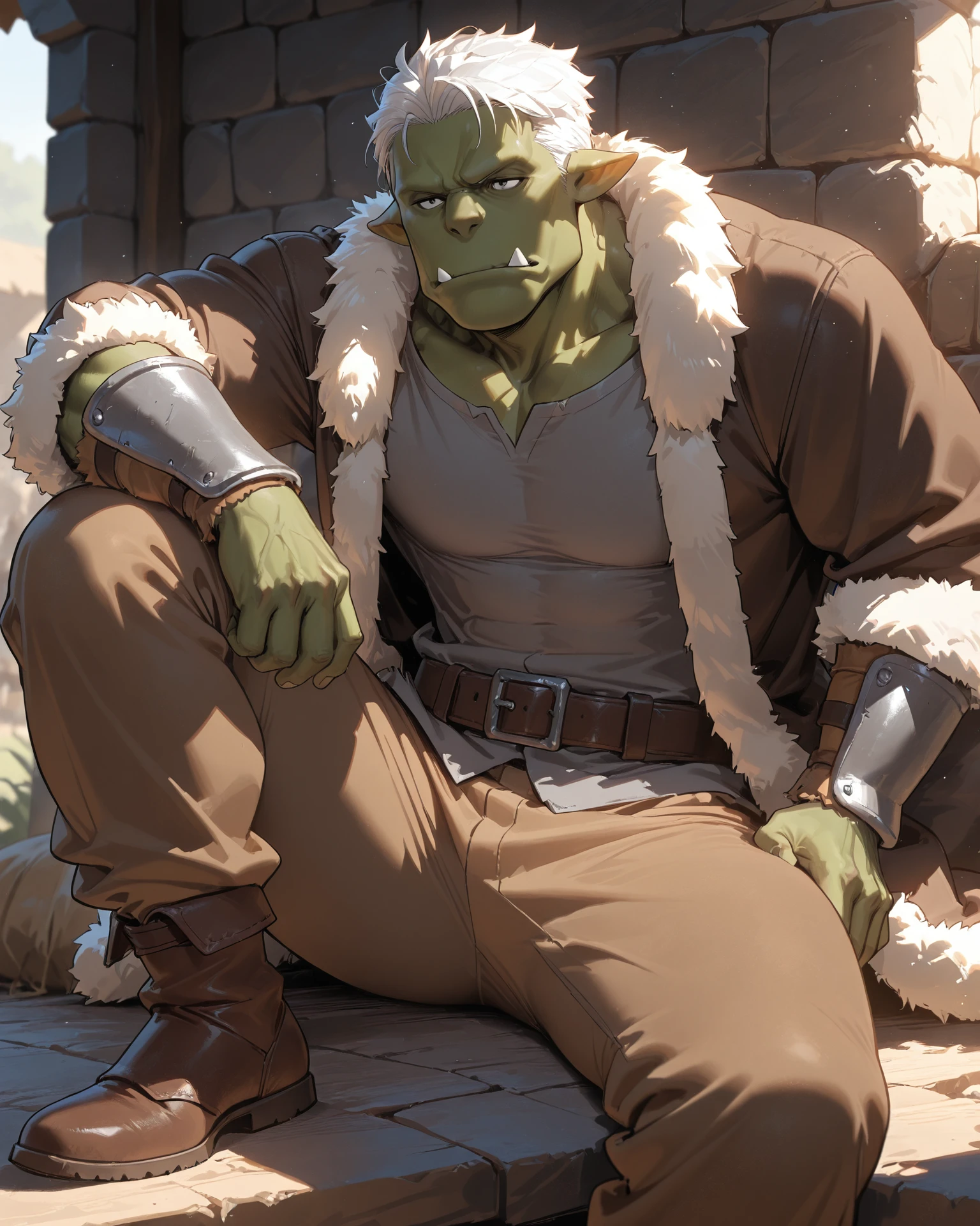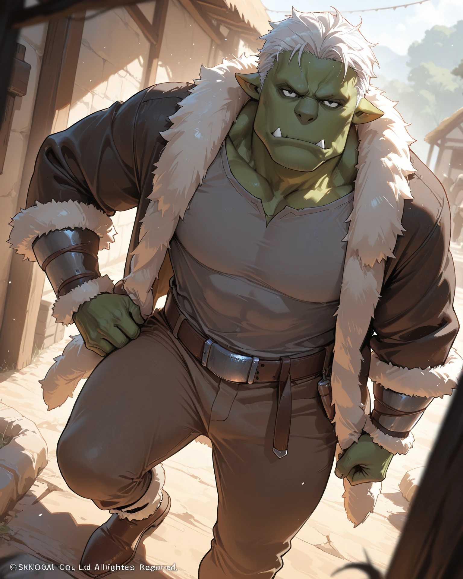 Default outfit: grey shirt, jacket, fur trim, belt, brown pants, brown shoes
