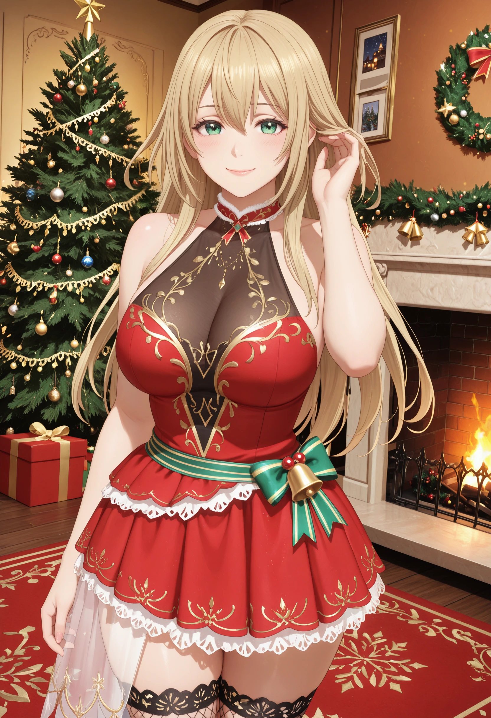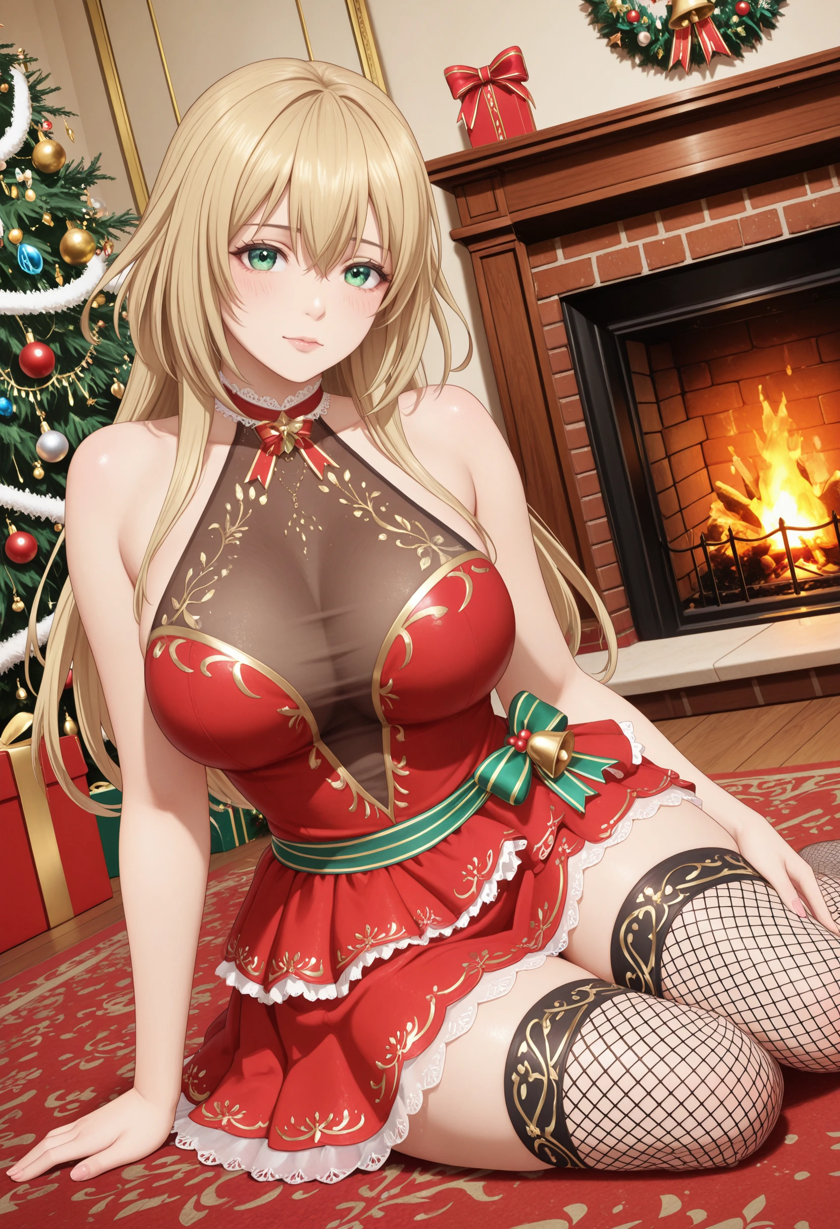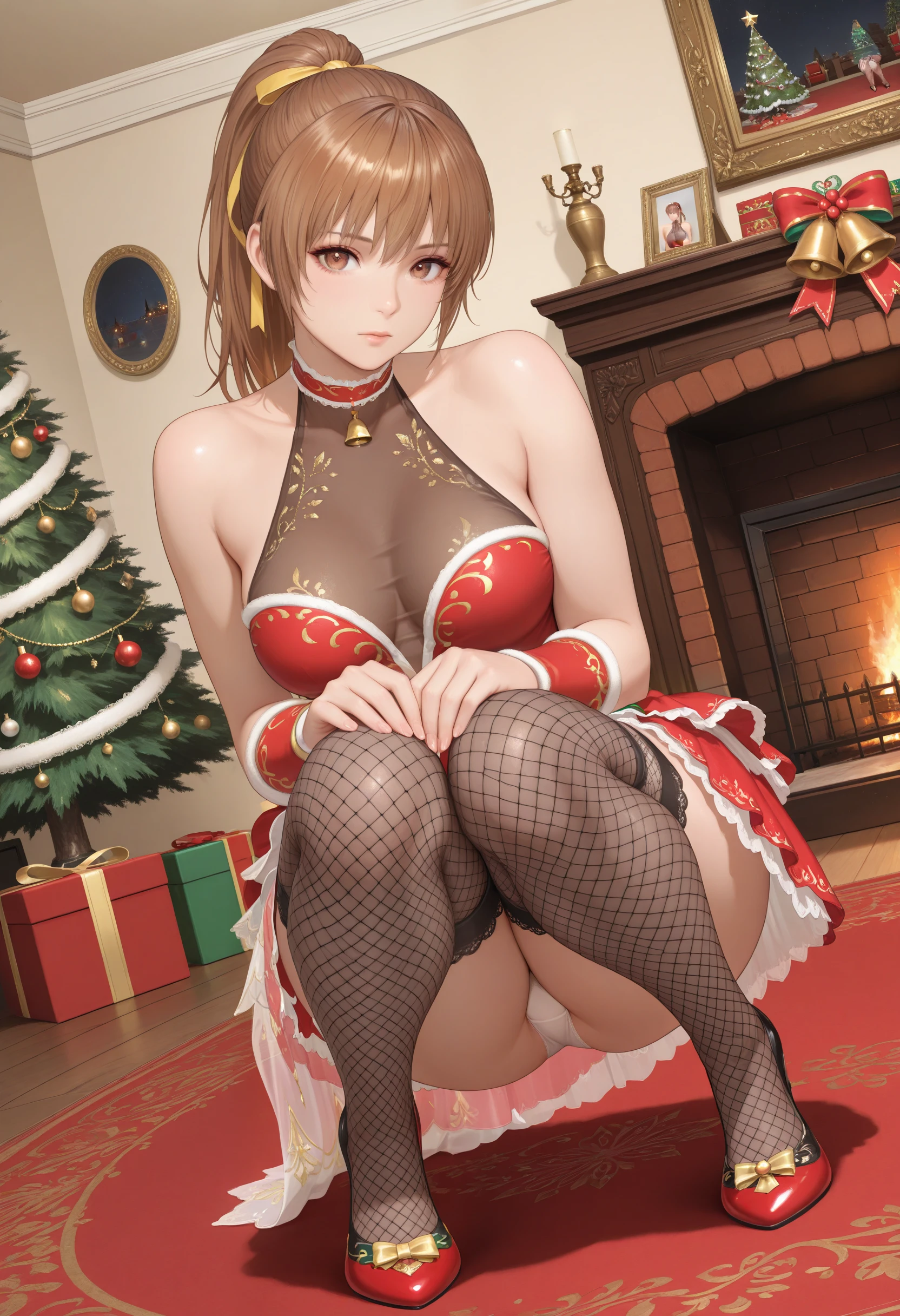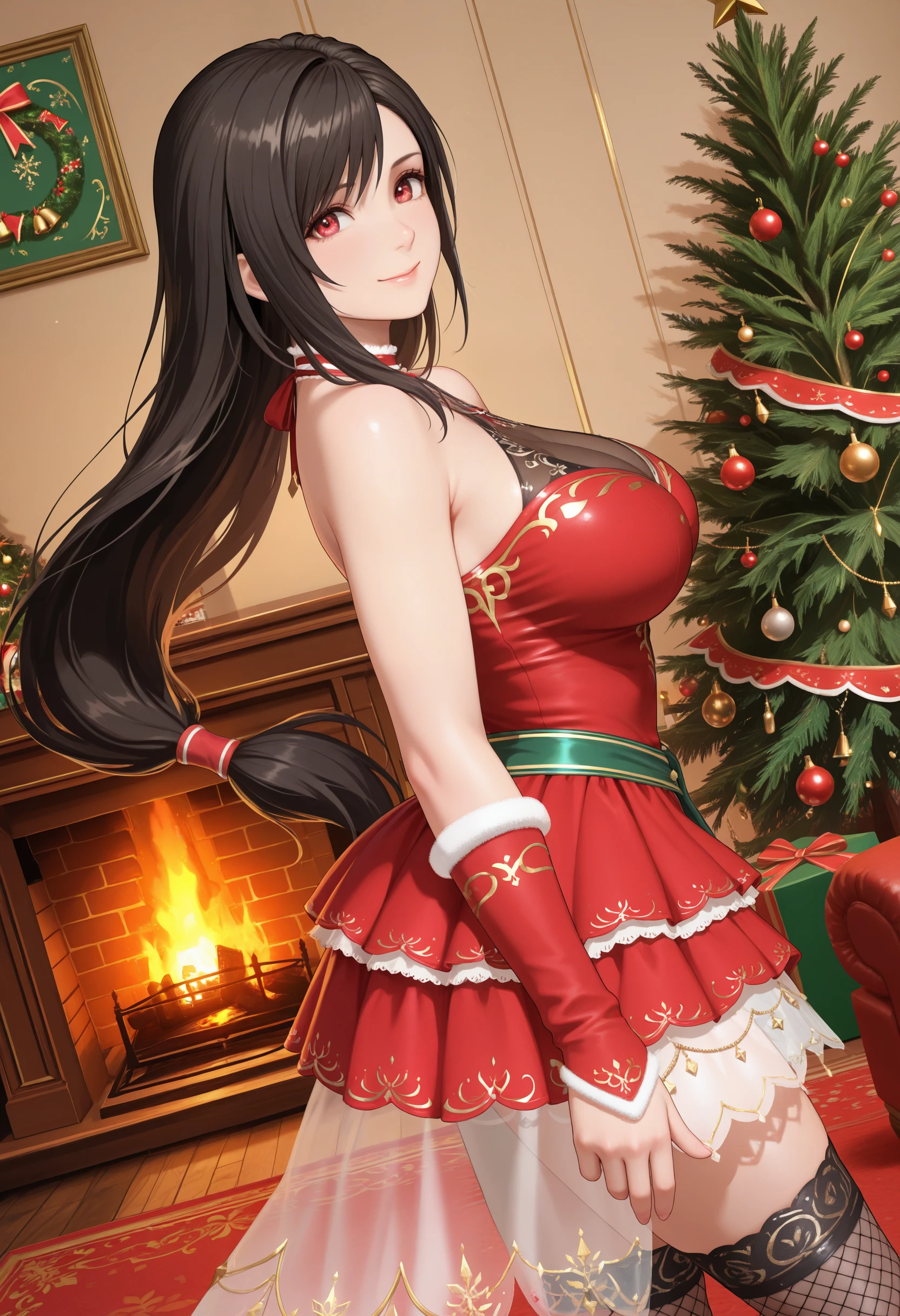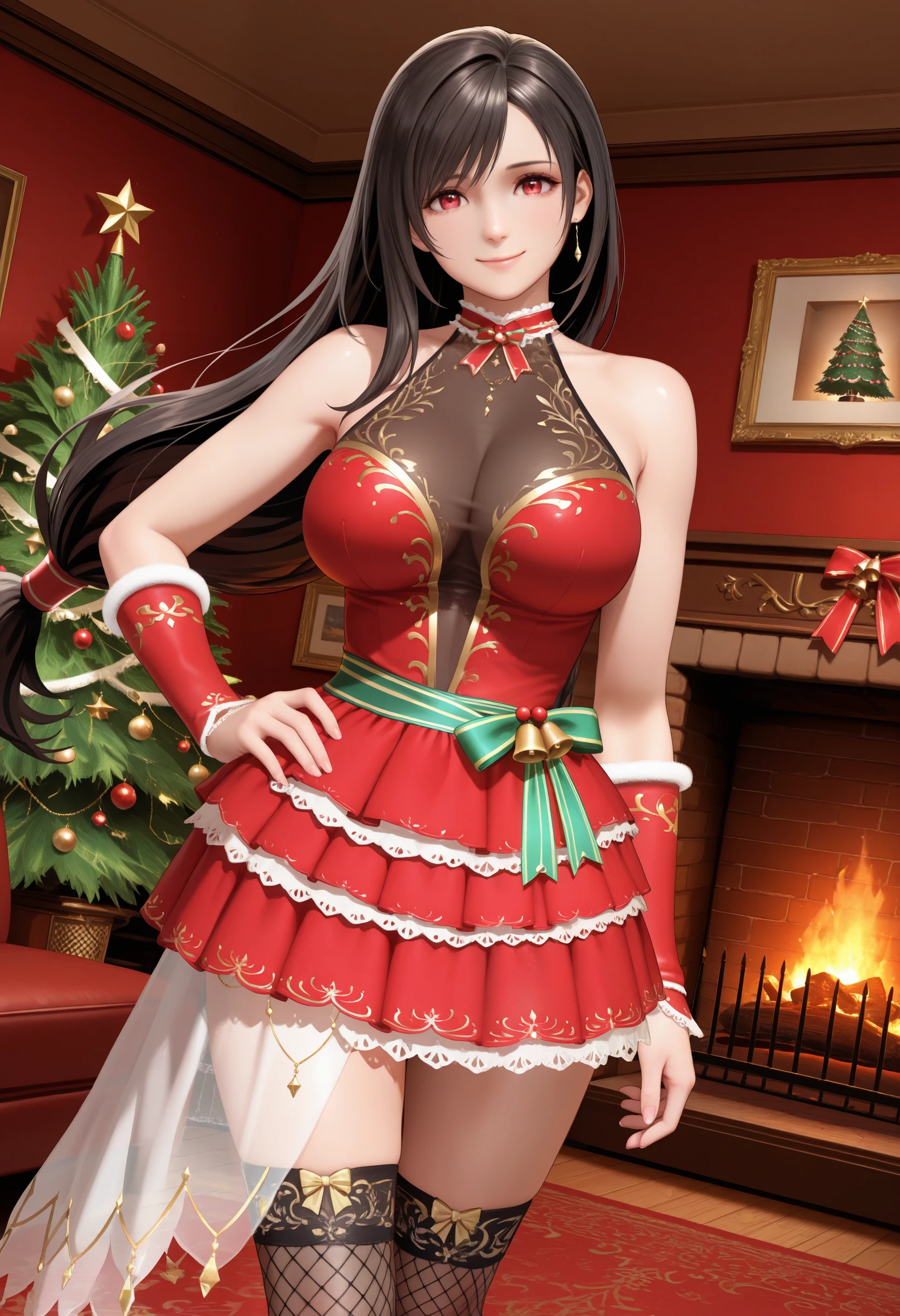 基本プロンプト:"LmnsblDoaxvv,bare shoulders,frilled dress,red short dress,jewelry,asymmetrical skirt,partially see-through skirt,fishnet thighhighs,red high heels"