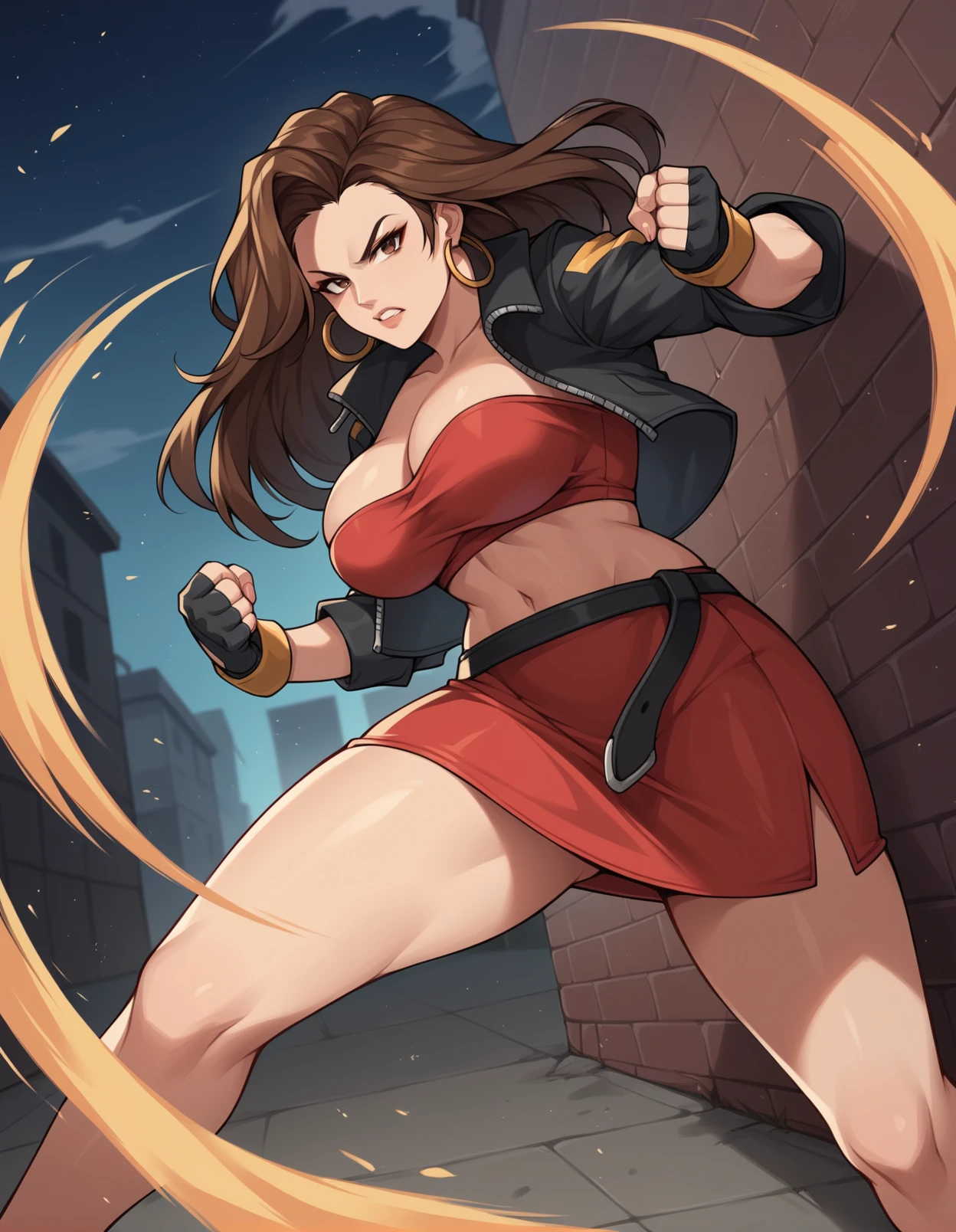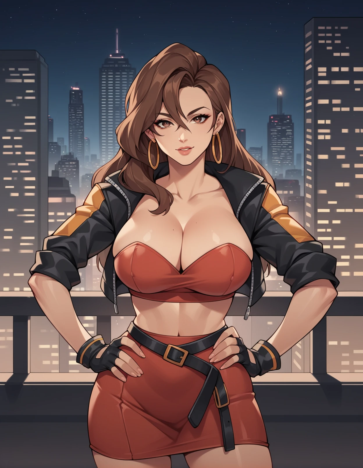 Normal Costume: hoop earrings, red tube top, black jacket, cropped jacket, open jacket, fingerless gloves, belt, red skirt