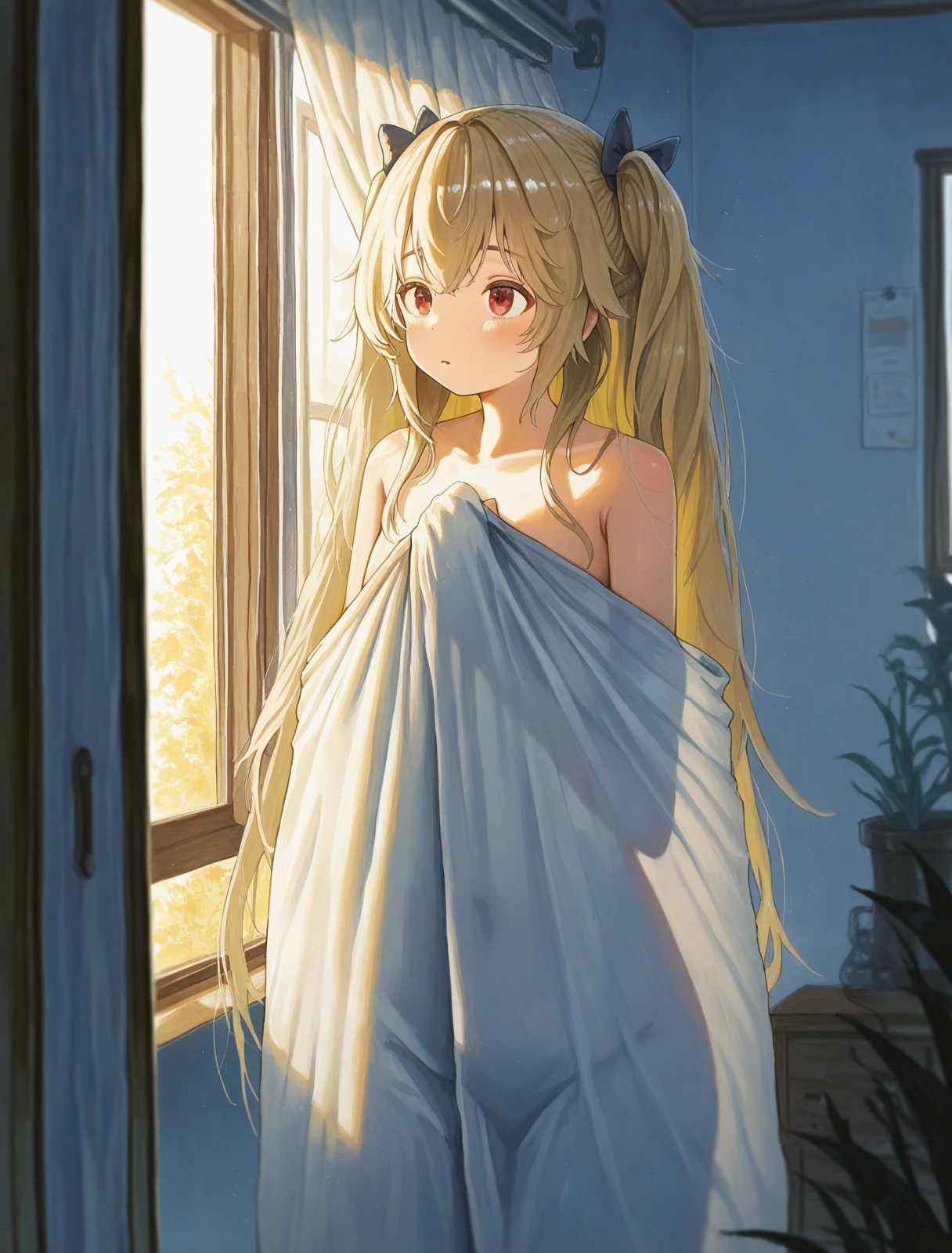 新年皮肤 (moonlit_boat_ride):anchorage_\(azur lane\),twintails,red eyes,china dress, hair bun, long hair,from behind, looking back,lace-trimmed legwear,garter_belt,black legwear,