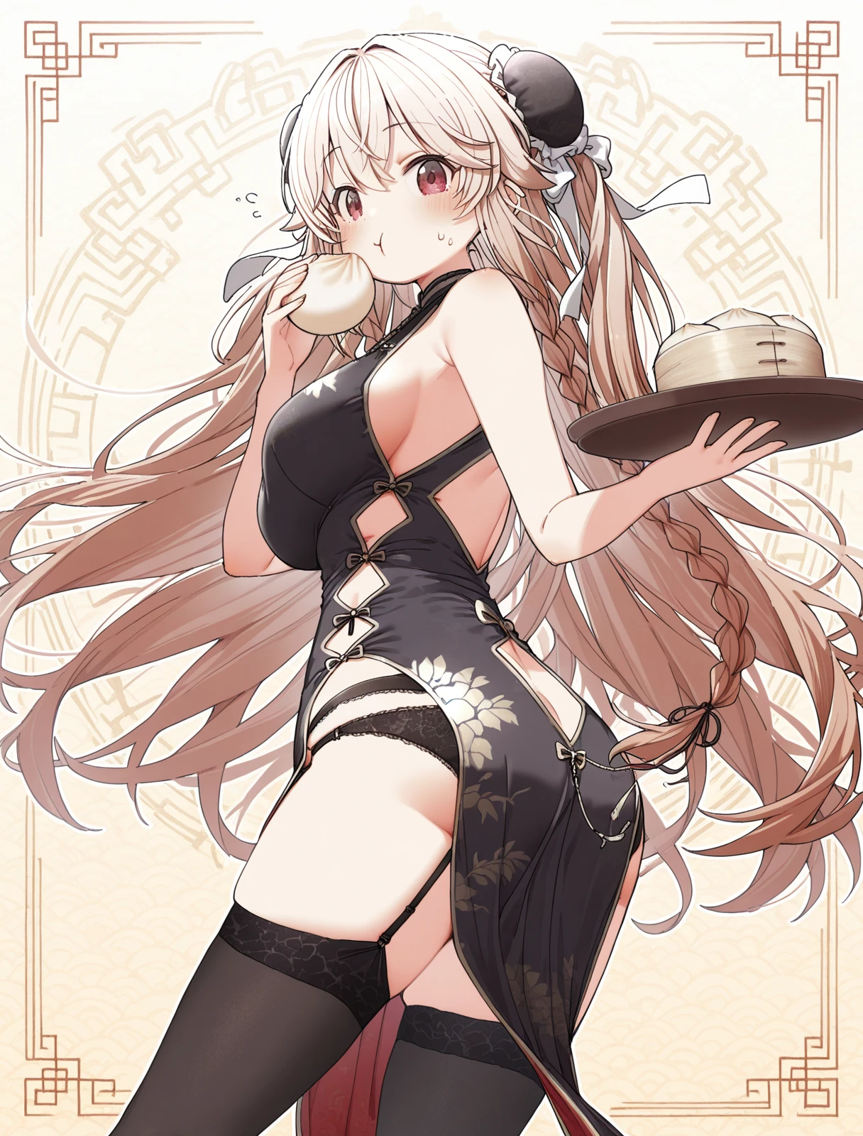 新年皮肤 (moonlit_boat_ride):anchorage_\(azur lane\),china dress, hair bun, long hair,lace-trimmed legwear,garter_belt,black legwear,