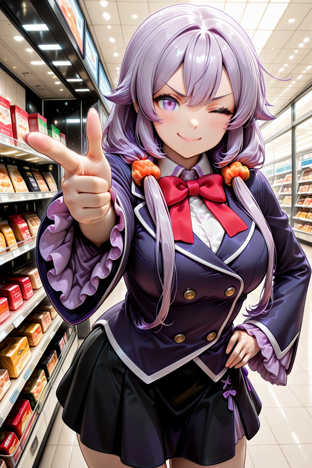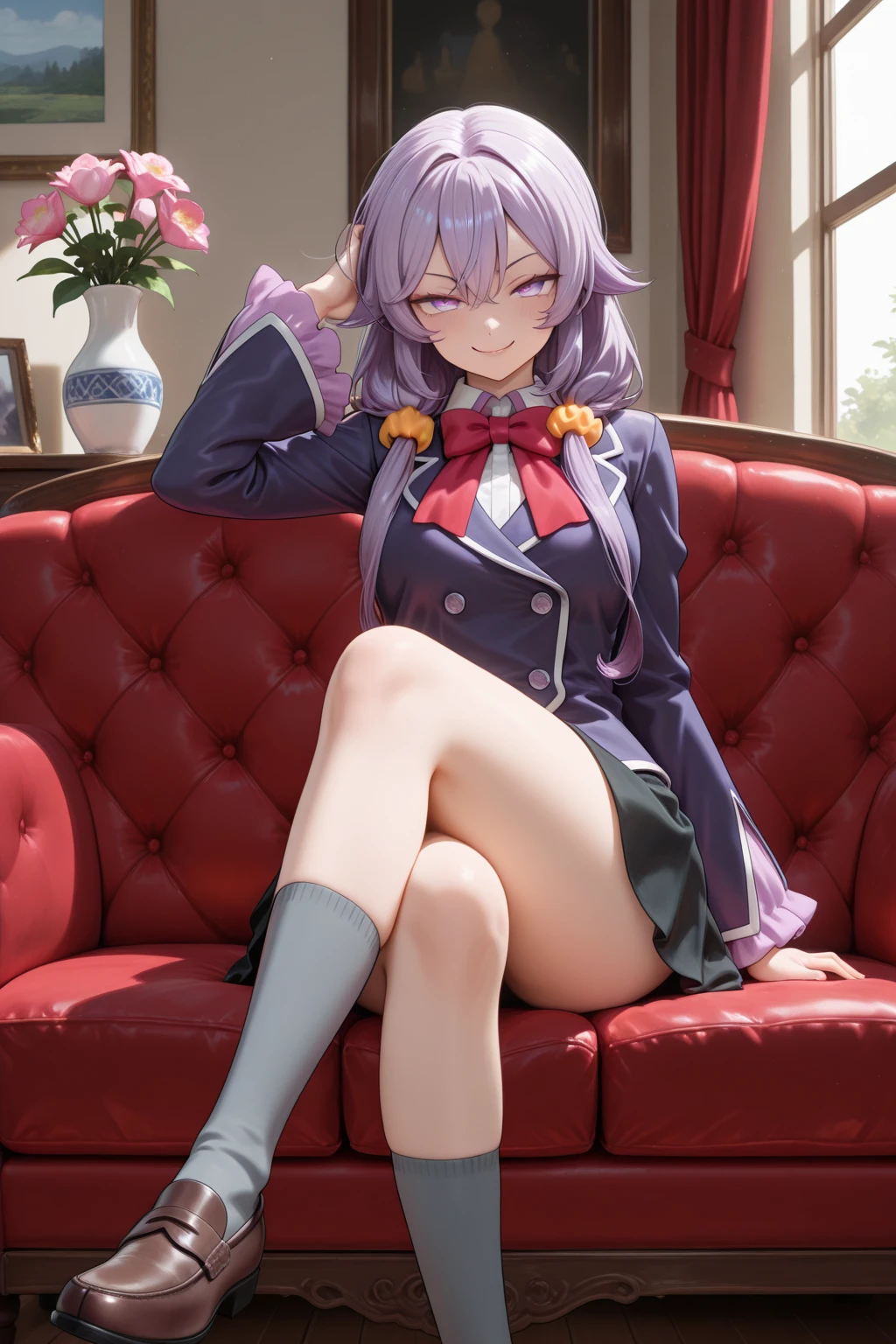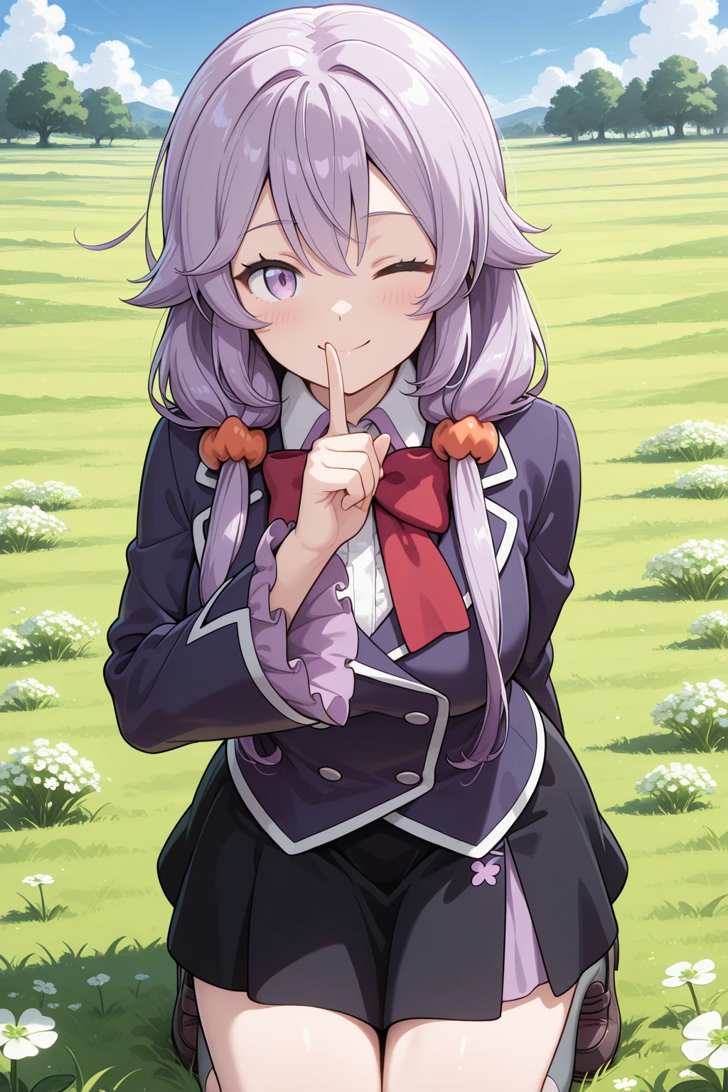 トリガーワード:NP_Peta, purple hair, long hair, low twintails, orange scrunchie, bangs, purple eyes, school uniform, white shirt, collared shirt, red bowtie, purple jacket, overlap jacket, double-breasted jacket, long sleeves, purple frilled sleeves, black skirt追加:grey socks, brown loafers