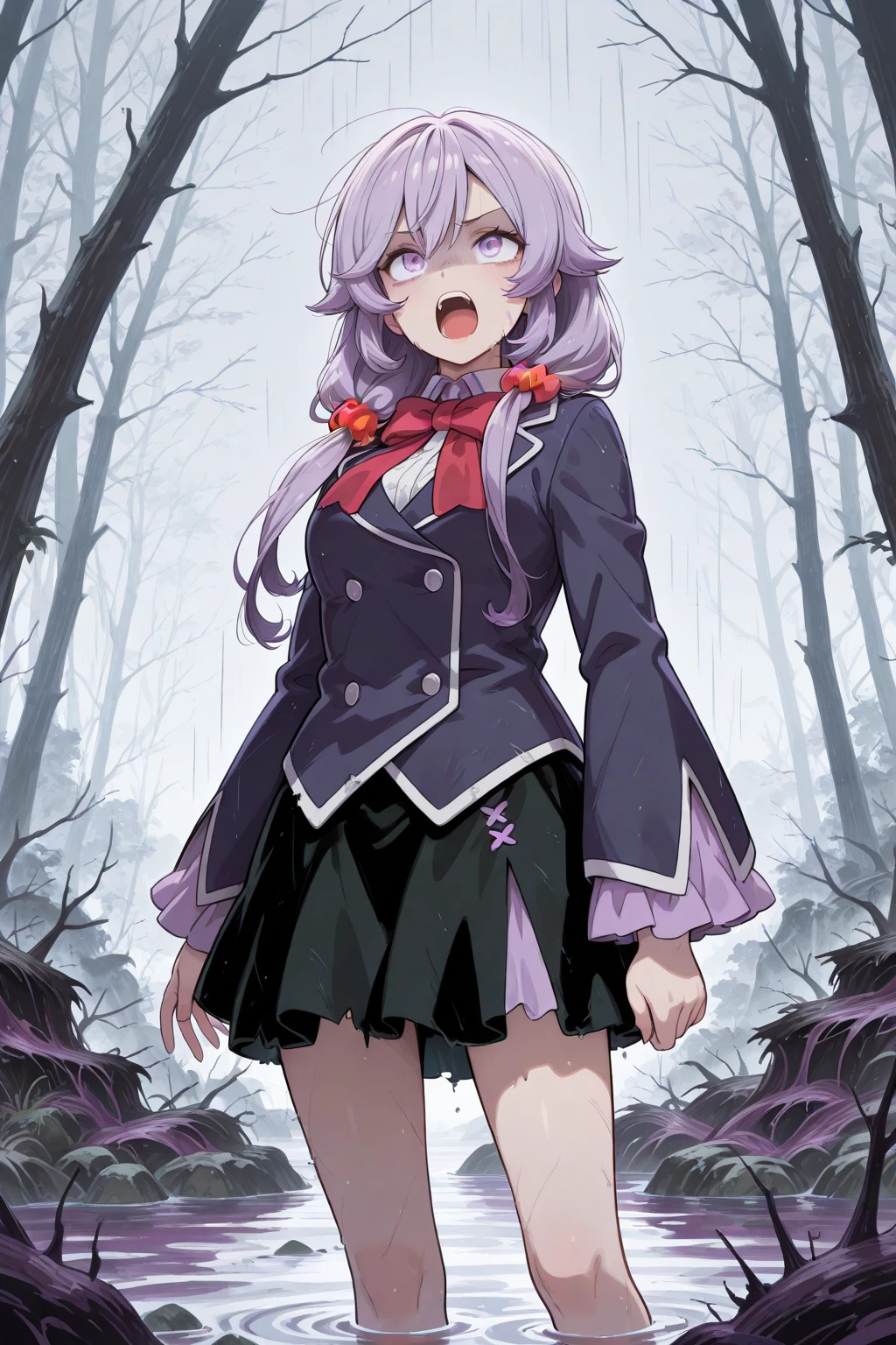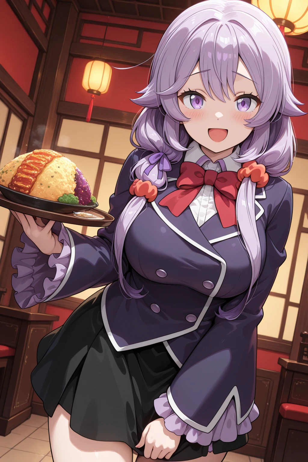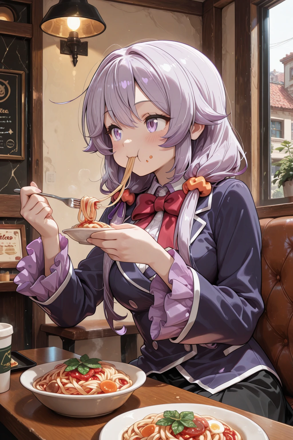 トリガーワード:NP_Peta, purple hair, long hair, low twintails, orange scrunchie, bangs, purple eyes, school uniform, white shirt, collared shirt, red bowtie, purple jacket, overlap jacket, double-breasted jacket, long sleeves, purple frilled sleeves, black skirt追加:grey socks, brown loafers