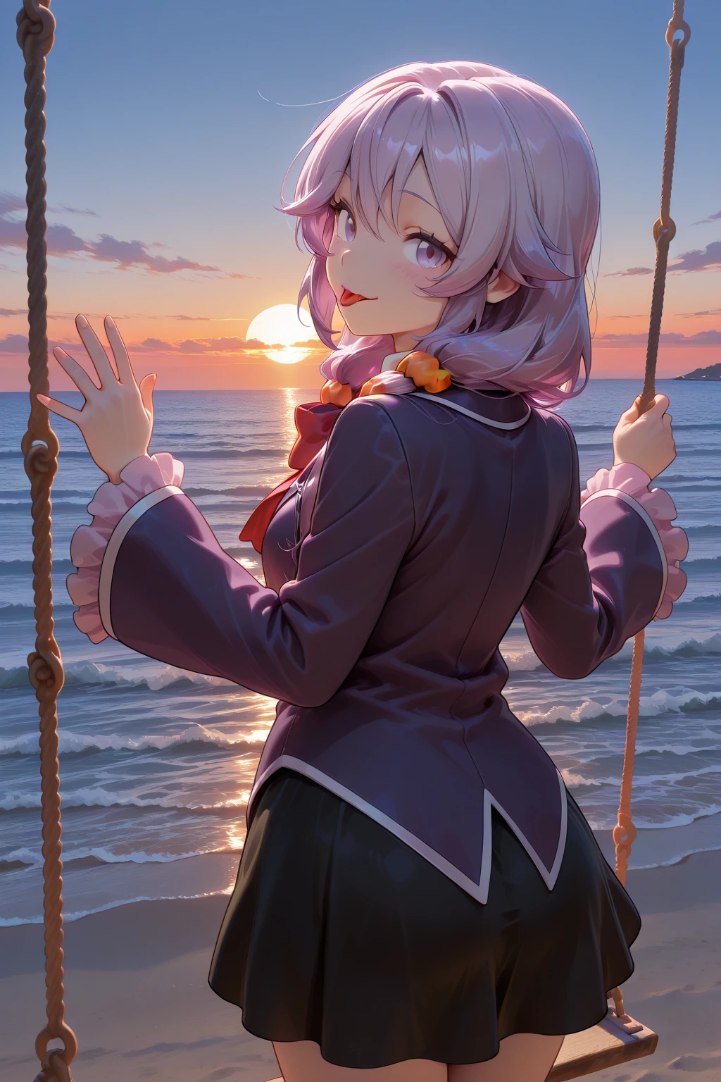 スカートの紫色の部分が紫色にならない場合、"purple skirt"や"purple accent skirt"をプロンプトに入れて、ネガティブプロンプトに"purple inner skirt"を入れて生成すると本来のデザインに近くなる場合があります(場合によっては"(purple skirt:0.6)"など比重を調整してください)。