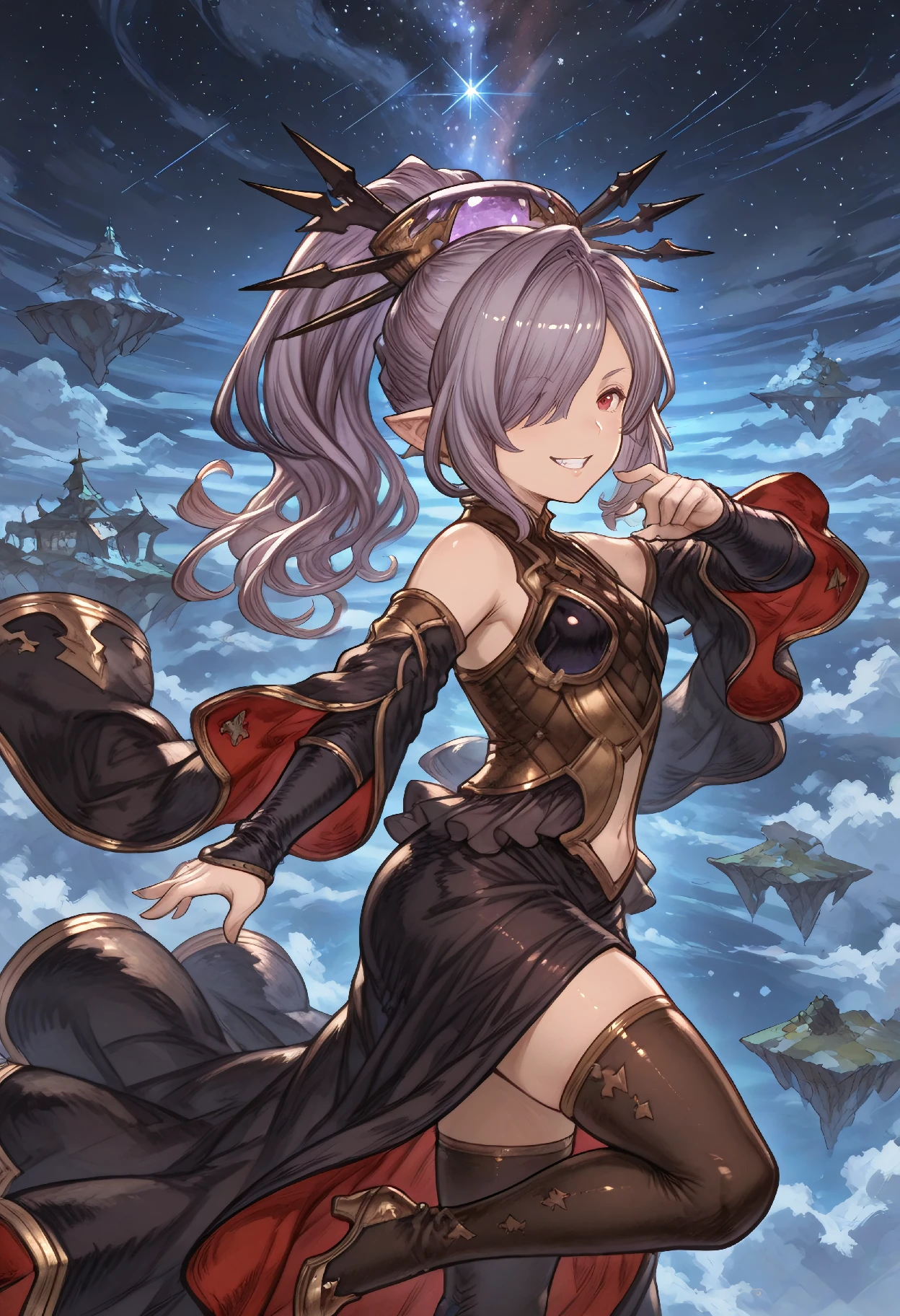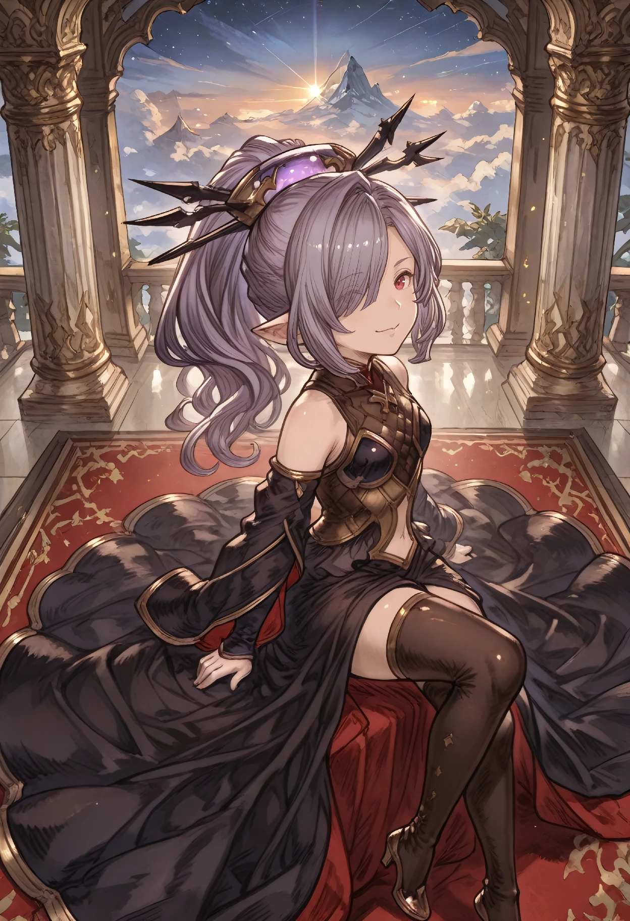 NiyonBase (Granblue Fantasy), harvin, long hair, ponytail, purple hair, hair over one eye, pointy ears, red eyes, bare shoulders, navel cutout, hair ornament, hair stick, clothing cutout, black dress, detached sleeves, black thighhighs, thigh boots, high heels,