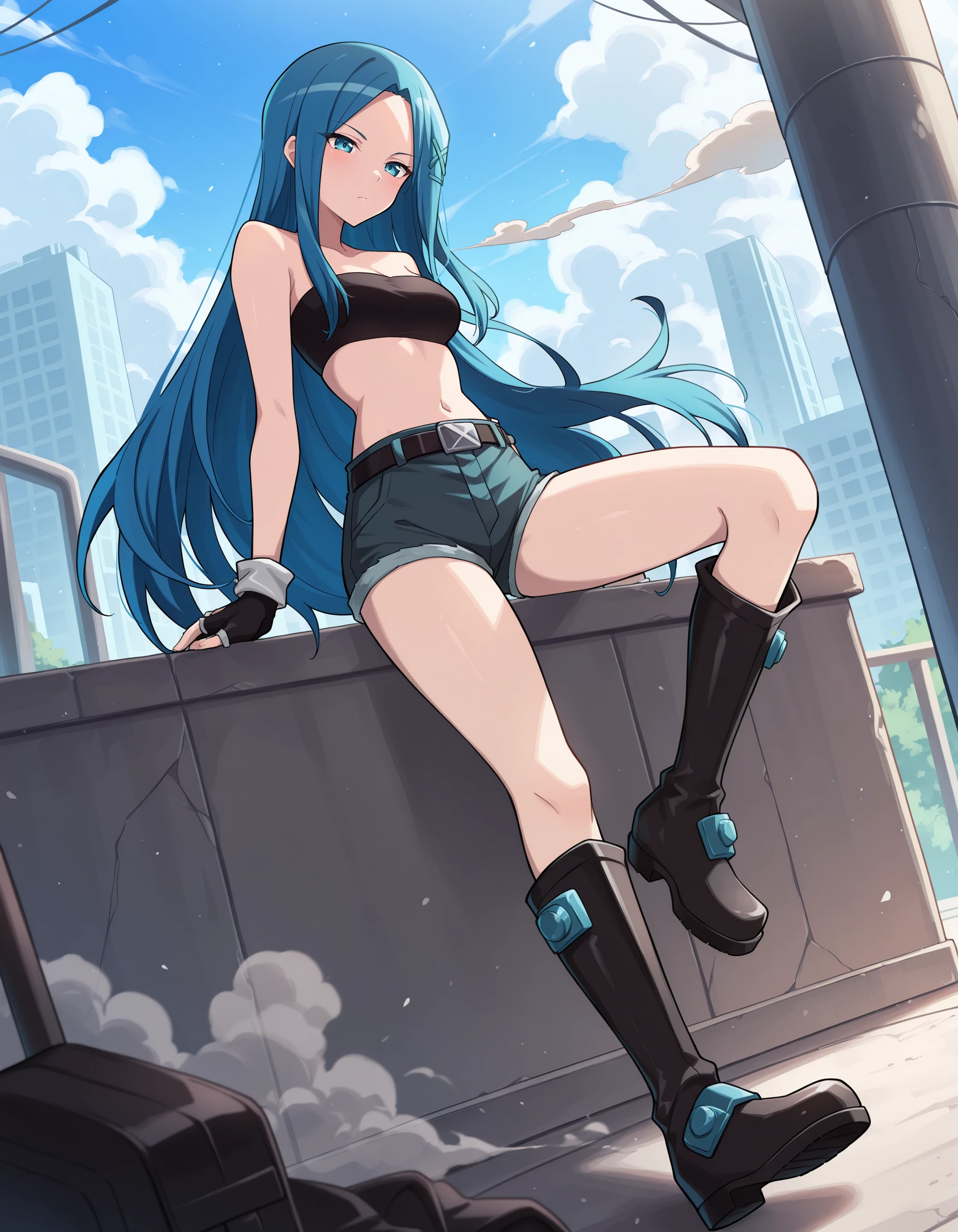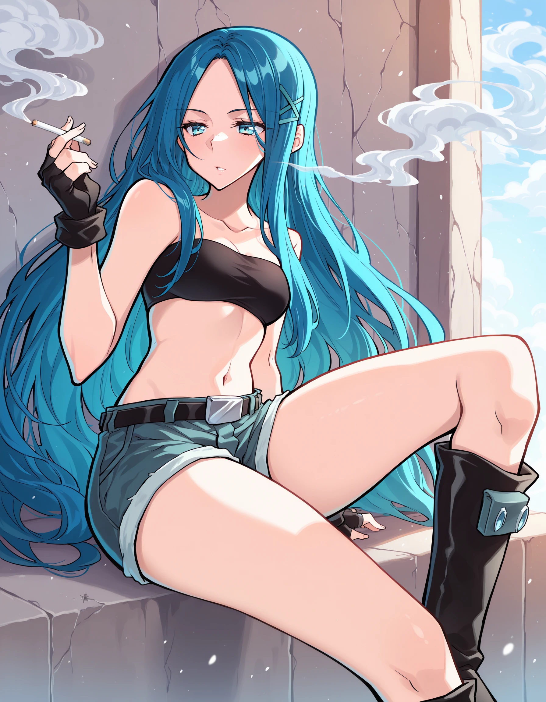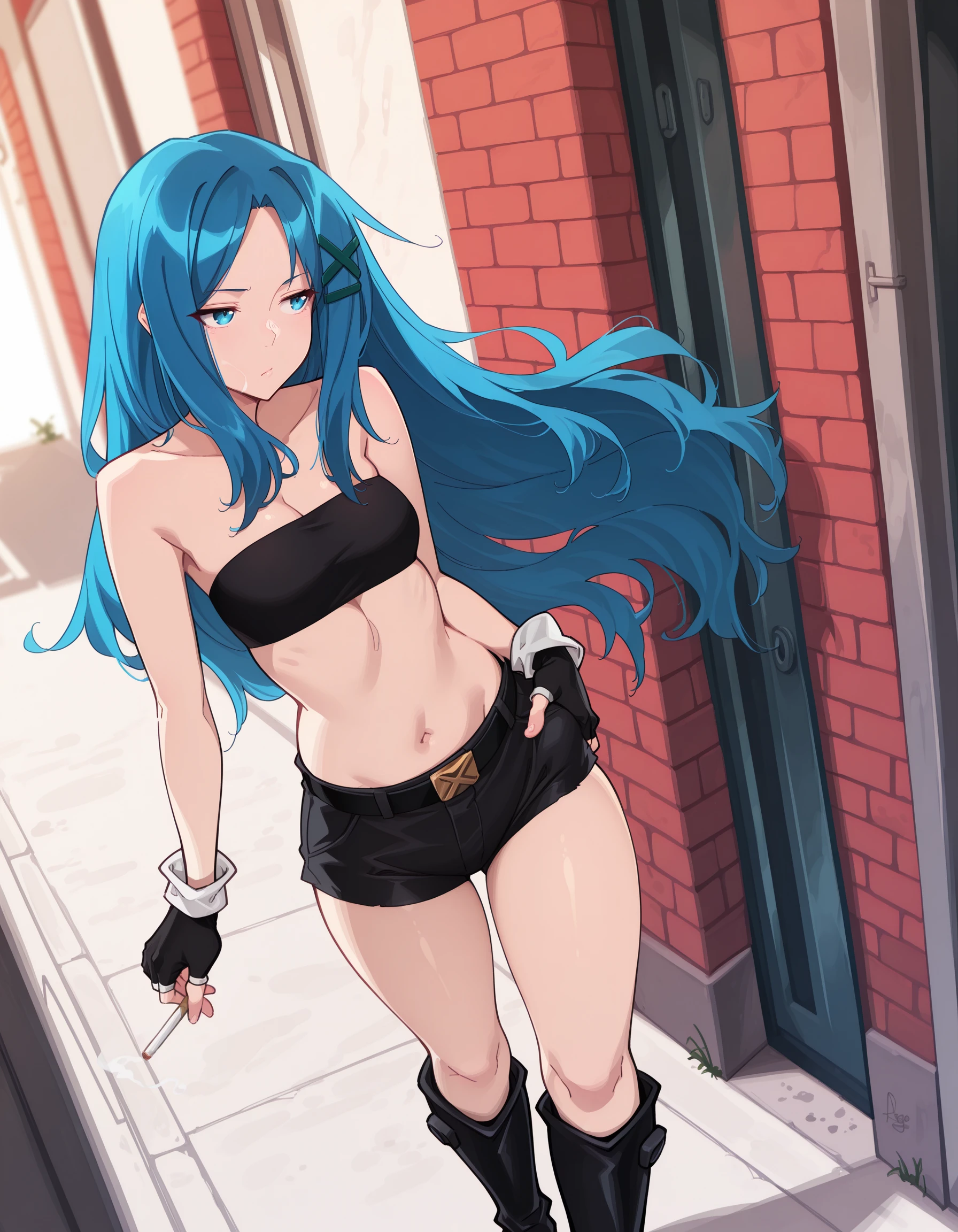 AEKanna, blue eyes, blue hair, very long hair, x hair ornament, black bandeau, black gloves, fingerless gloves, belt, short shorts, black footwear, knee boots,