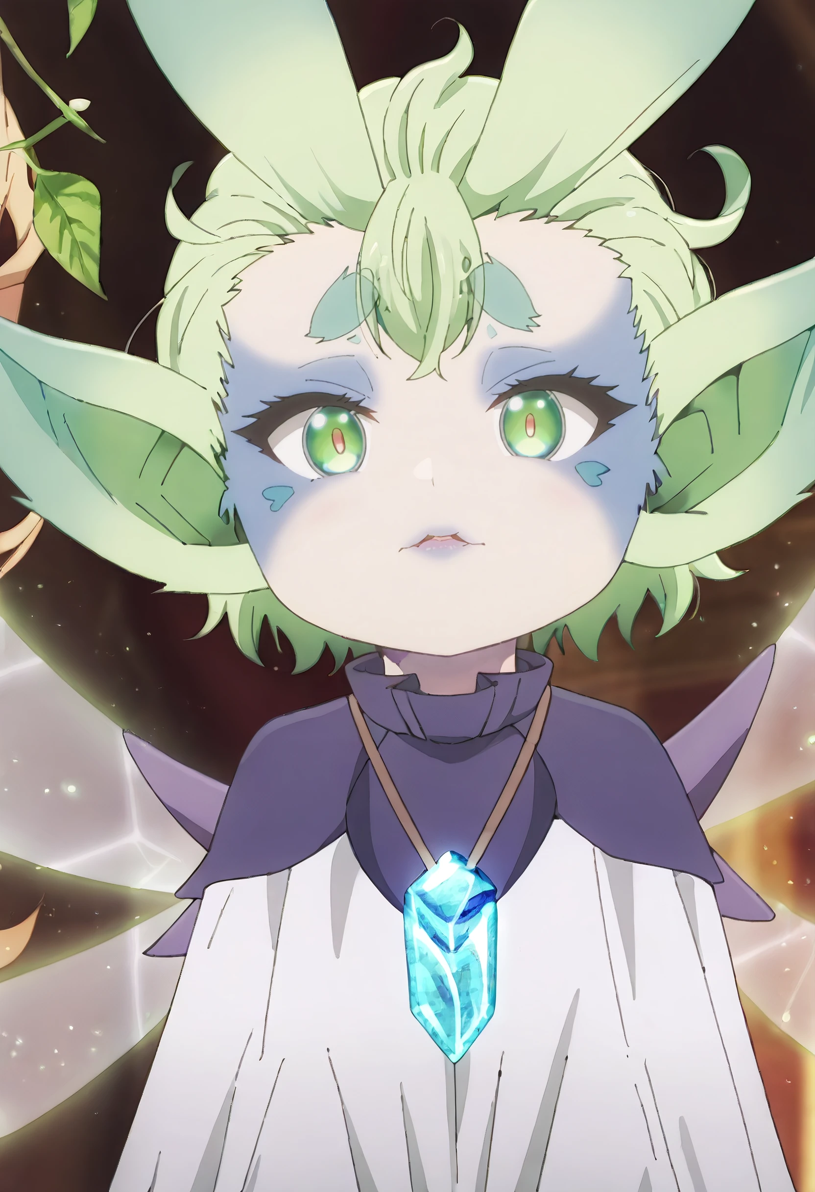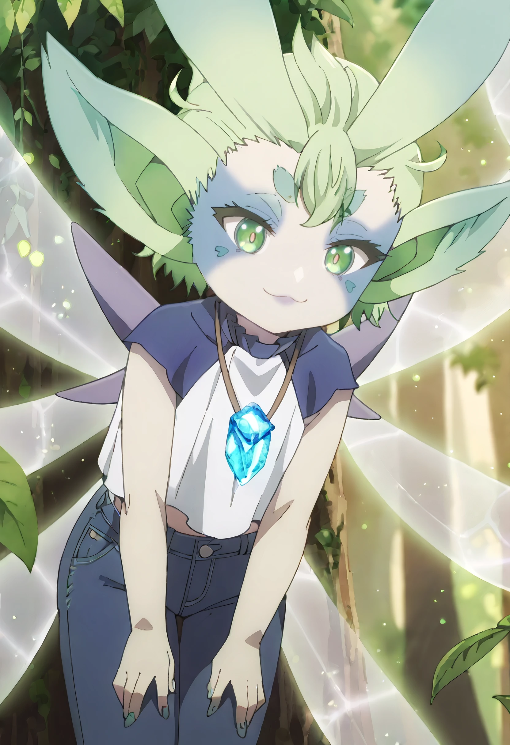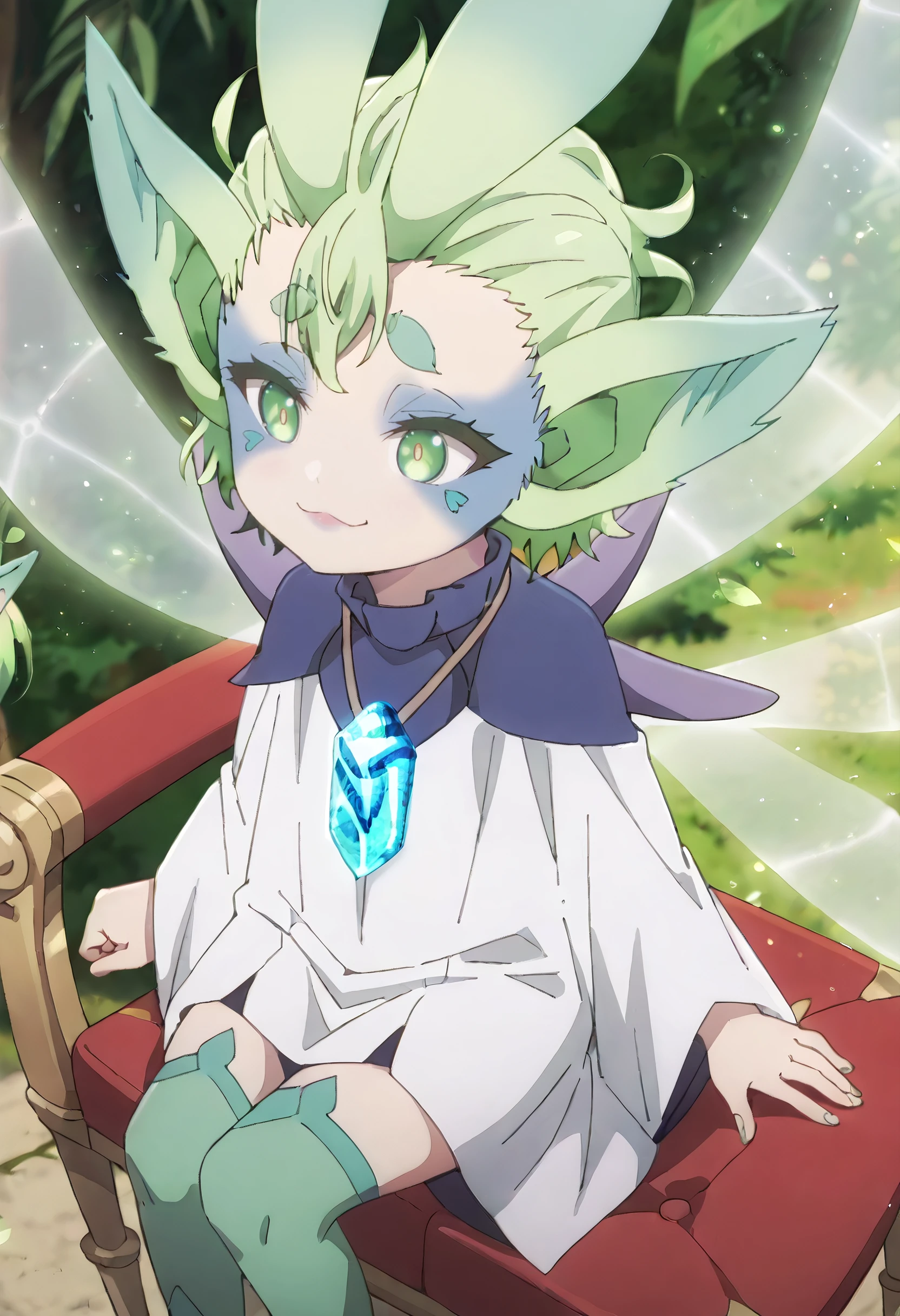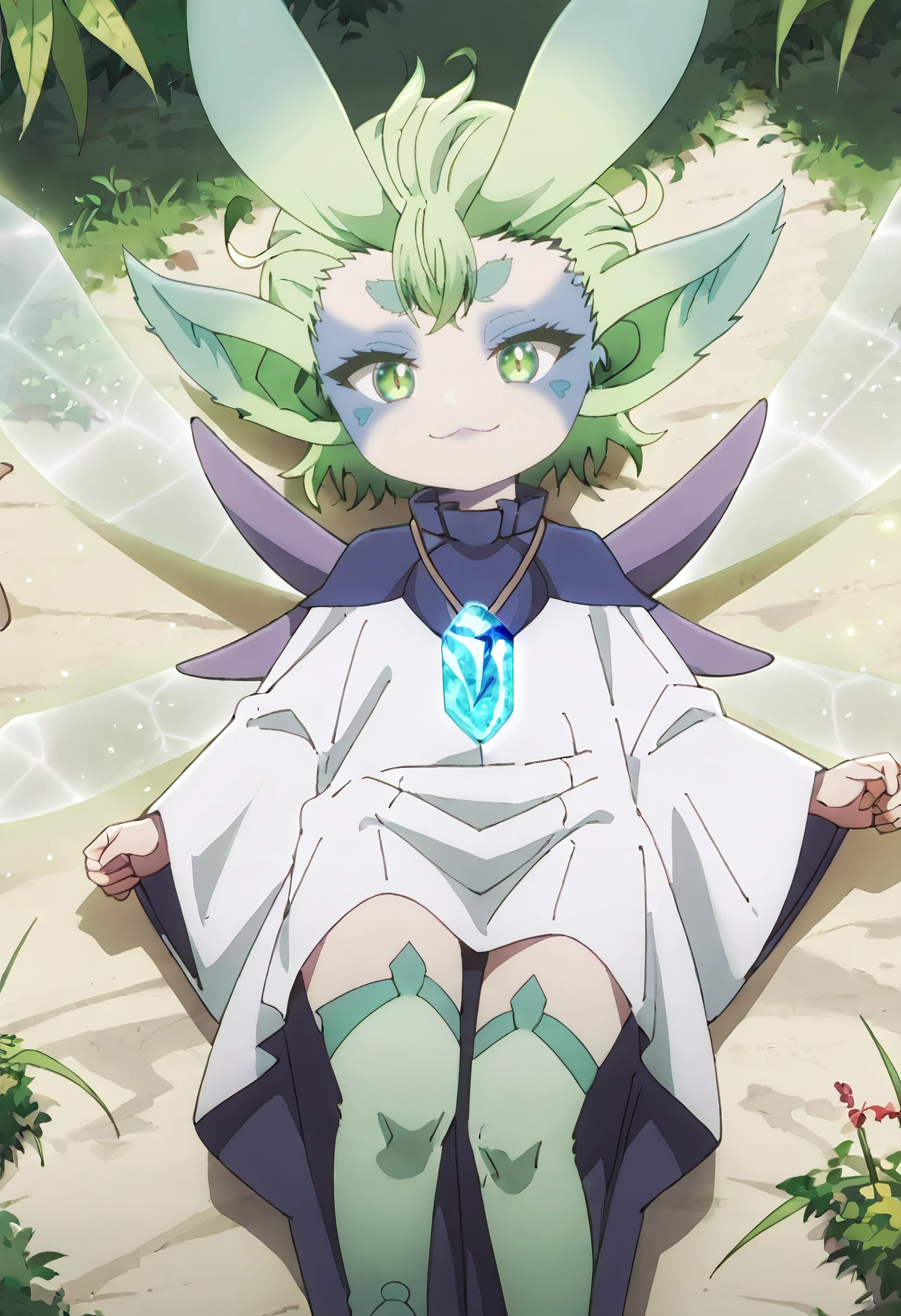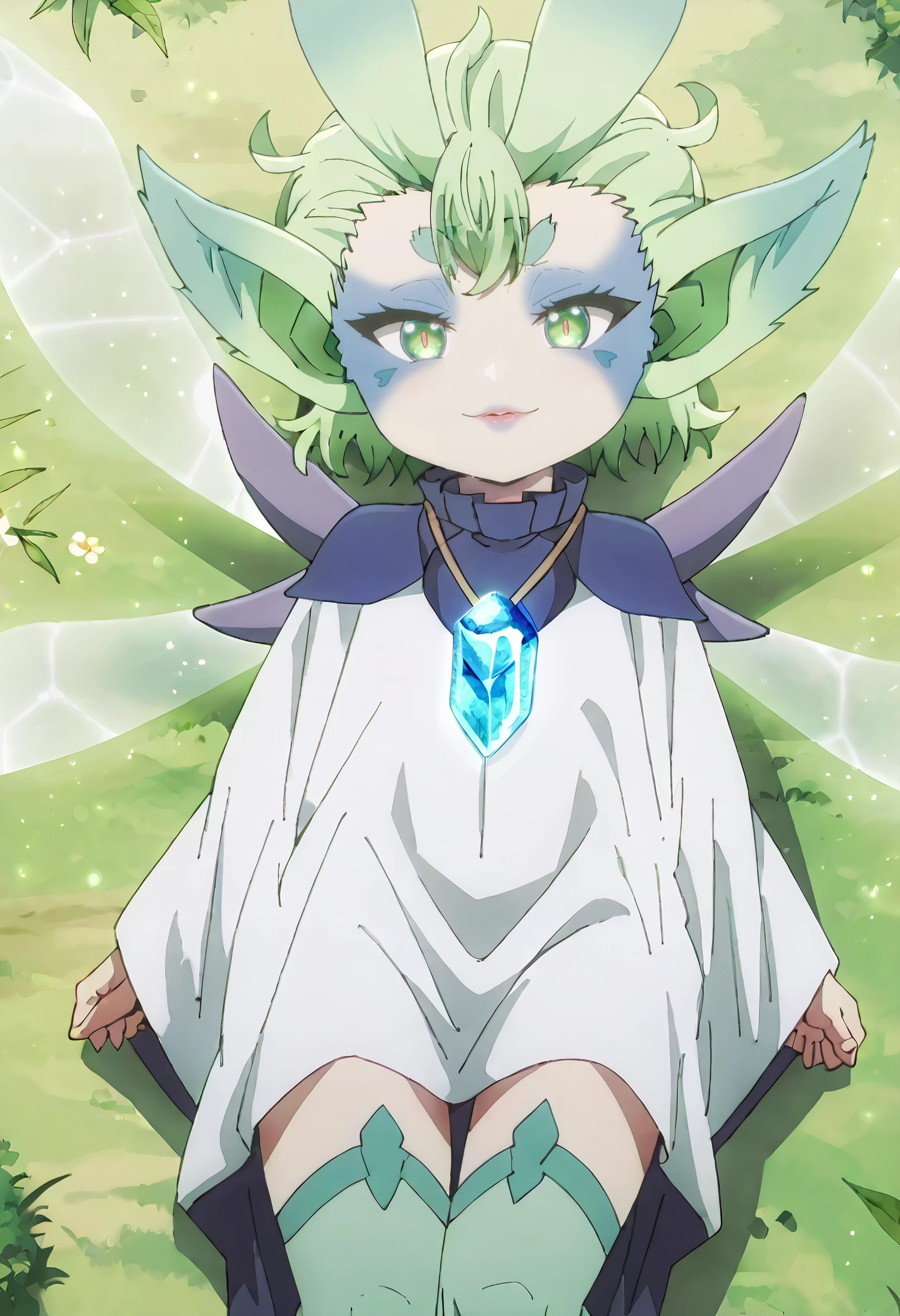 MGNTiti, green hair, plant hair, short hair, green eyes, large ears, pointy ears, thick eyebrows, wings, fairy wings, fairy, green wings, multiple wings, colored skin, facial mark,