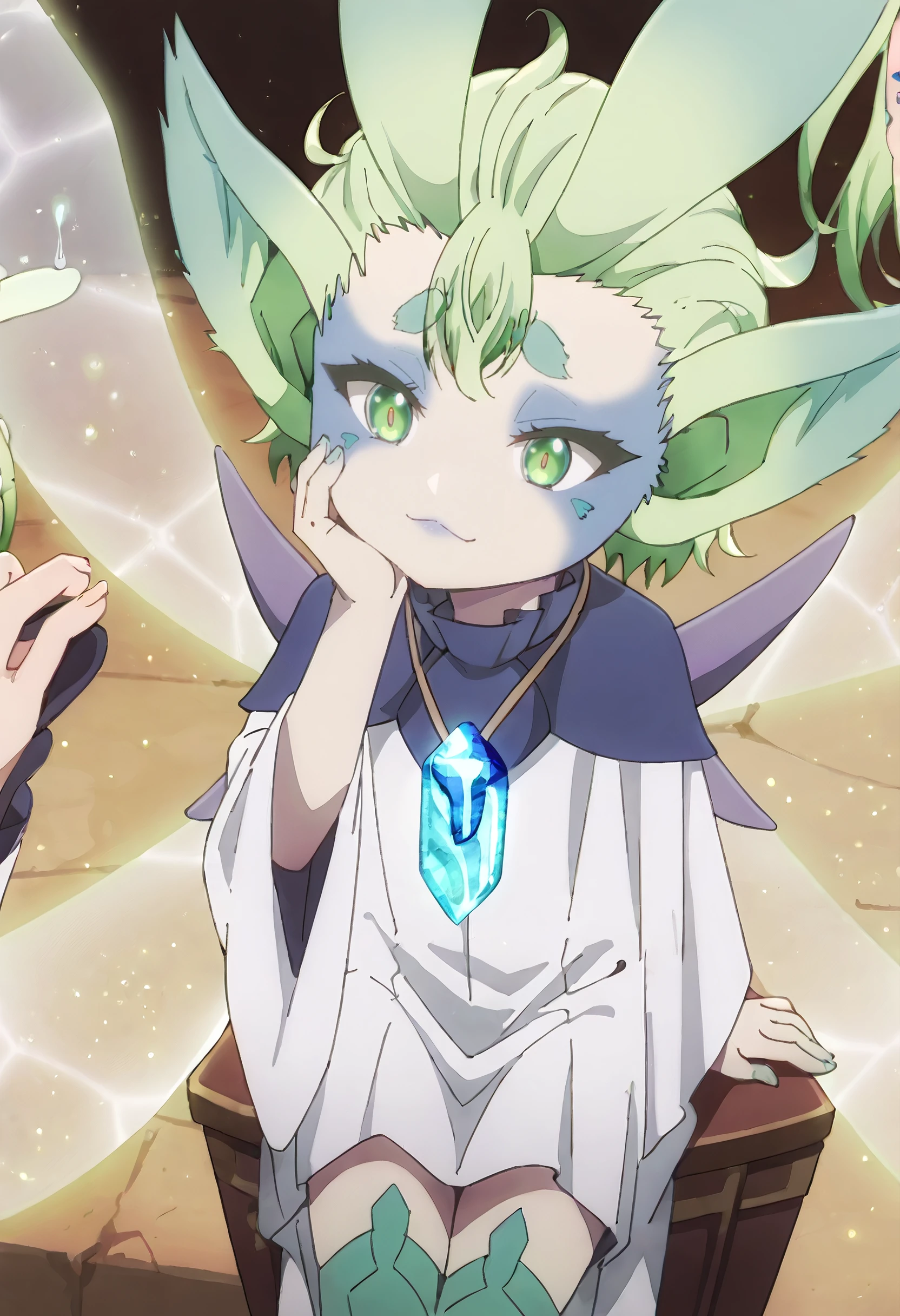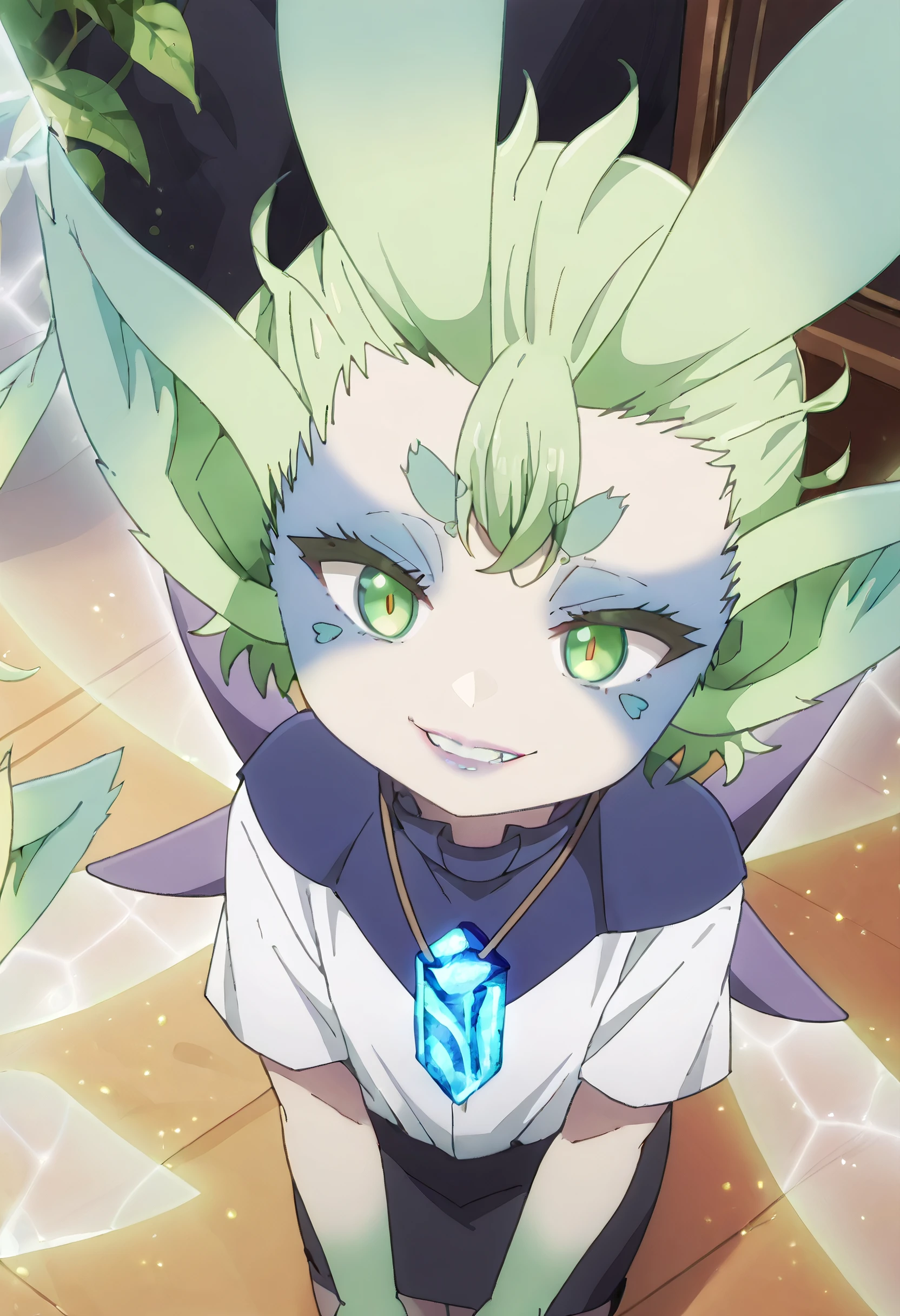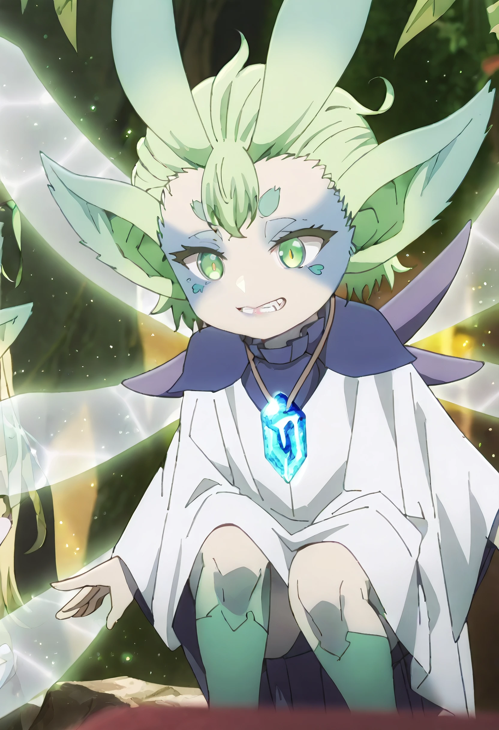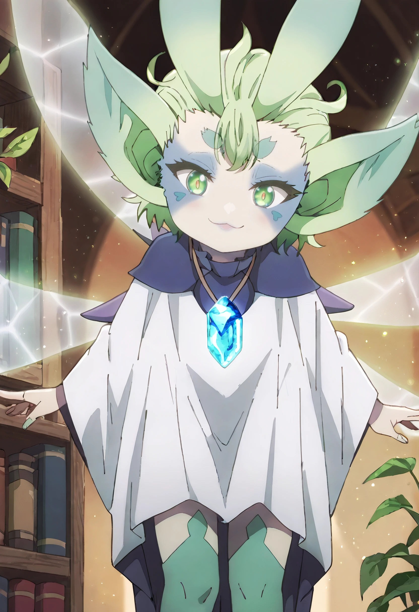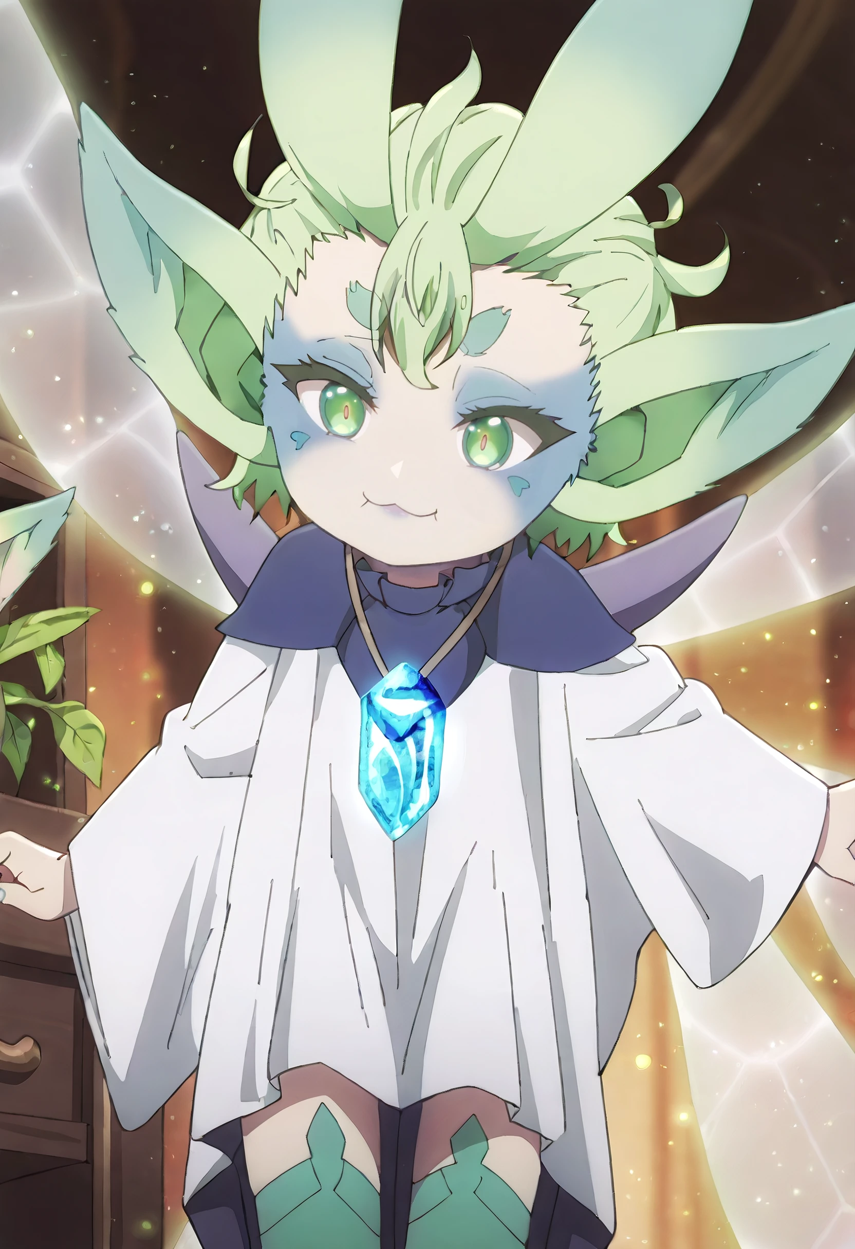 MGNTiti, green hair, plant hair, short hair, green eyes, large ears, pointy ears, thick eyebrows, wings, fairy wings, fairy, green wings, multiple wings, colored skin, facial mark,