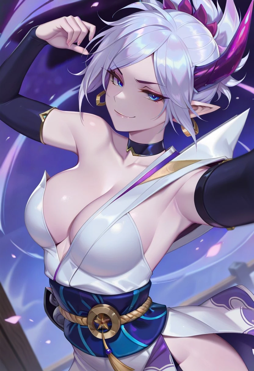 SBriven,white hair,hair ornament,medium hair,horn,pointy ears,blue eyes,choker,asymmetrical clothes,japanese clothes,cleavage,