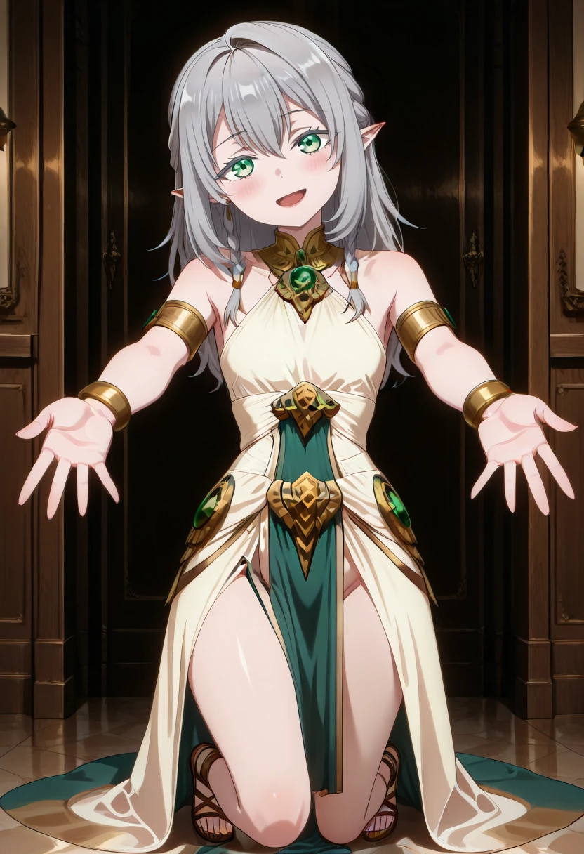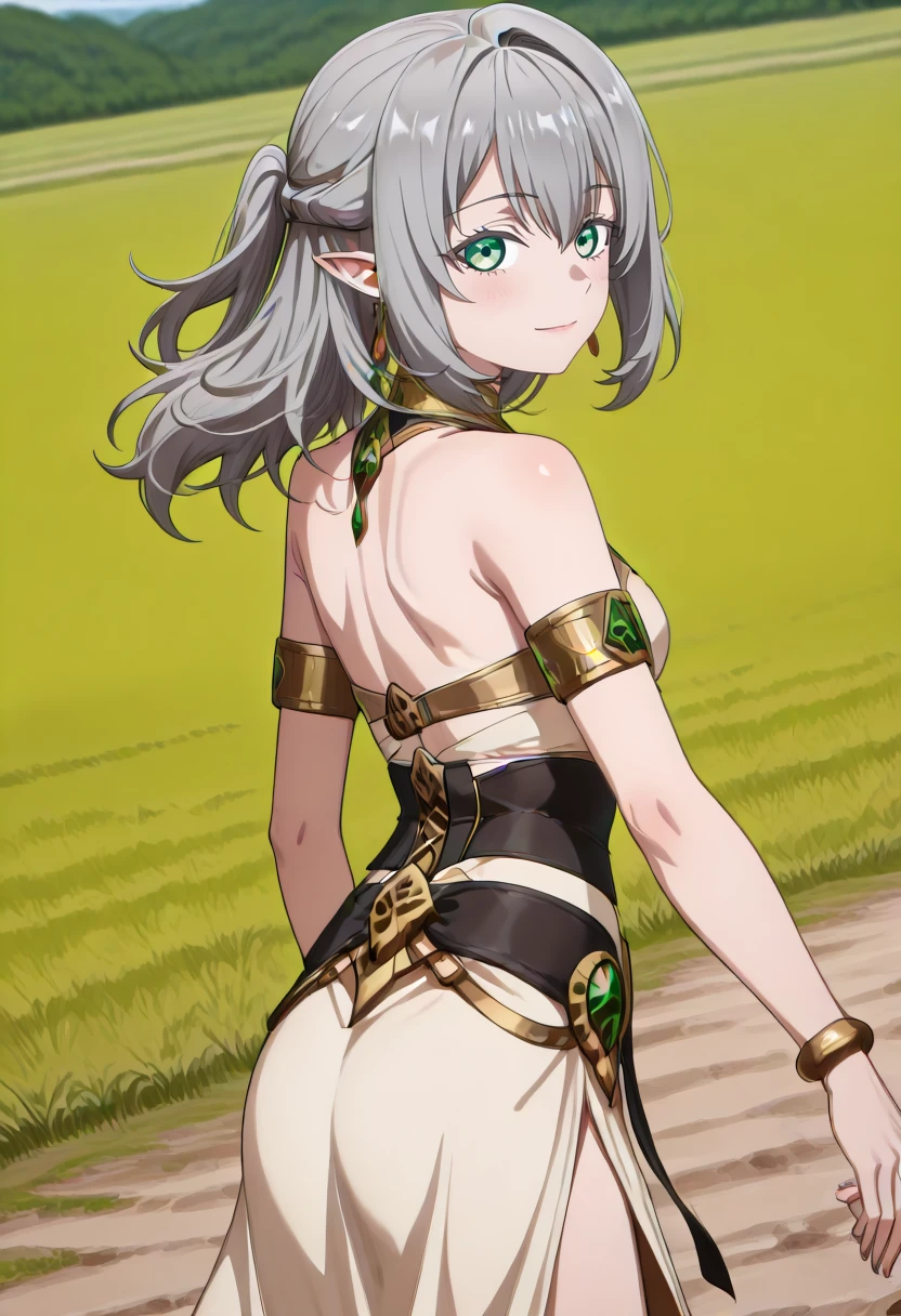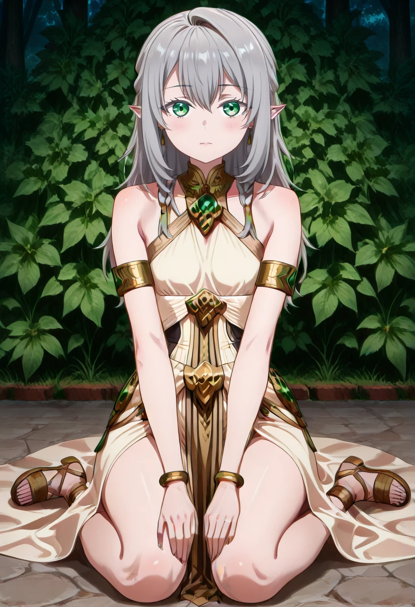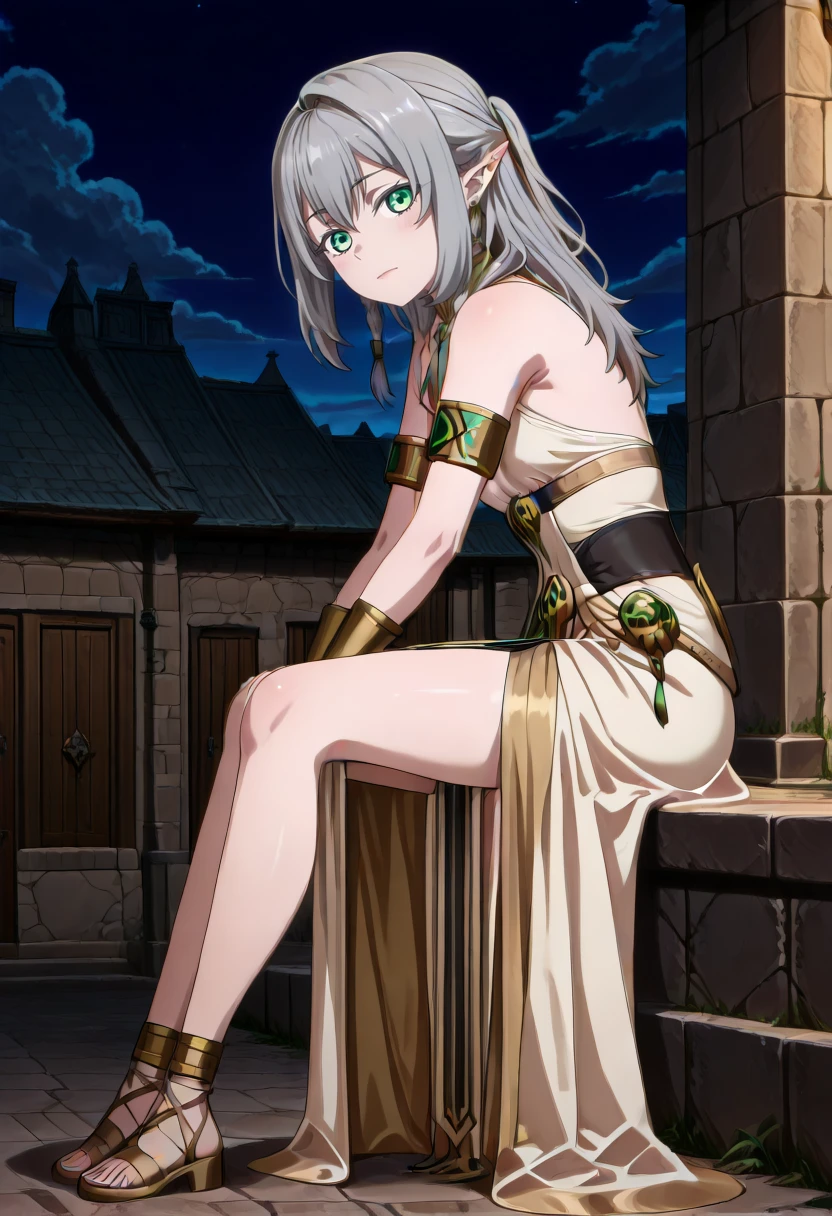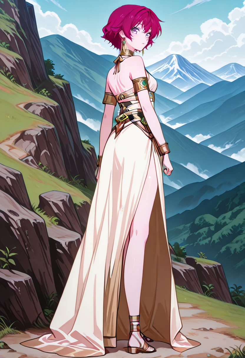 cha16v1,fantasy,white dress,flowing dress,asymmetrical dress,halterneck,gold jewelry,white dress,gold accents,bare shoulder,high leg slit,Closed back skirt,pelvic curtain,sandals,print,anime screencap
