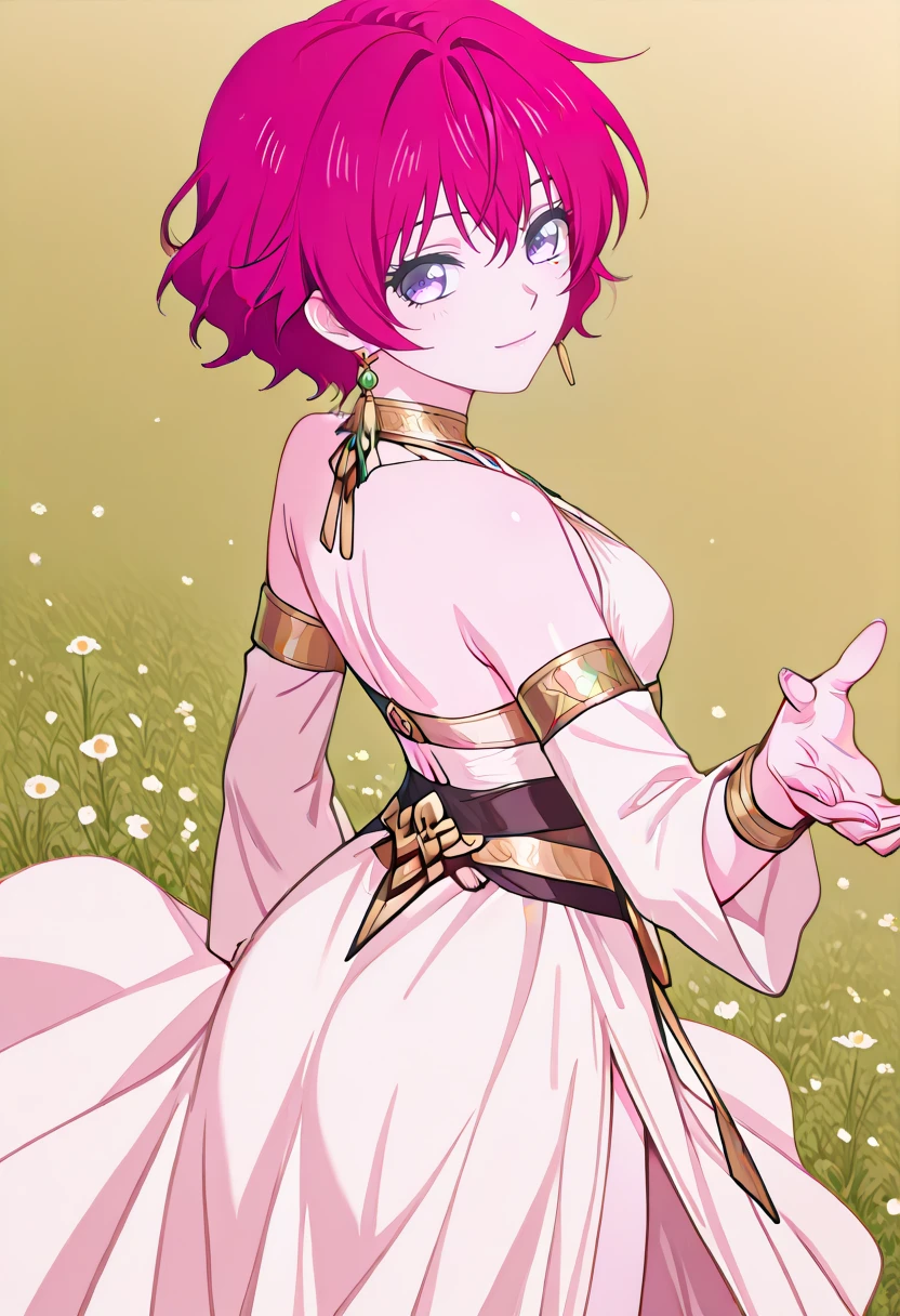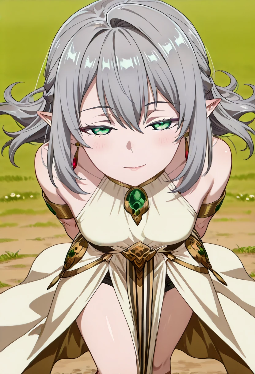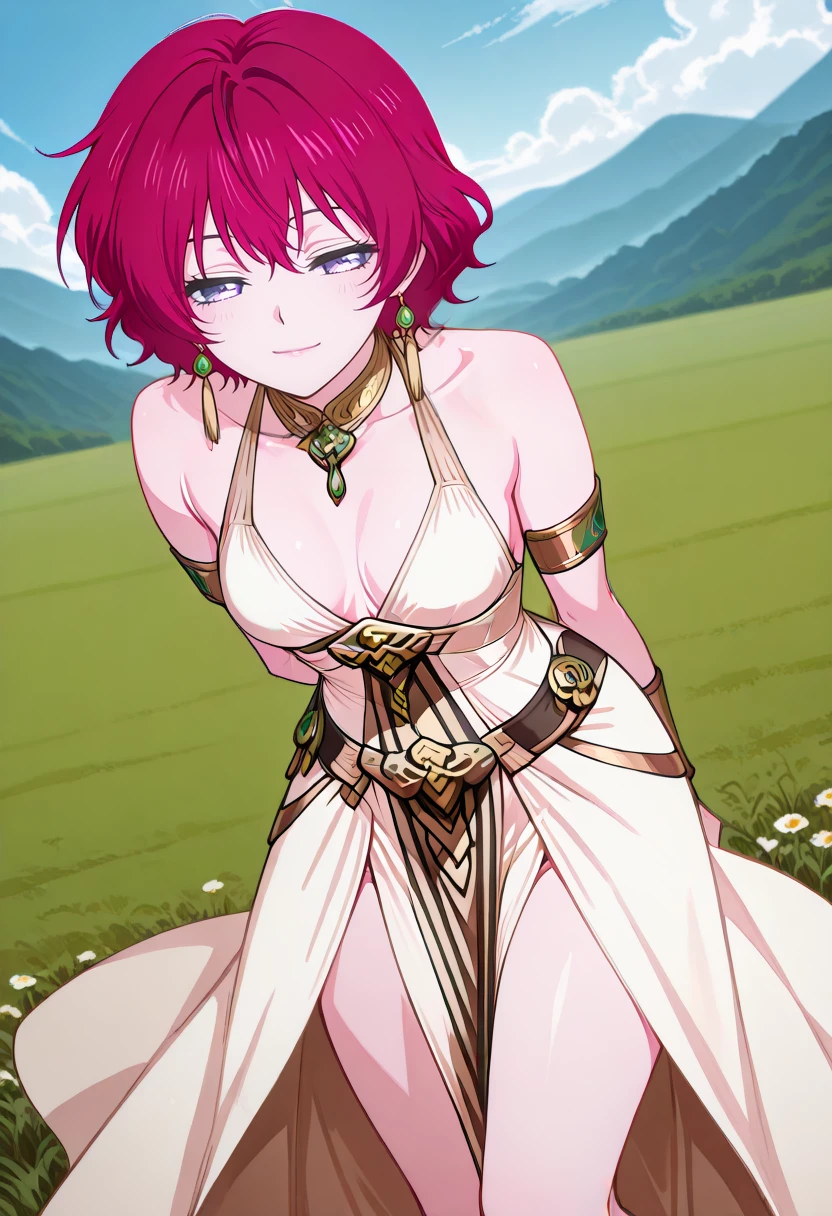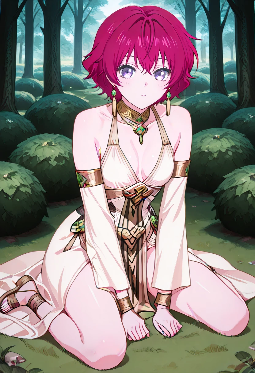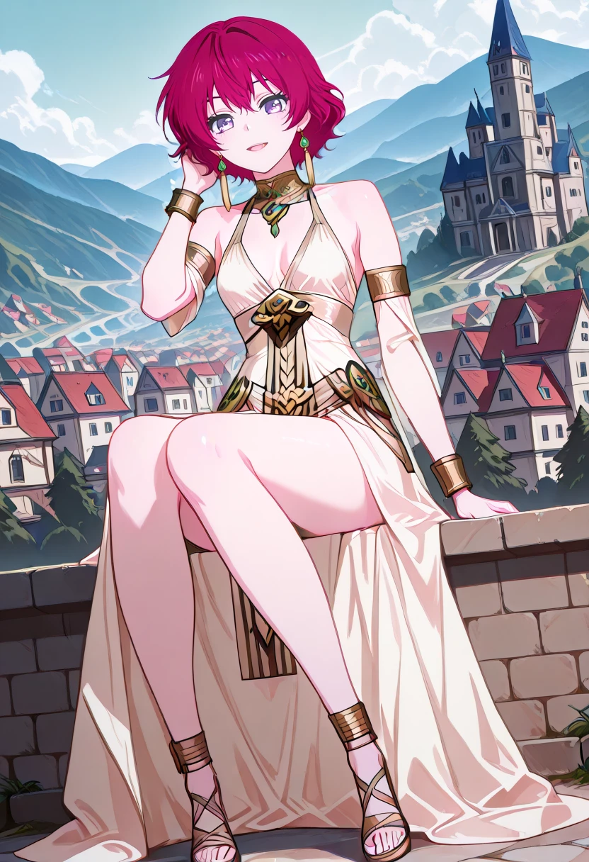cha16v1,fantasy,white dress,flowing dress,asymmetrical dress,halterneck,gold jewelry,white dress,gold accents,bare shoulder,high leg slit,Closed back skirt,pelvic curtain,sandals,print,anime screencap