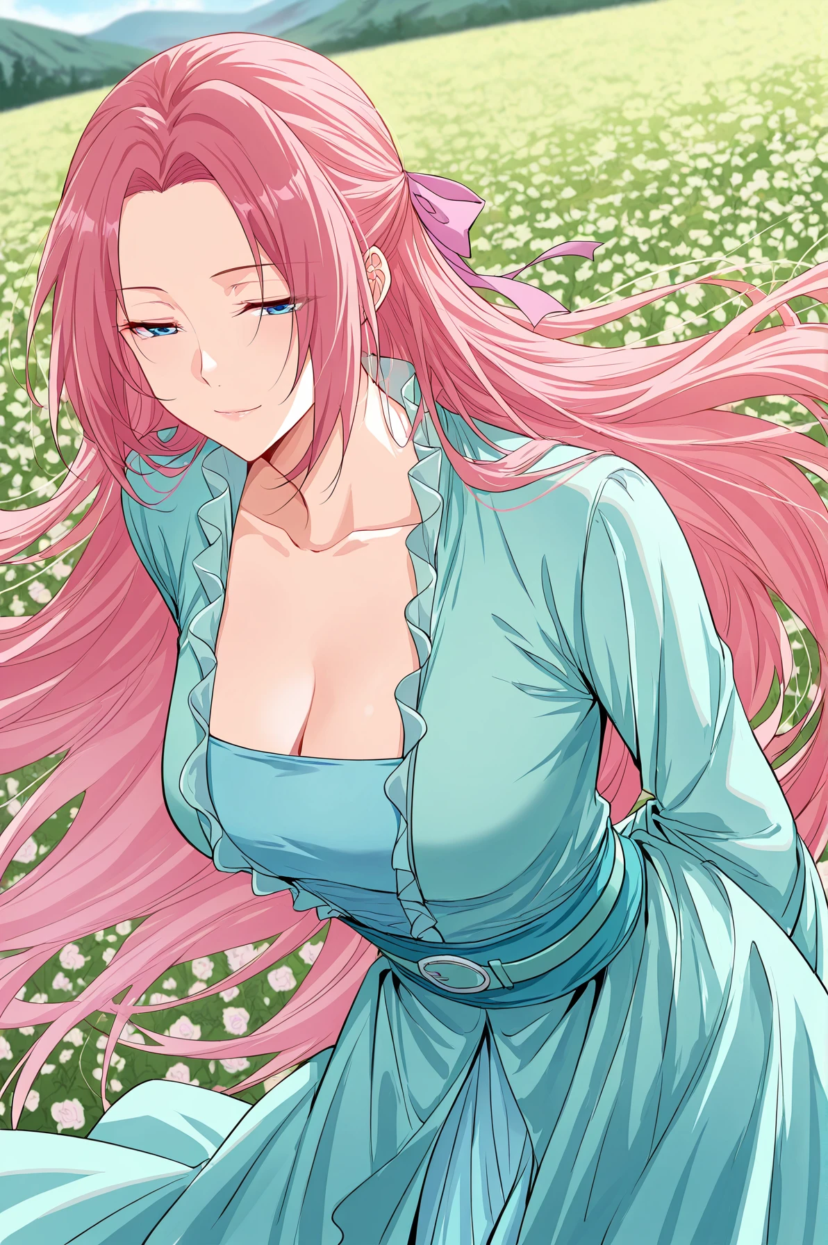 Yunluo, 1girl, solo, blue eyes, light rose hair, long hair, parted bangs, long sidelocks, half updo, pink hair ribbon,