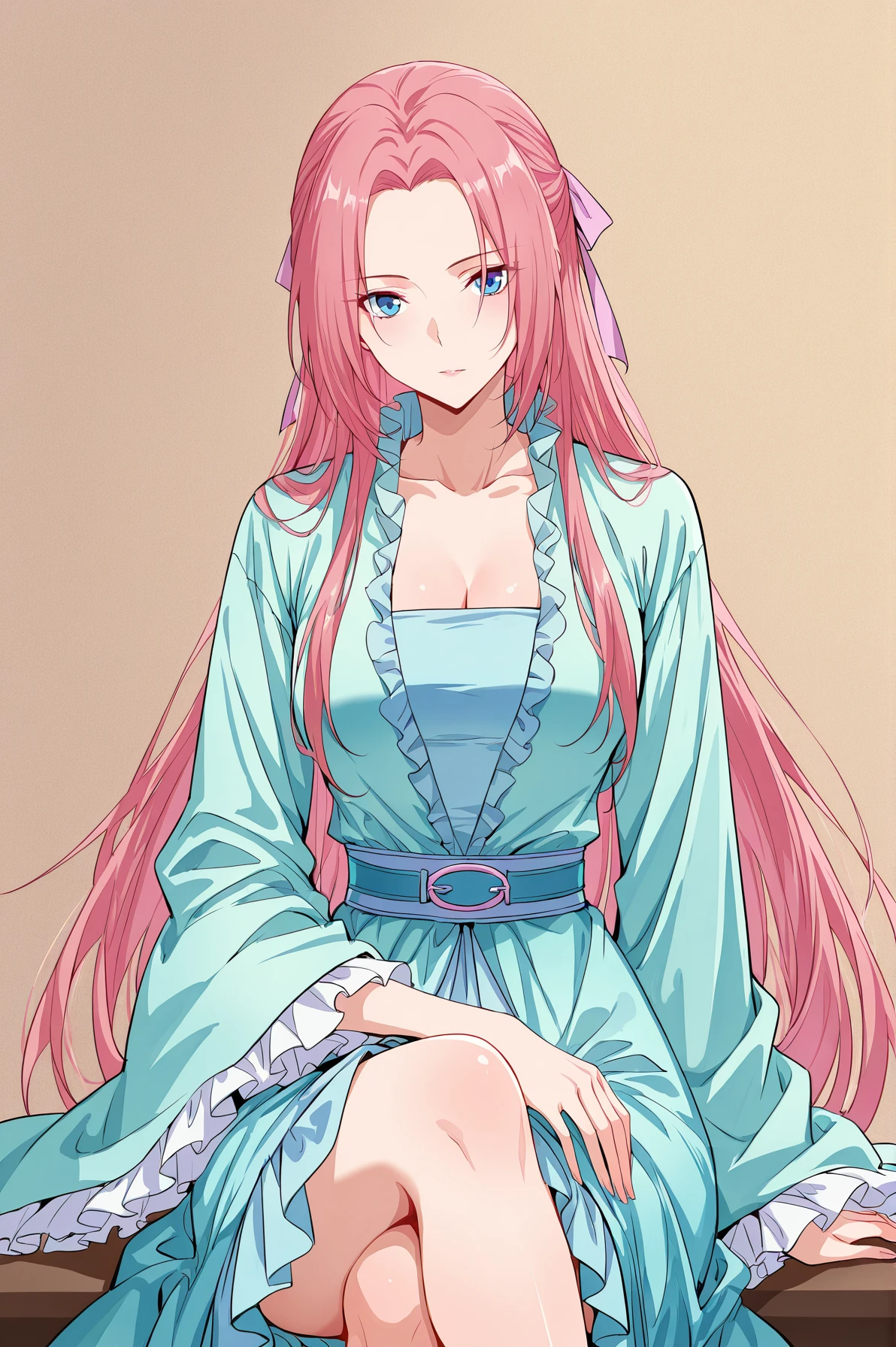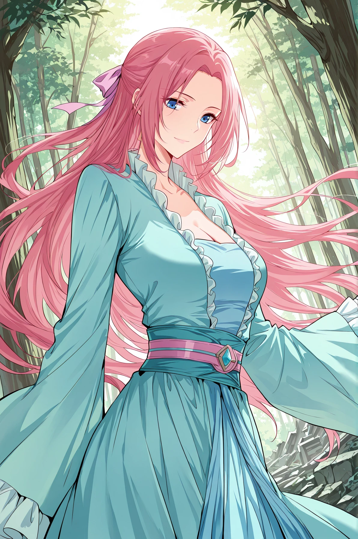 Yunluo_outfit, light blue robe, open robe, ruffled trim, long sleeves, wide sleeves, ruffled cuff, light blue dress, strapless dress, cleavage, blue waist belt, pink waist belt, light blue skirt, long skirt,