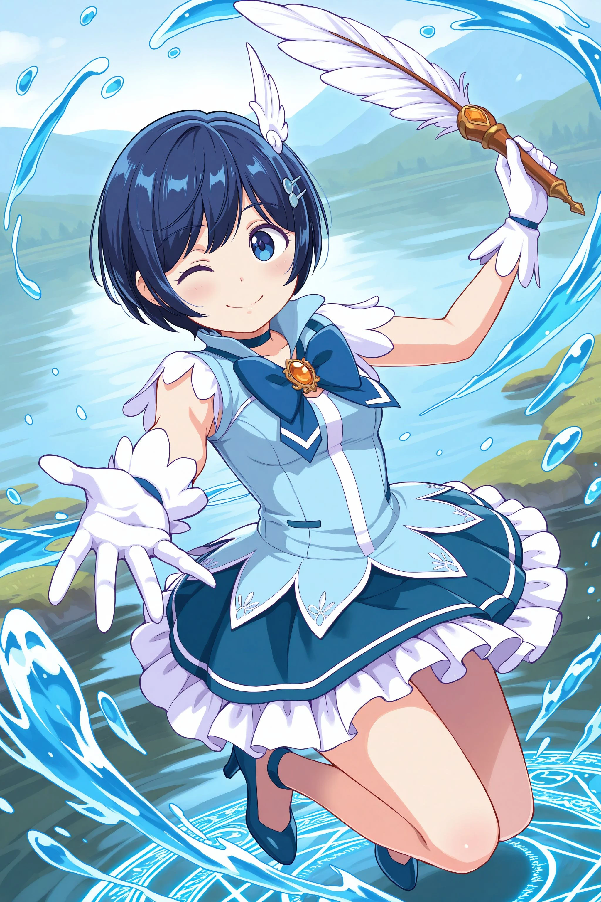 Magica2019: magica2019, wing hair ornament, hairclip, choker, blue dress, blue bowtie, gem, short sleeves, white gloves, plated skirt, frills, blue skirt, blue footwear, high heels