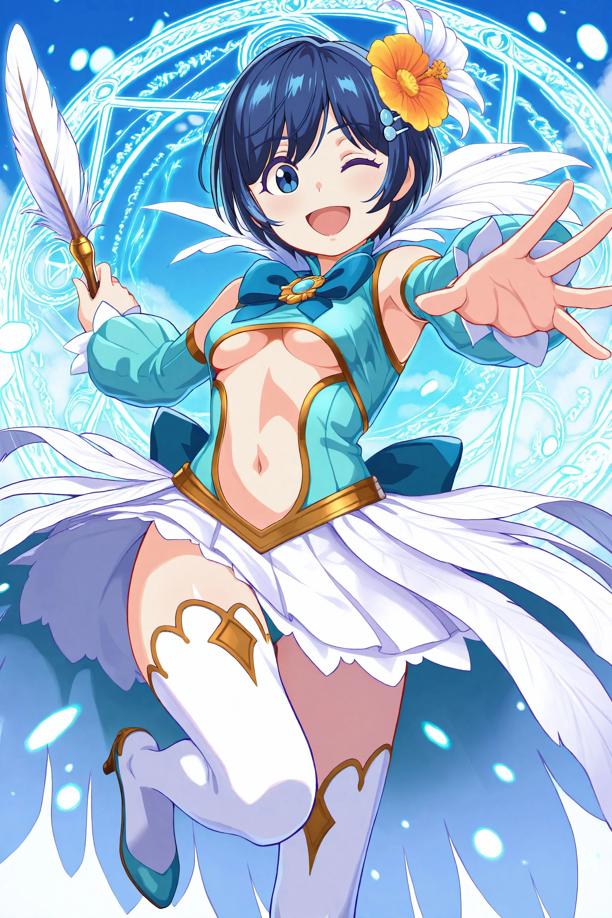 Magica2020Evo: magica2020, hair flower, hairclip, aqua dress, blue bowtie, brooch, clothing cutout, underboob, navel, detached sleeves, long sleeves, white thighhighs, thigh boots, high heels, flower,
