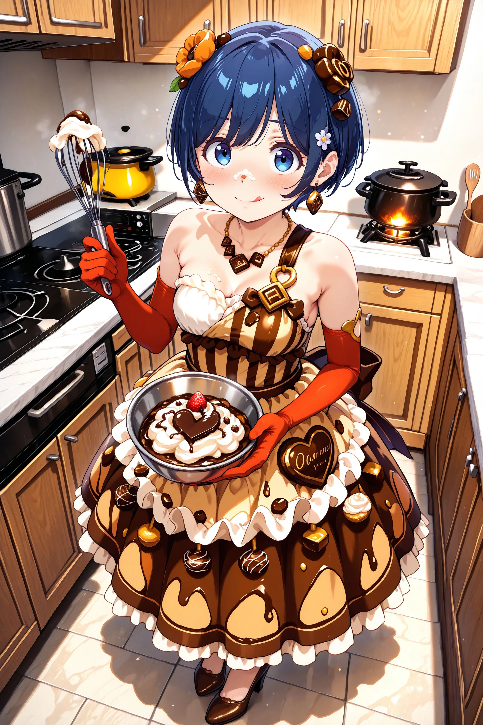 MeltyChocola: meltychocola, food-themed clothes, hair ornament, hair flower, heart, roze, earrings, necklace, jewelry, brown dress, single strap, bare shoulders, clothing cutout, elbow gloves, brown skirt, long skirt, layered skirt, brown footwear, high heels,