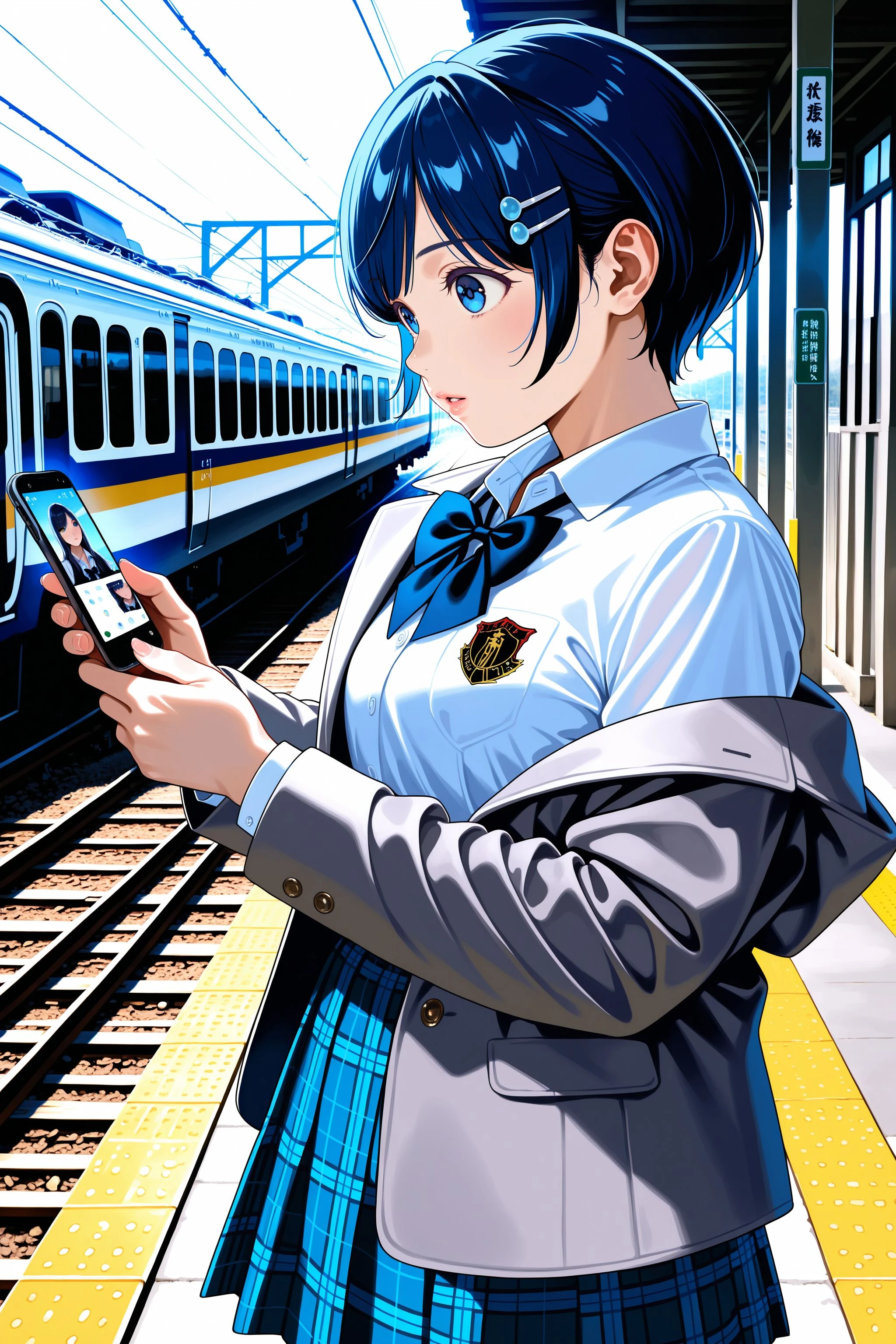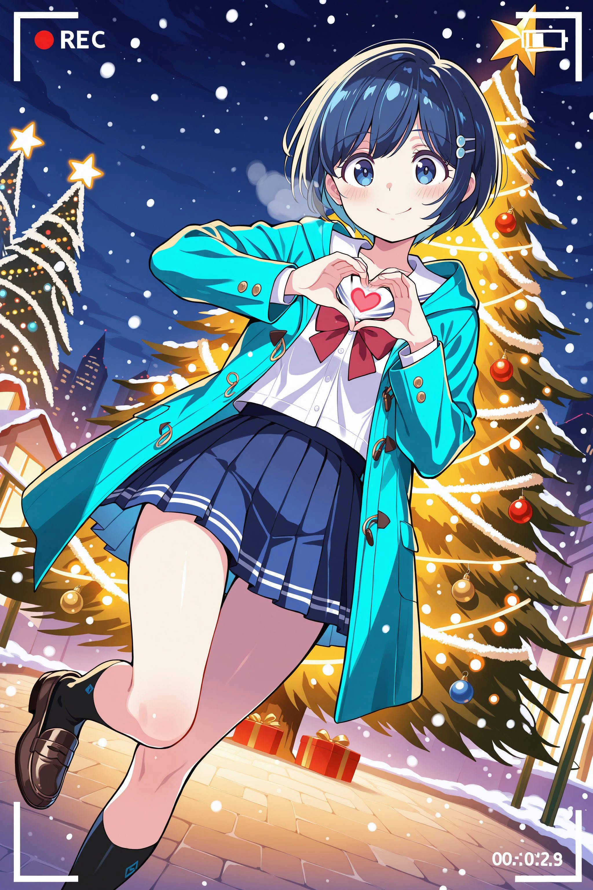SchoolUniform: school uniform, hairclip, white sailor collar, white shirt, long sleeves, red bowtie, pleated skirt, blue skirt, black socks, loafers