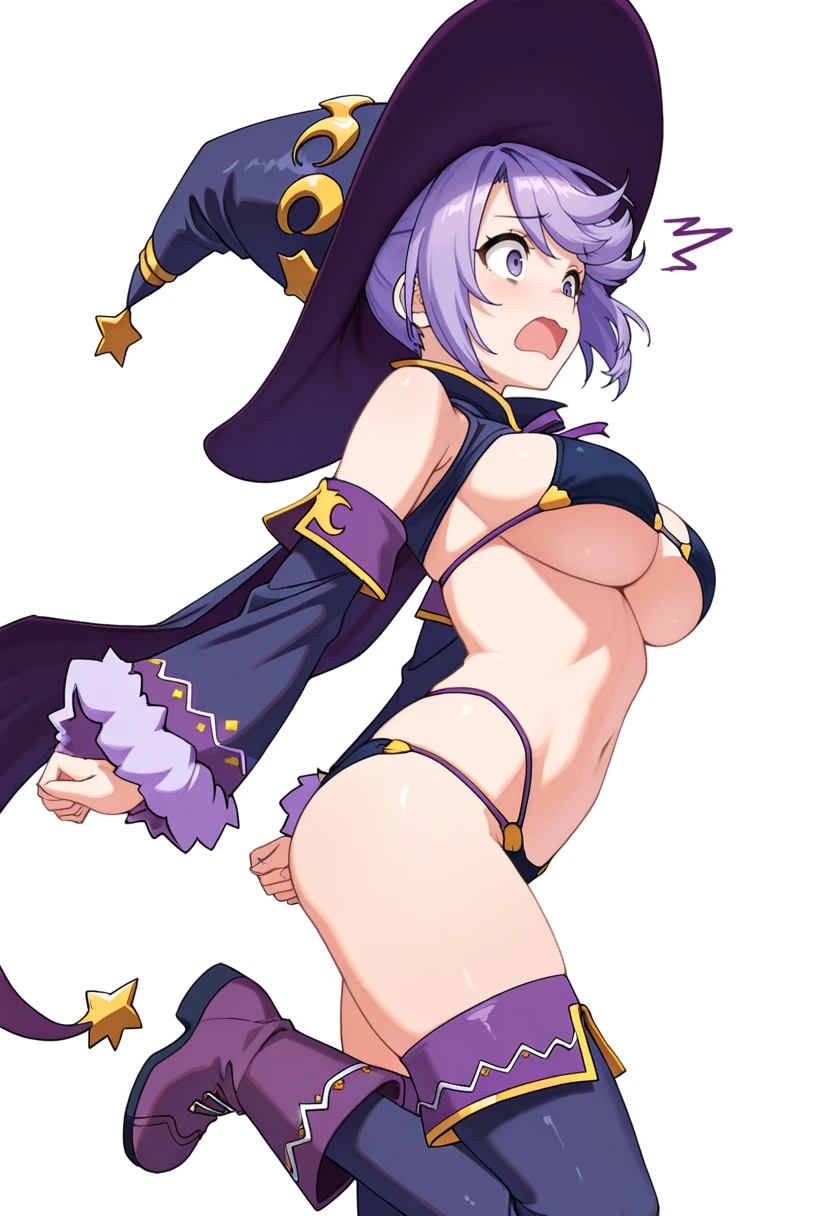 witch hat, detached sleeves, shoulders, , navel, cape, thighhighs, underboob,boots,