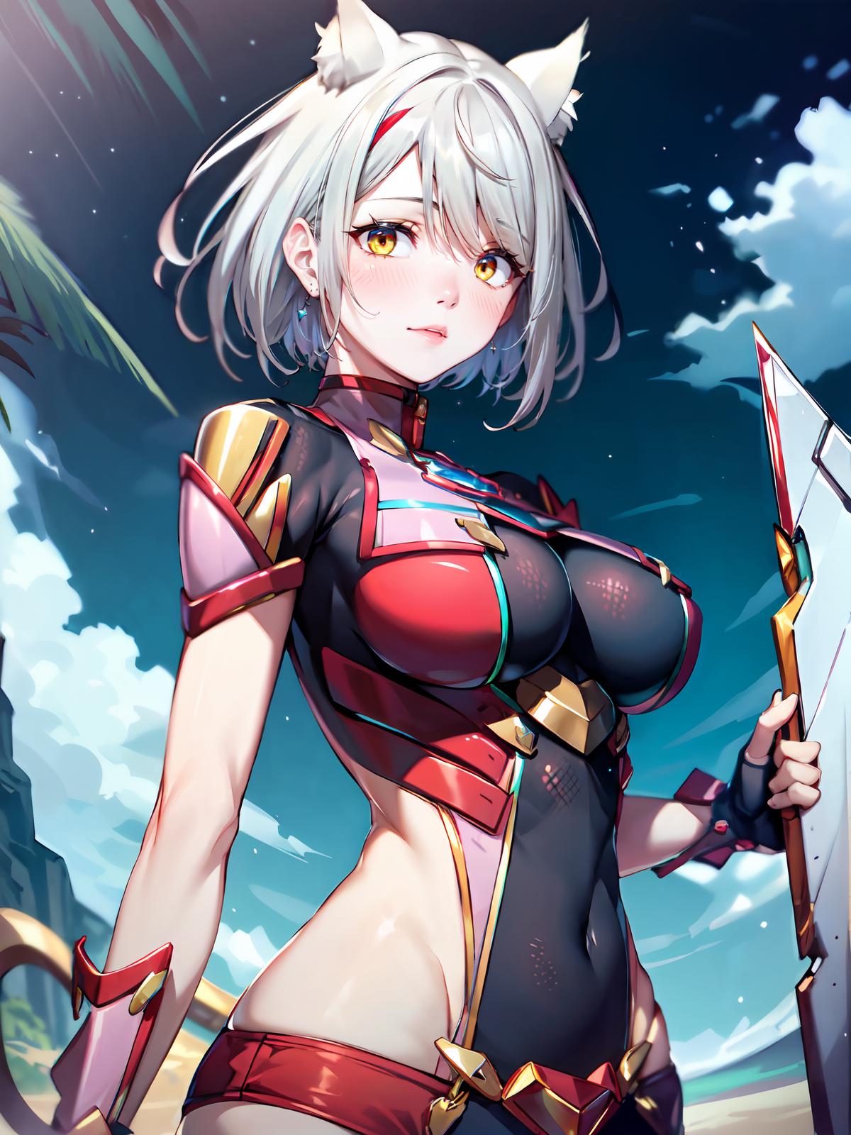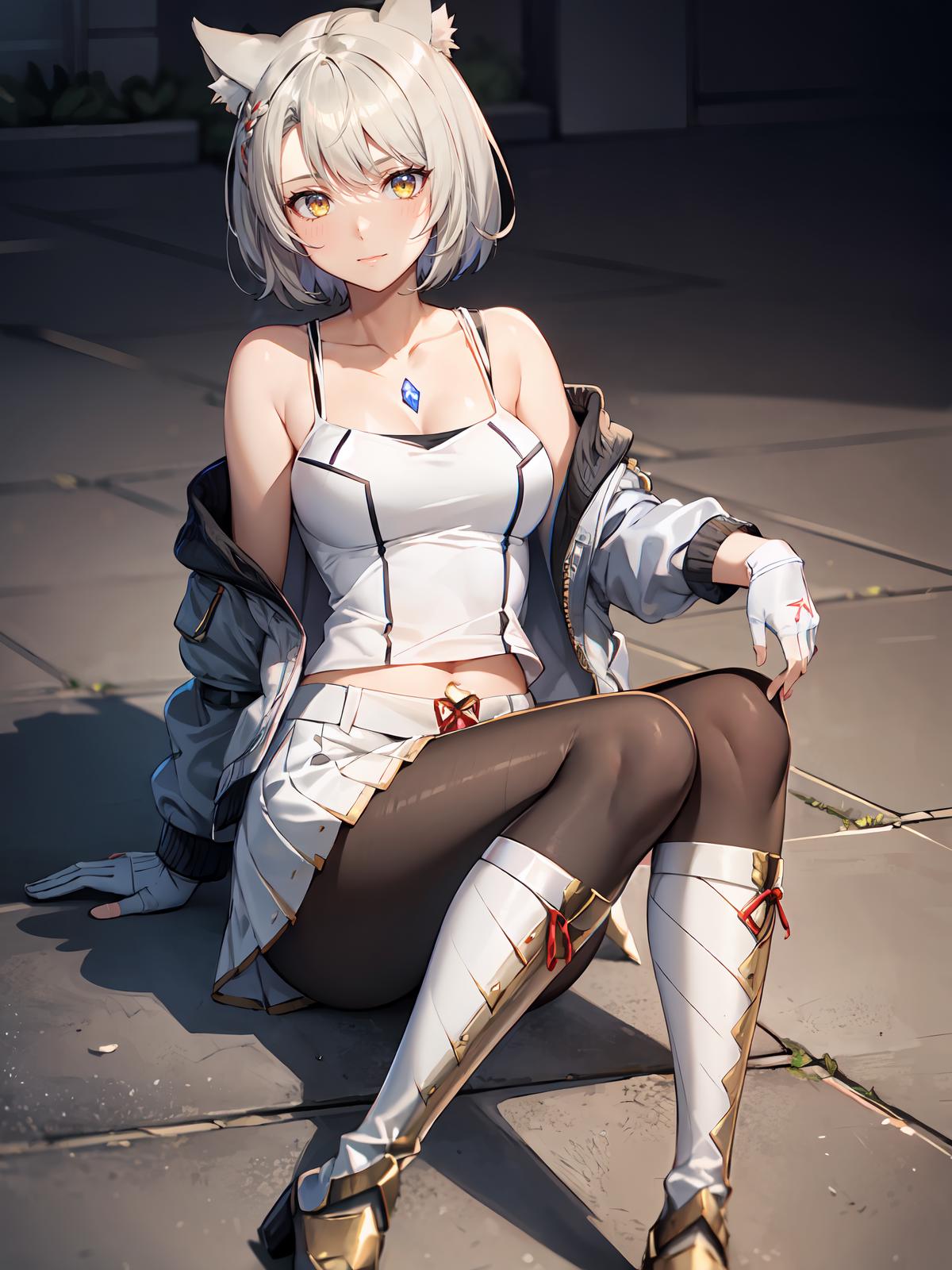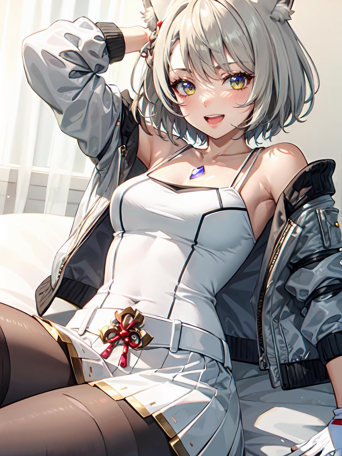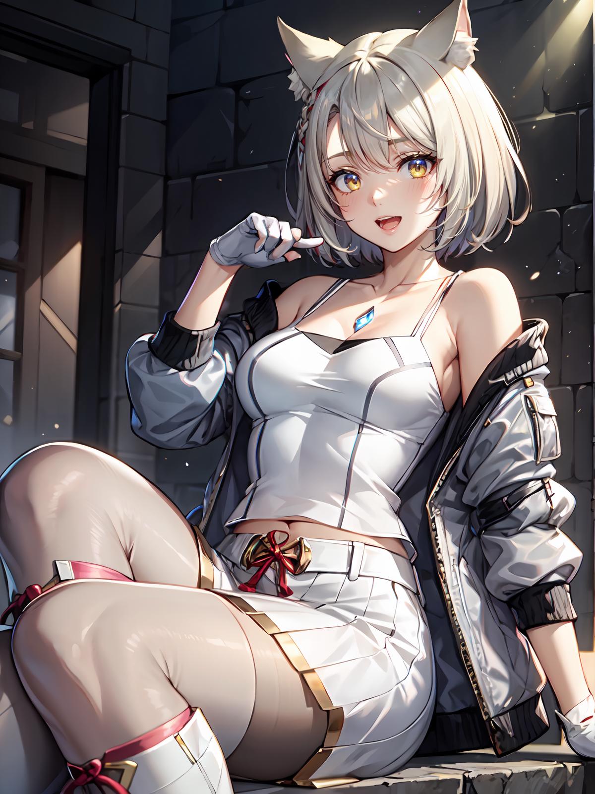 Prompts: medium breast,knee boots,collarbone,open jacket,white gloves,boots,fingerless gloves,grey white hair,bangs,shoulder strap, pantyhose, white jacket,pleated skirt leggings, white skirt,tank top,short hair, white camisol, chest jewel,camisole, white tank top,cat ears,