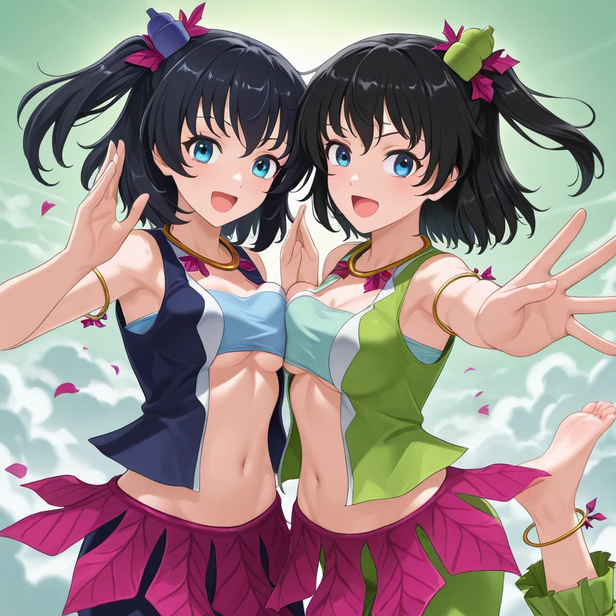 fifth-sis, cyan gourd, cyan gourd on head, cyan vest, pink leaf skirt, cyan pants, short hair, side ponytail, black hair, blue eyes, ???? feet, armlets, anklets, necklace, navel, blue bandeau