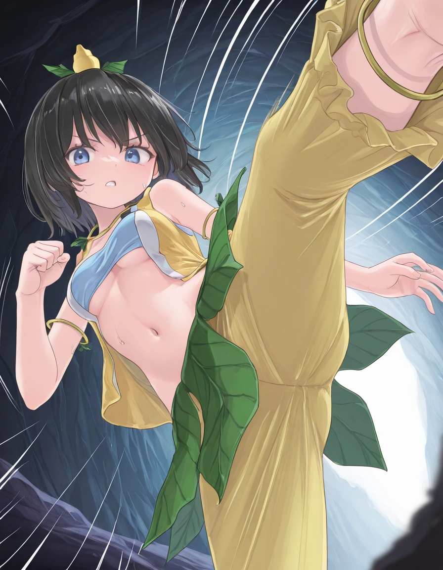 third-sis, yellow gourd, yellow gourd on head, yellow vest, green leaf skirt, yellow pants, short hair, black hair, blue eyes, ???? feet, armlets, anklets, necklace, navel, blue bandeau