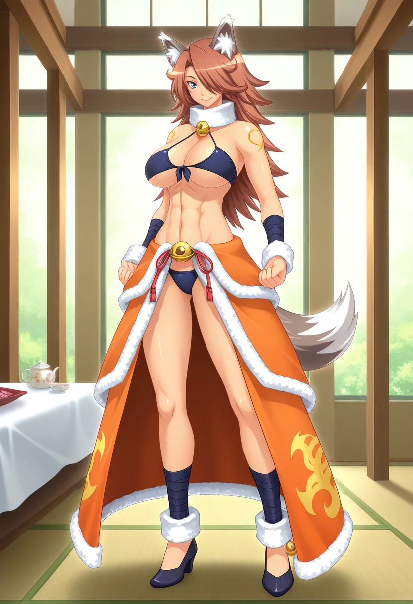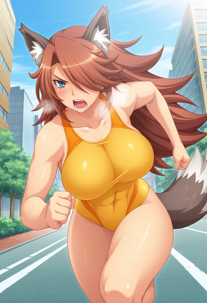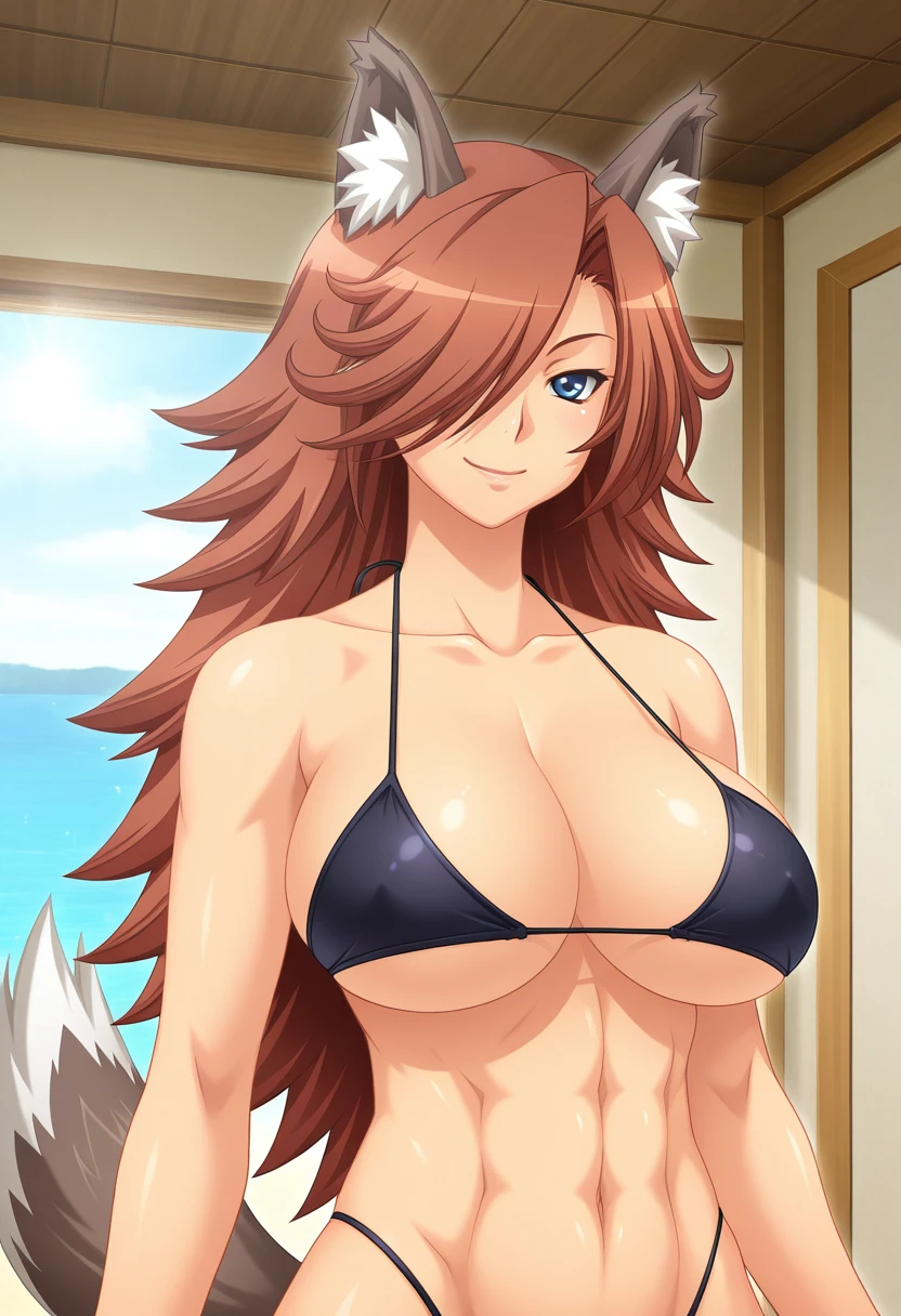 hekaterinaww, toned female, mature female, wolf ears, wolf tail, blue eyes, brown hair, long hair, hair over one eye, large breasts,