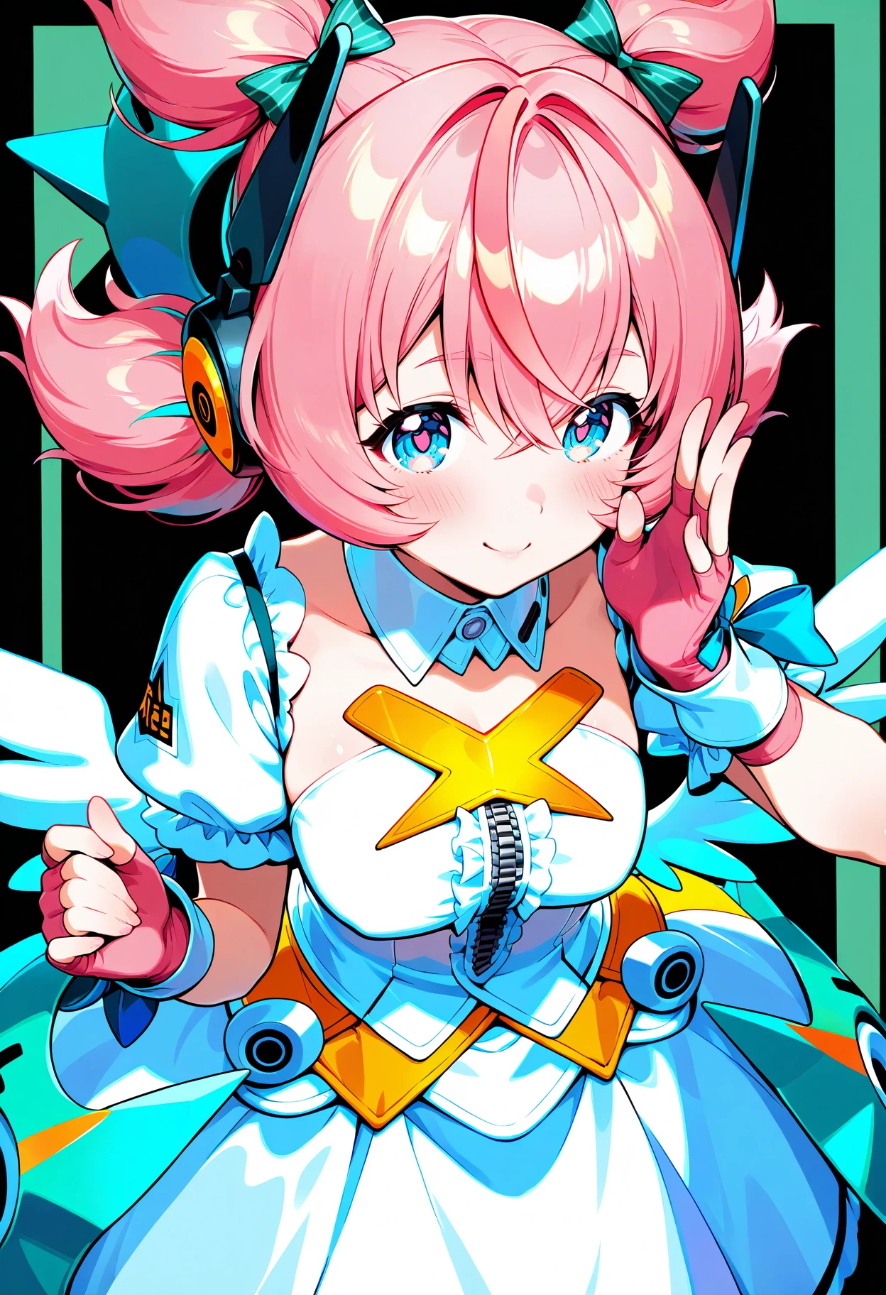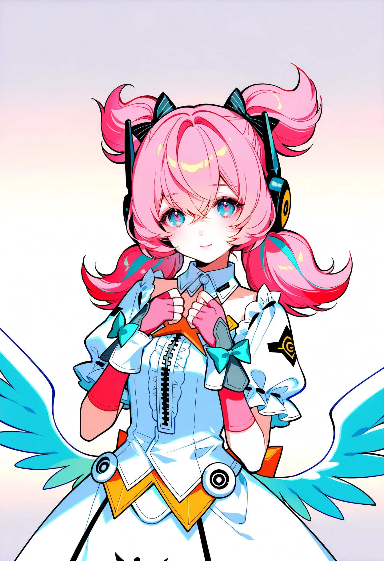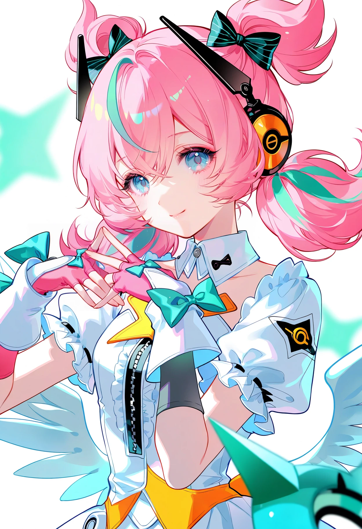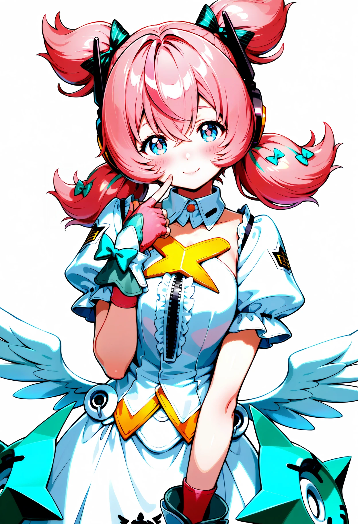 aria,star eyes,gloves,fingerless gloves,wings,smile,looking at viewer,twintails,simple background,low wings,bow,white dress,puffy short sleeves,hair bow,hair between eyes,short twintails,headphones,detached collar,pink gloves,blush,frills,feathered wings,center frills,symbol-shaped pupils,zipper,green decoration