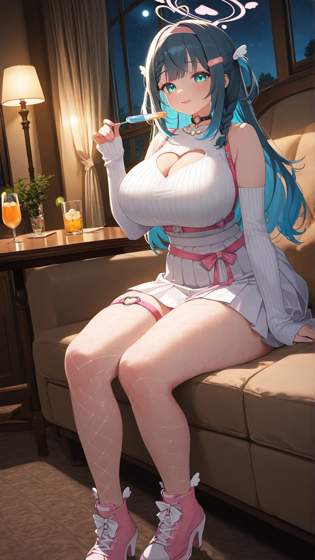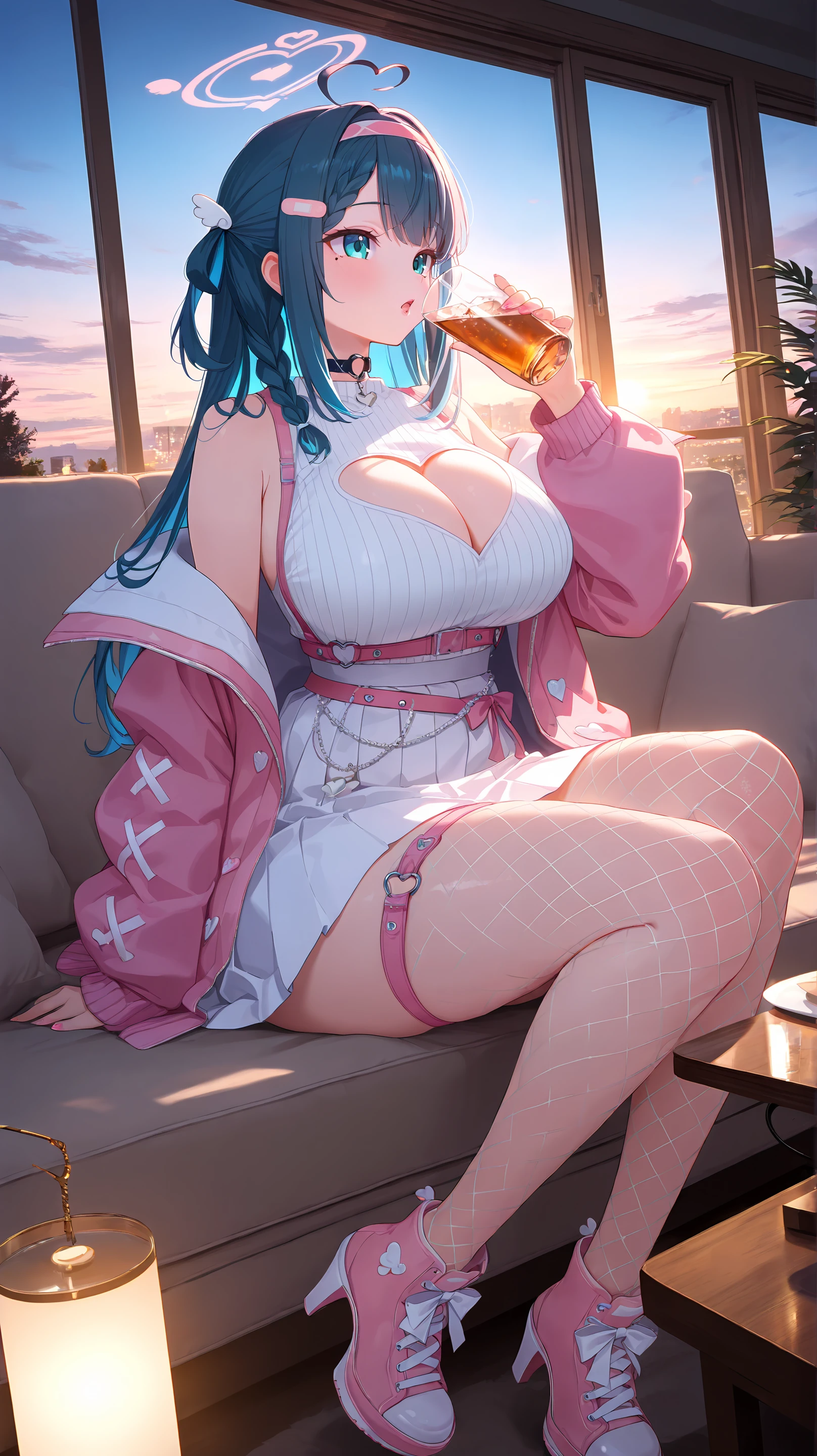 Nene Amano, virtual youtuber 1girl, solo blue eyes, aqua eyes, (blue hair, :1.1) (black hair, :0.7) bangs, ahoge, heart ahoge, halo, mole, multicolored hair, Bandaid on hair, long hair, braid, two side up, hair ornament, wing hair ornament, hairband, , , thick thighs, wide , glossy nails, glossy lips, lipgloss, pink fingernails, nail polish, black o-ring choker, choker, necklace, bow, pink bow, cleavage, cleavage cutout, heart cutout, clothing cutout, shoulders, dress, white dress, frills, sweater, white sweater, skirt, white skirt, pleated skirt, fishnets, thigh squish, thigh strap, pink belt, jacket, pink jacket, open jacket, , sleeveless, long sleeves, shoes, sneakers, pink footwear, footwear bow, footwear heels.,