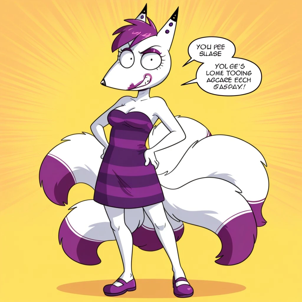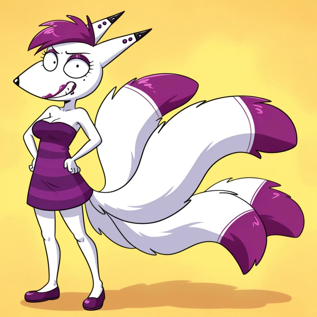 kitsune, fox, fox girl, arctic fox, white fur, purple hair, black eyes, makeup, purple eyeshadow, purple lipstick, black nose, fox ears, black ear tips, purple ear piercings, multiple tails, three fox tails, purple tail tips, medium breasts, shortstack, purple and black striped dress, strapless,