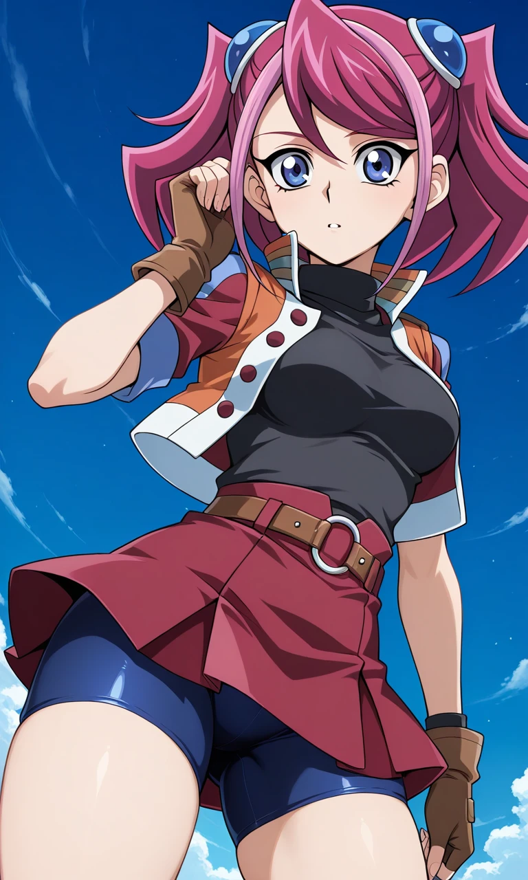Hiiragi Yuzu (YU-GI-OH! ARC-V), blue eyes, hair ornament, blue hairclips, medium hair, multicolored hair, pink hair, streaked hair, twintails, medium breasts, thighs, black shirt, red jacket, single glove, fingerless gloves, brown gloves, buttons, belt, o-ring, shorts under skirt, red skirt, bike shorts