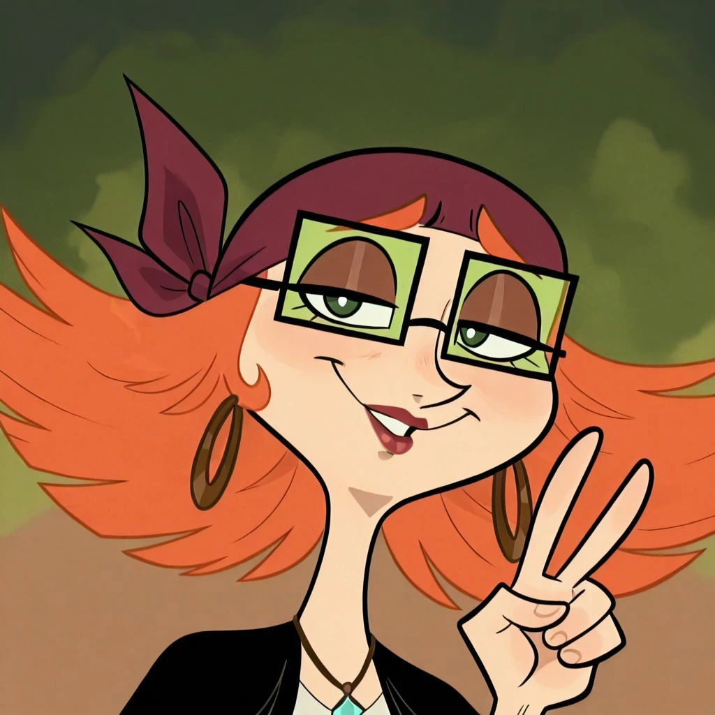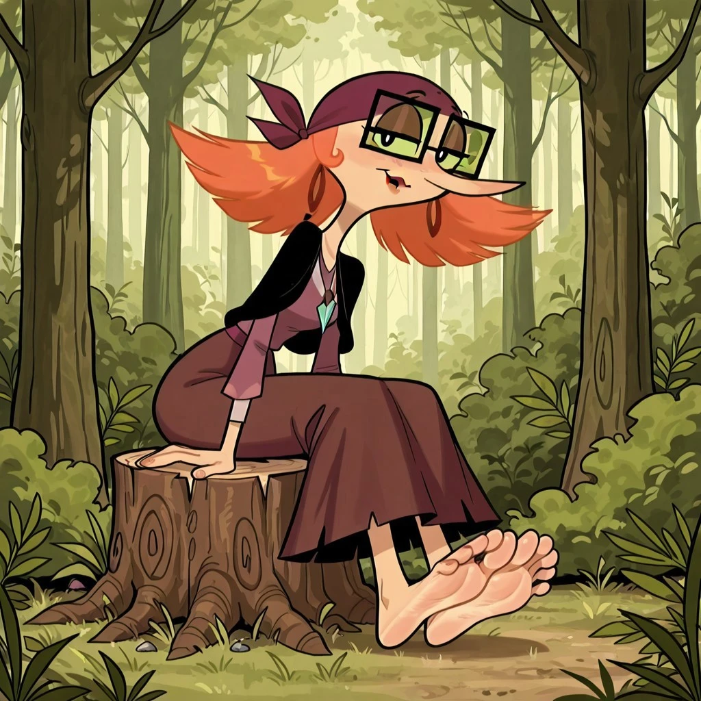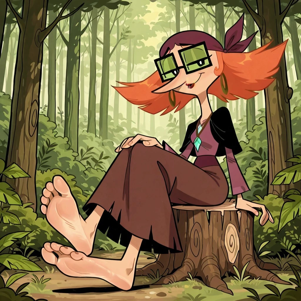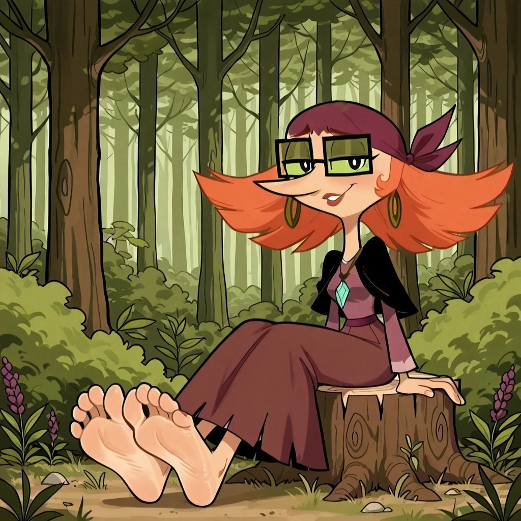 human female, solo, pale skin, orange hair, wide pointed hair, long nose, plum colored bandana, black square glasses, green opaque lenses, black pupils, lipstick, black shawl, brown hoop earrings, blue crystal necklace, plum skirt, dark lavender shirt, barefeet,