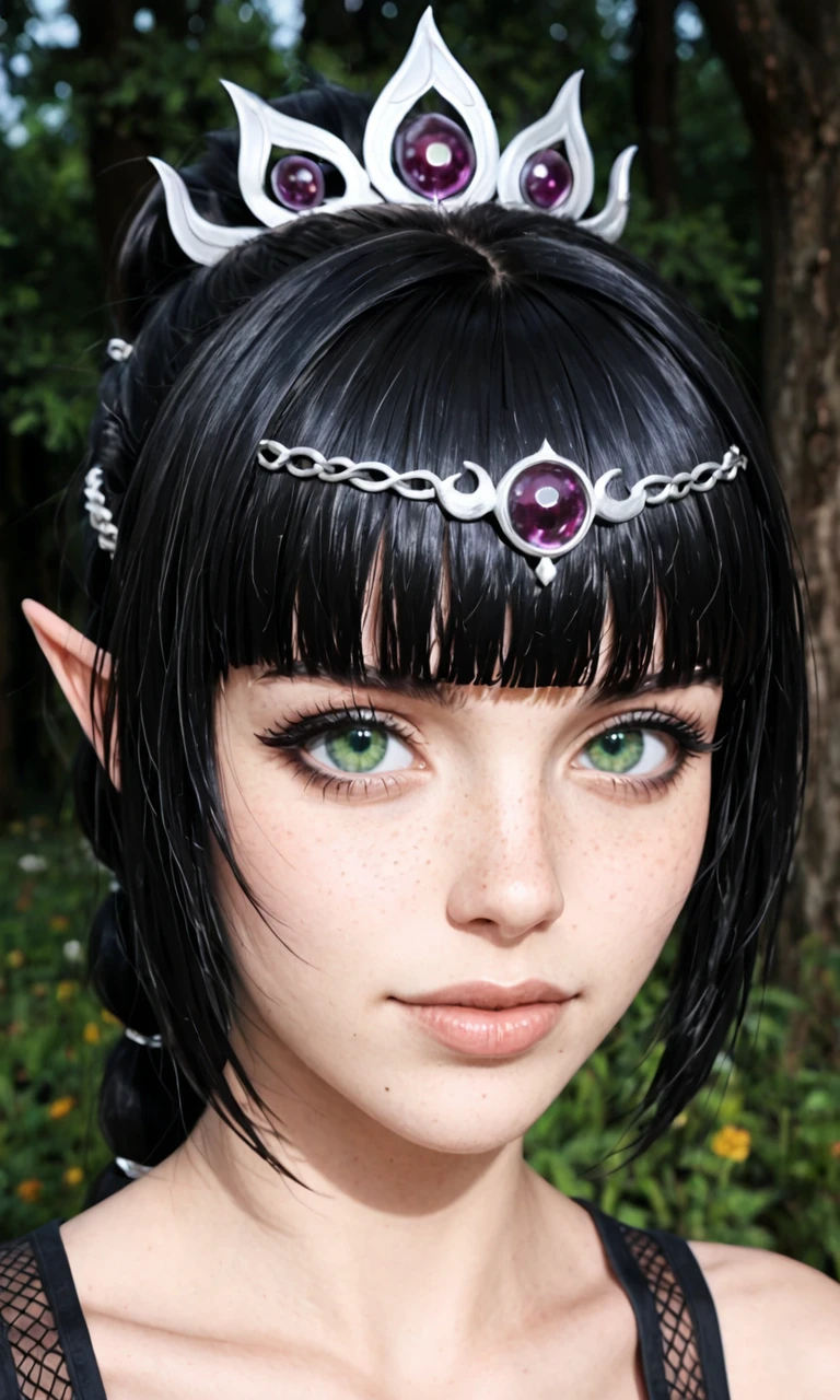 shadowheart_\(baldur's gate\), black hair, green eyes, pointy ears, blunt bangs, hair ornament, braid ponytail, long hair, tiara, purple gem, multi-tied hair, black shirt, sleeveless shirt, cleavage, center opening, multi-tied hair, black pants