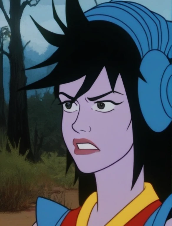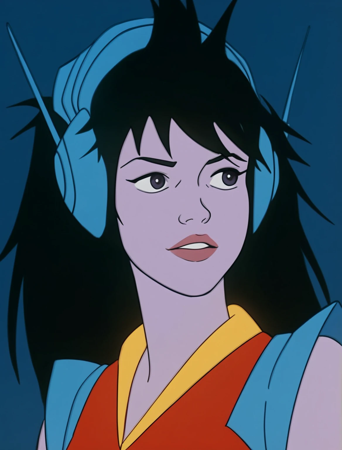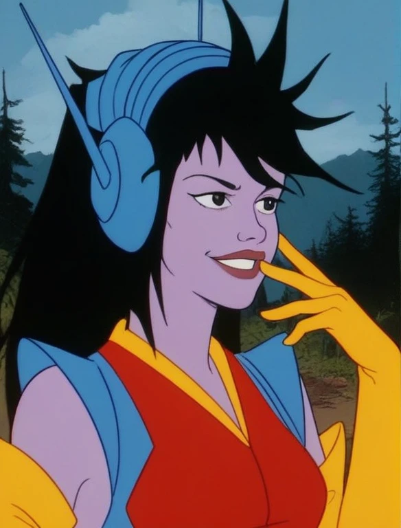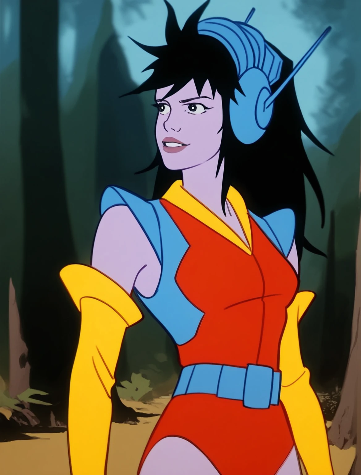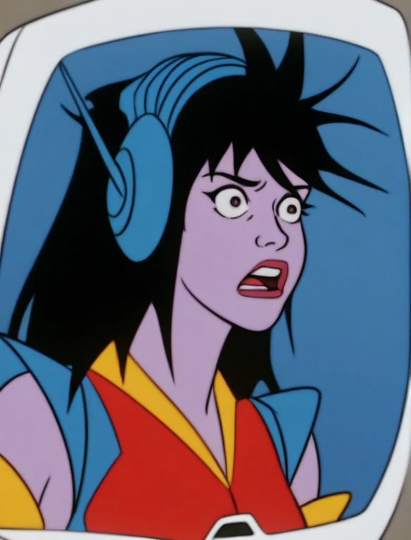 purple skin, dark eyes, long messy hair, black hair, blue headset, smirk, red futuristic leotard, blue shoulder pads, yellow rubber gloves, belt, shoes, etc etc etc.