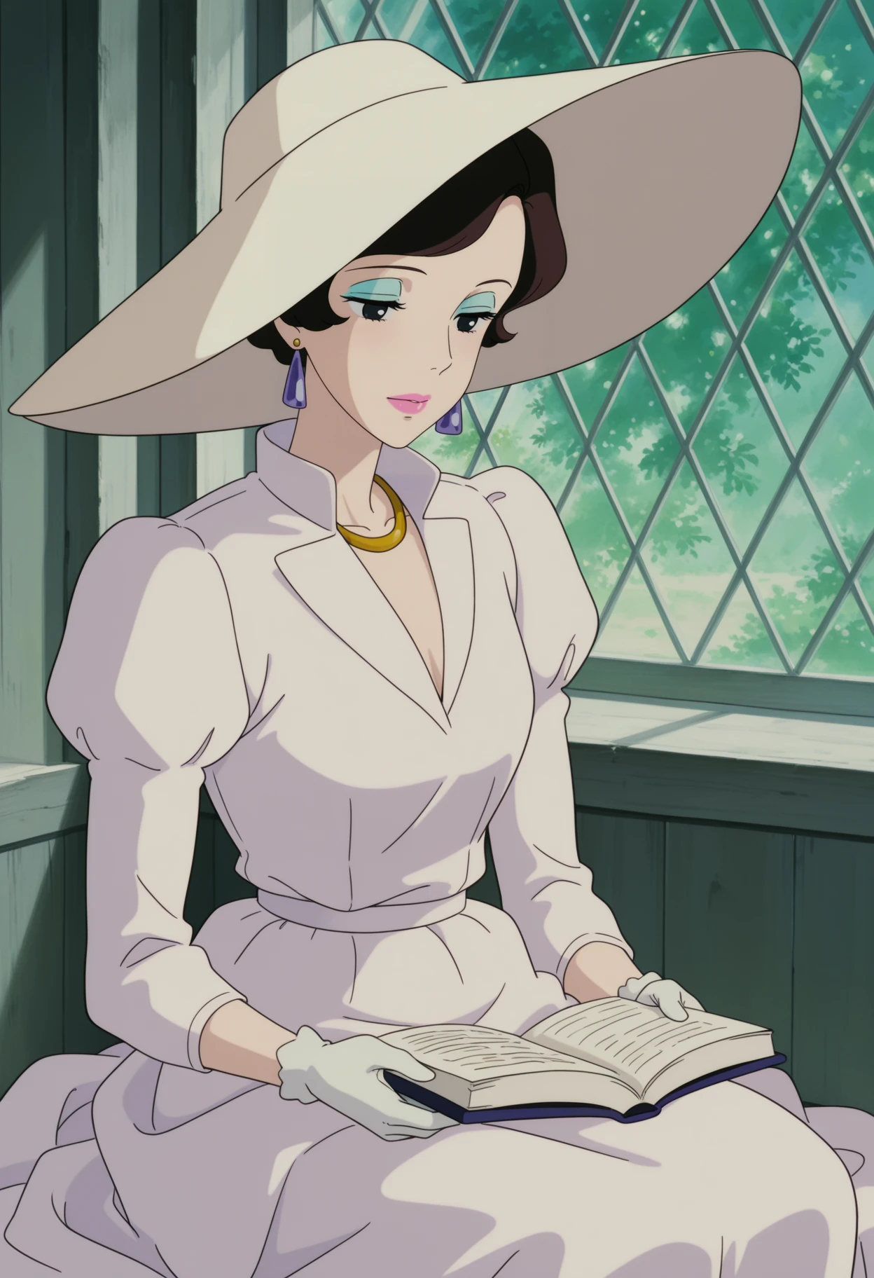 sun hat,white dress,puffy sleeves,juliet sleeves,gold necklace,purple earrings,white gloves,white thighhighs,white footwear,high heels