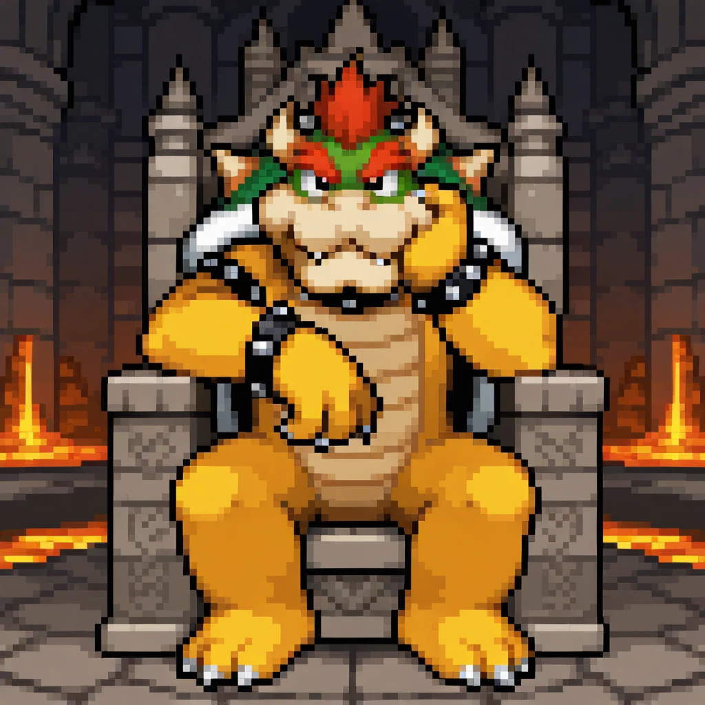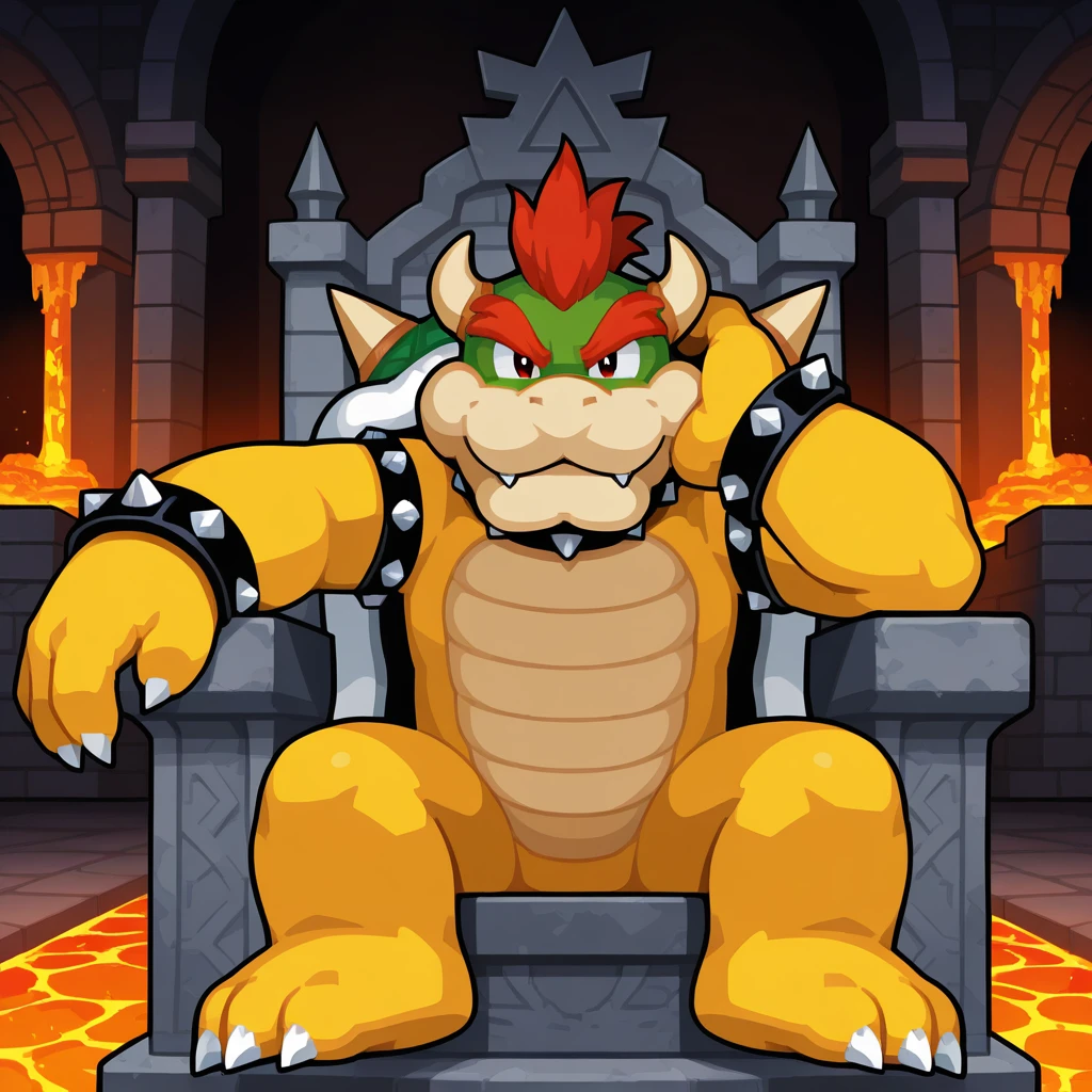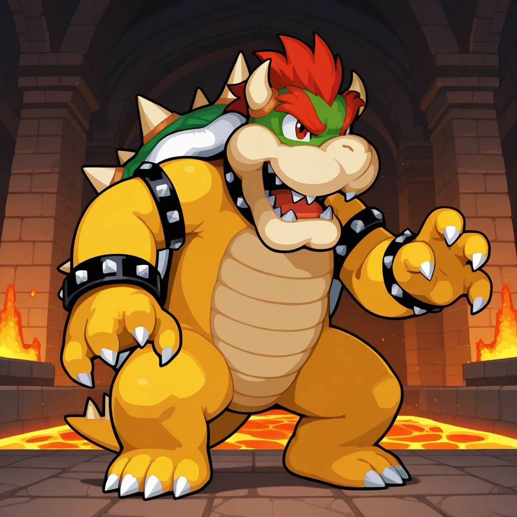 Bowser: bowseris, bowser, red hair, horns, sharp teeth, spiked collar, green spiked shell, spiked bracelet, spiked armlet, claws, spiked tail, yellow scales, yellow body