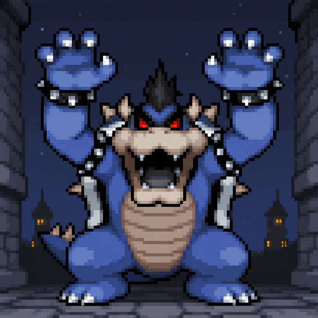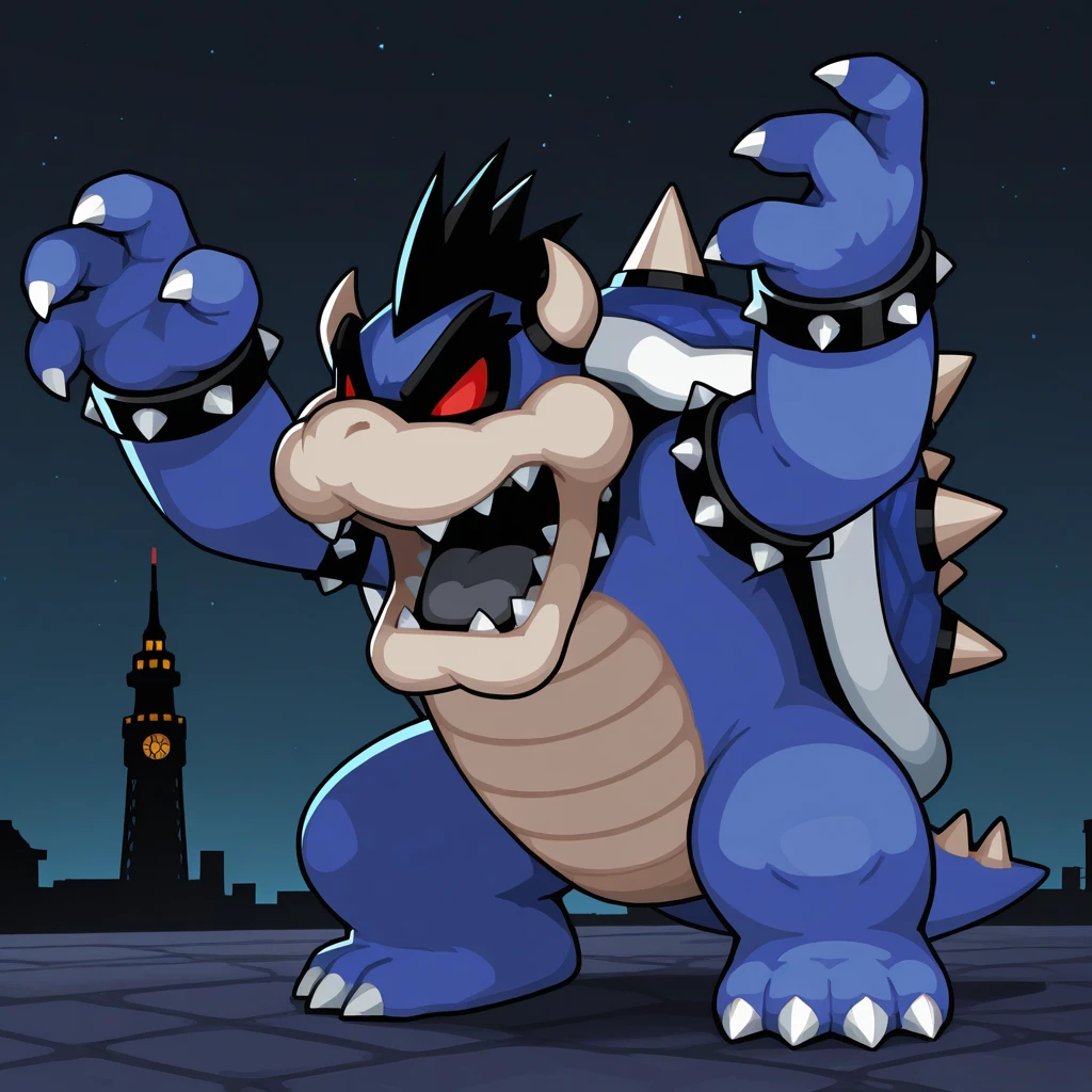 Dark Bowser: bowseris, dark bowser, black hair, spiked hair, horns, sharp teeth, grey tongue, spiked collar, blue spiked shell, spiked armlet, spiked bracelet, spiked tail, claws, blue scales, blue body