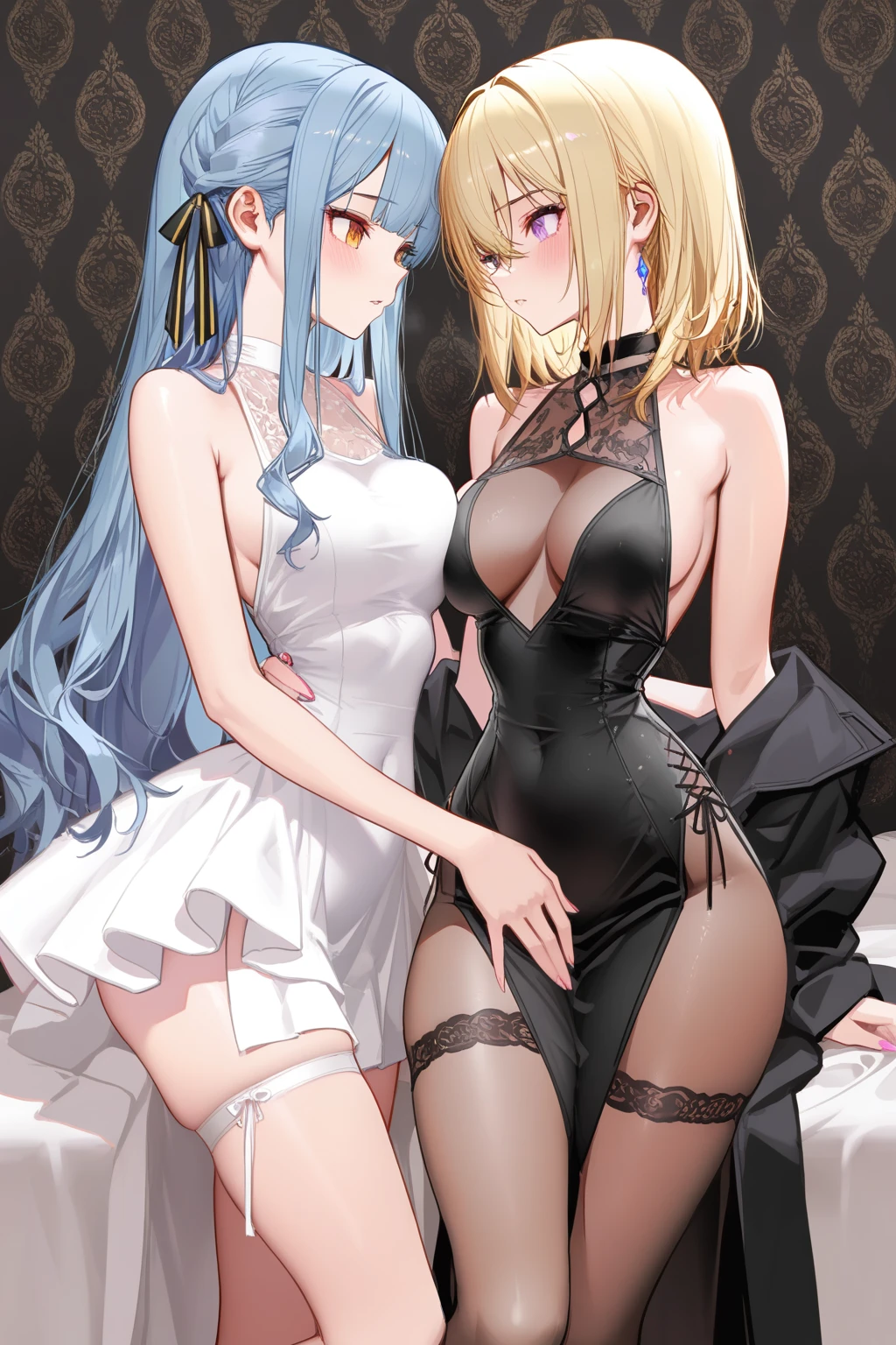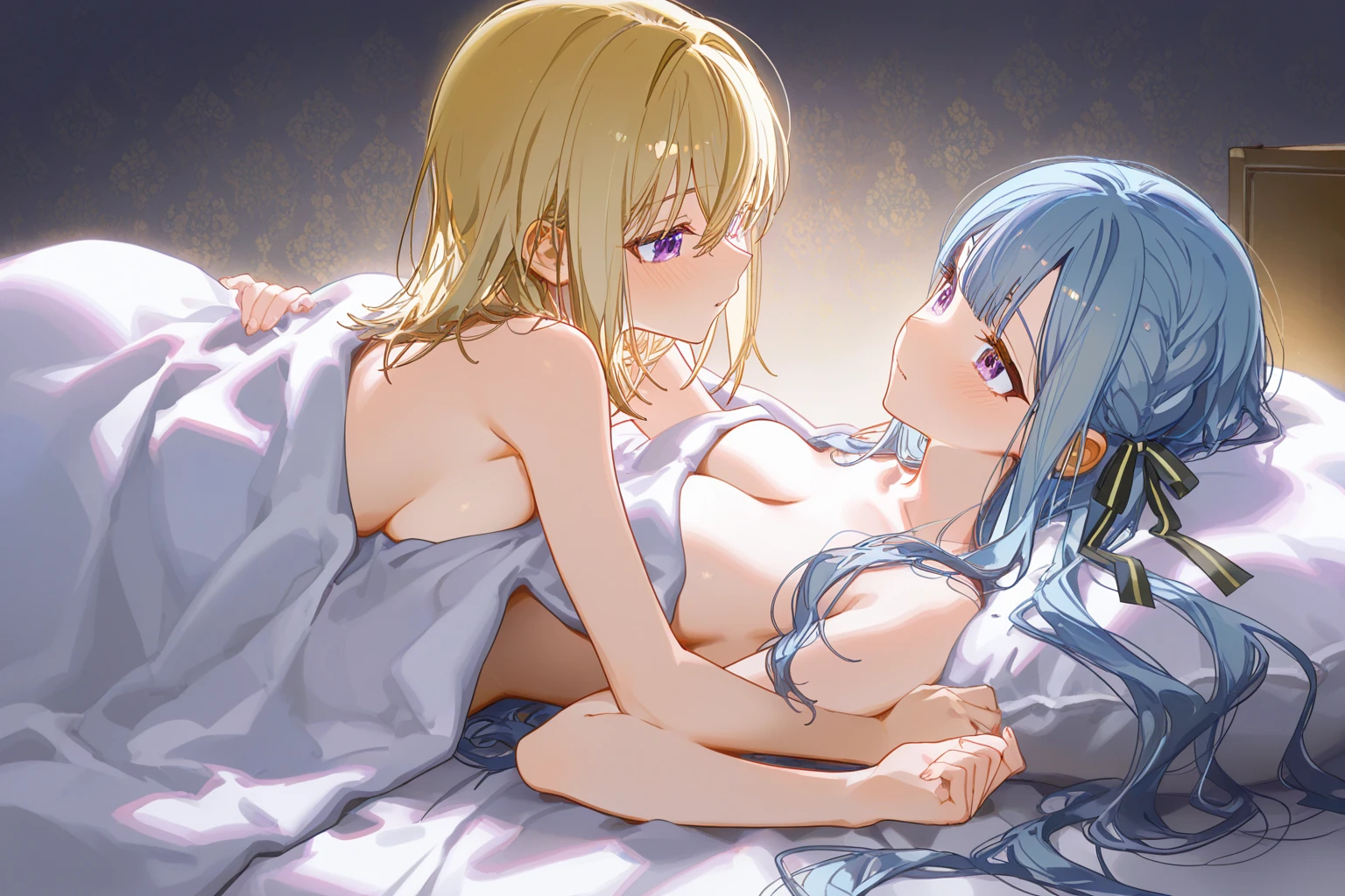 Keywords for couple images: Togawa Sakiko and Misumi Uika\10 Togawa Sakiko and Misumi Uika, short blonde hair, purple eyes, all of these must be included.
